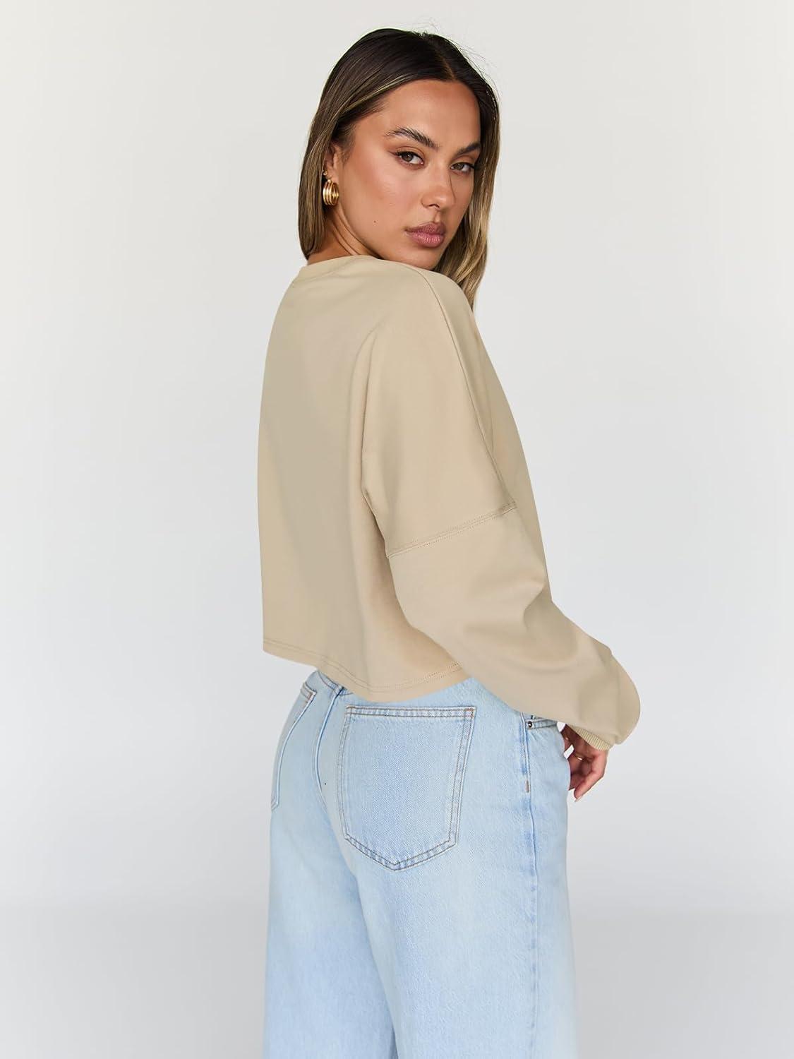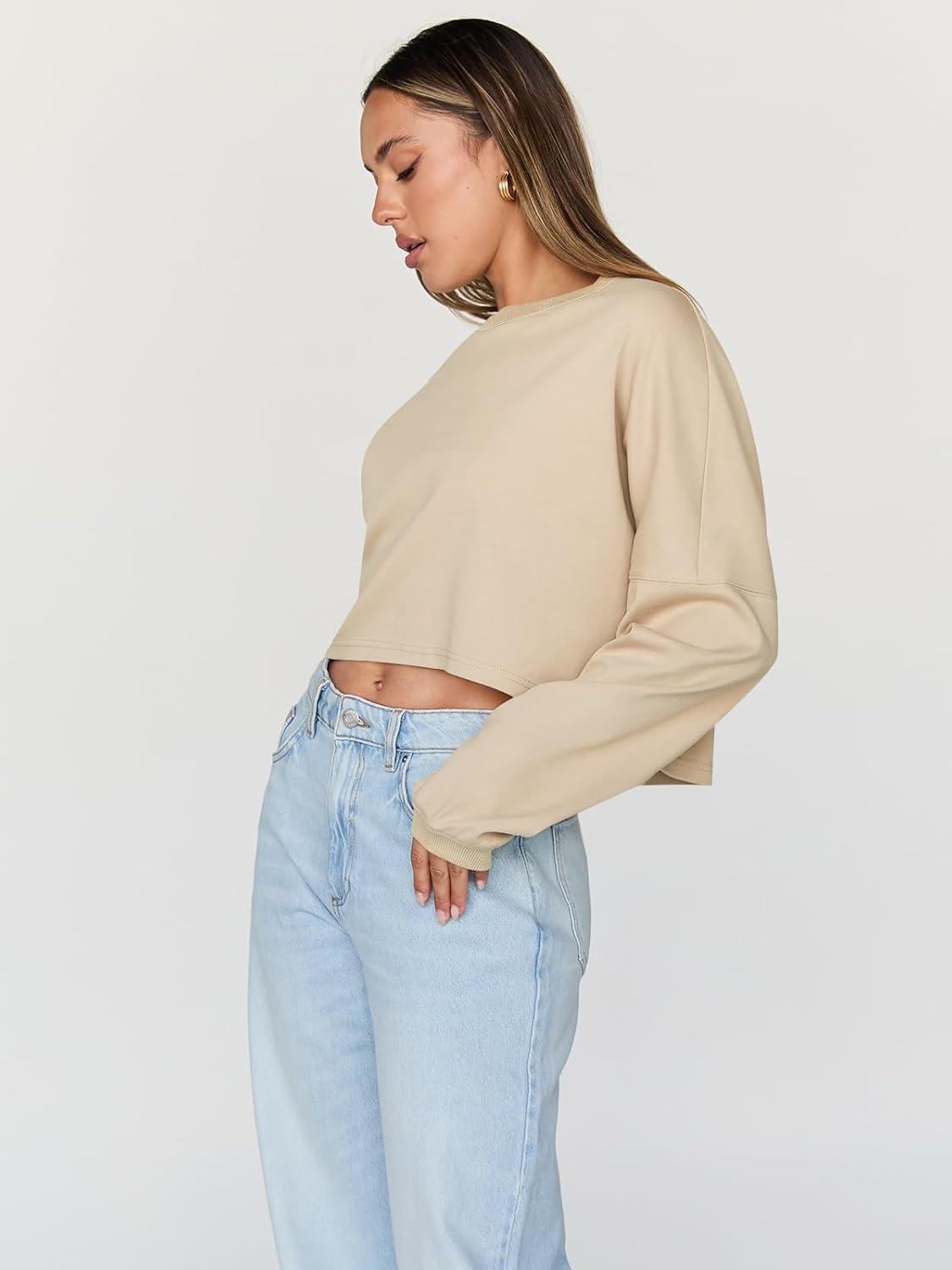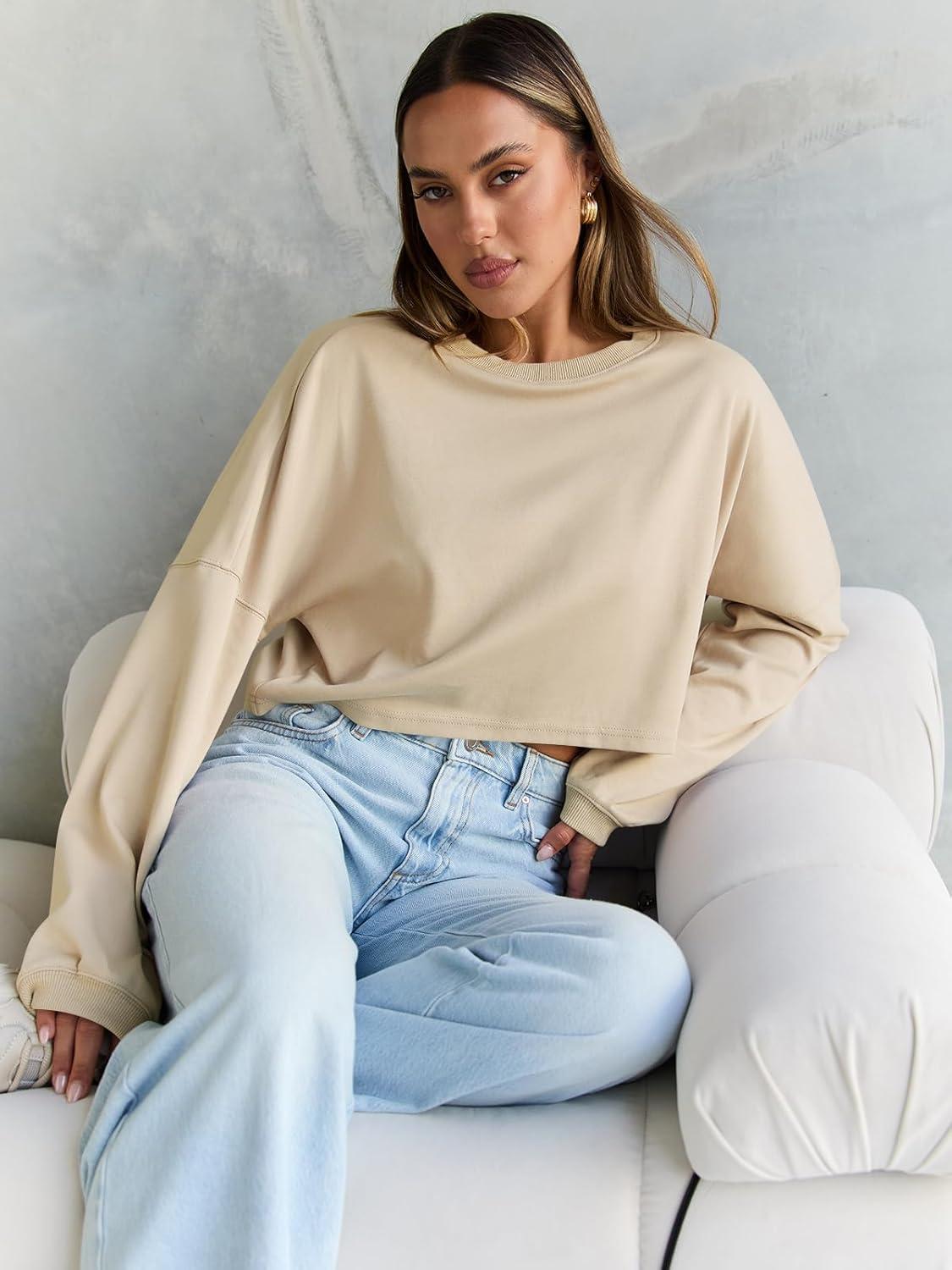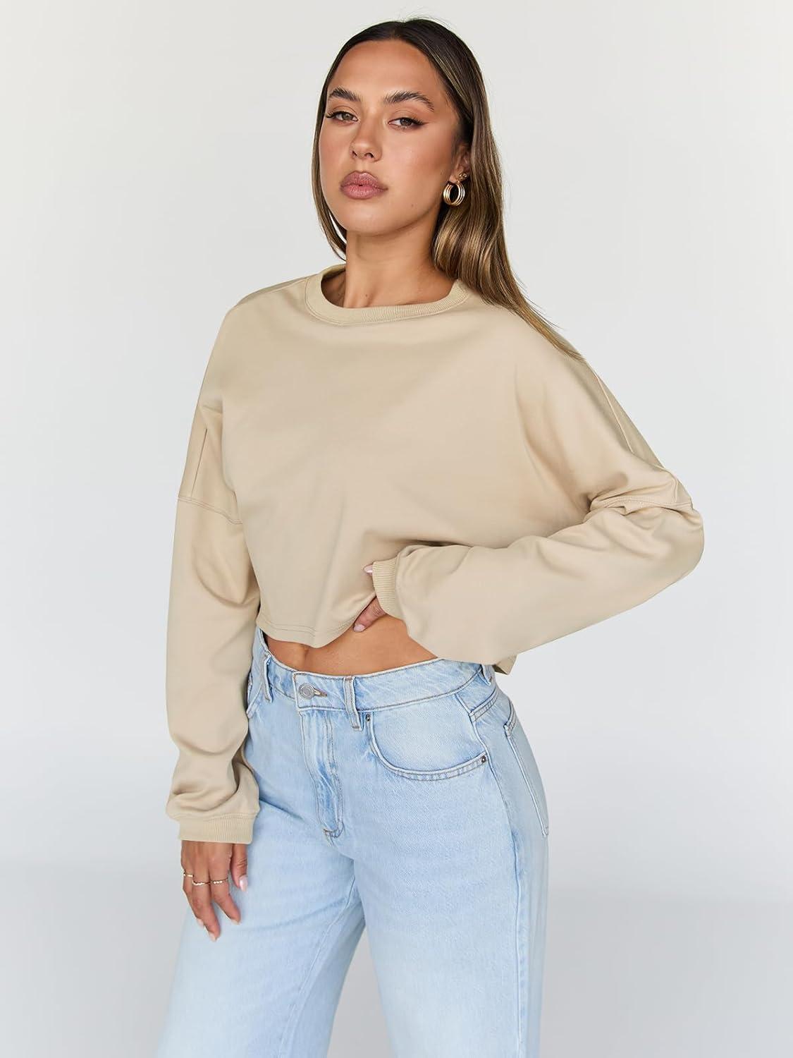 Trendy Queen Cropped Sweatshirts for Women Oversized Crewneck Sweaters Long Sleeve Tops Fall Winter Clothes 2025(Apricot)