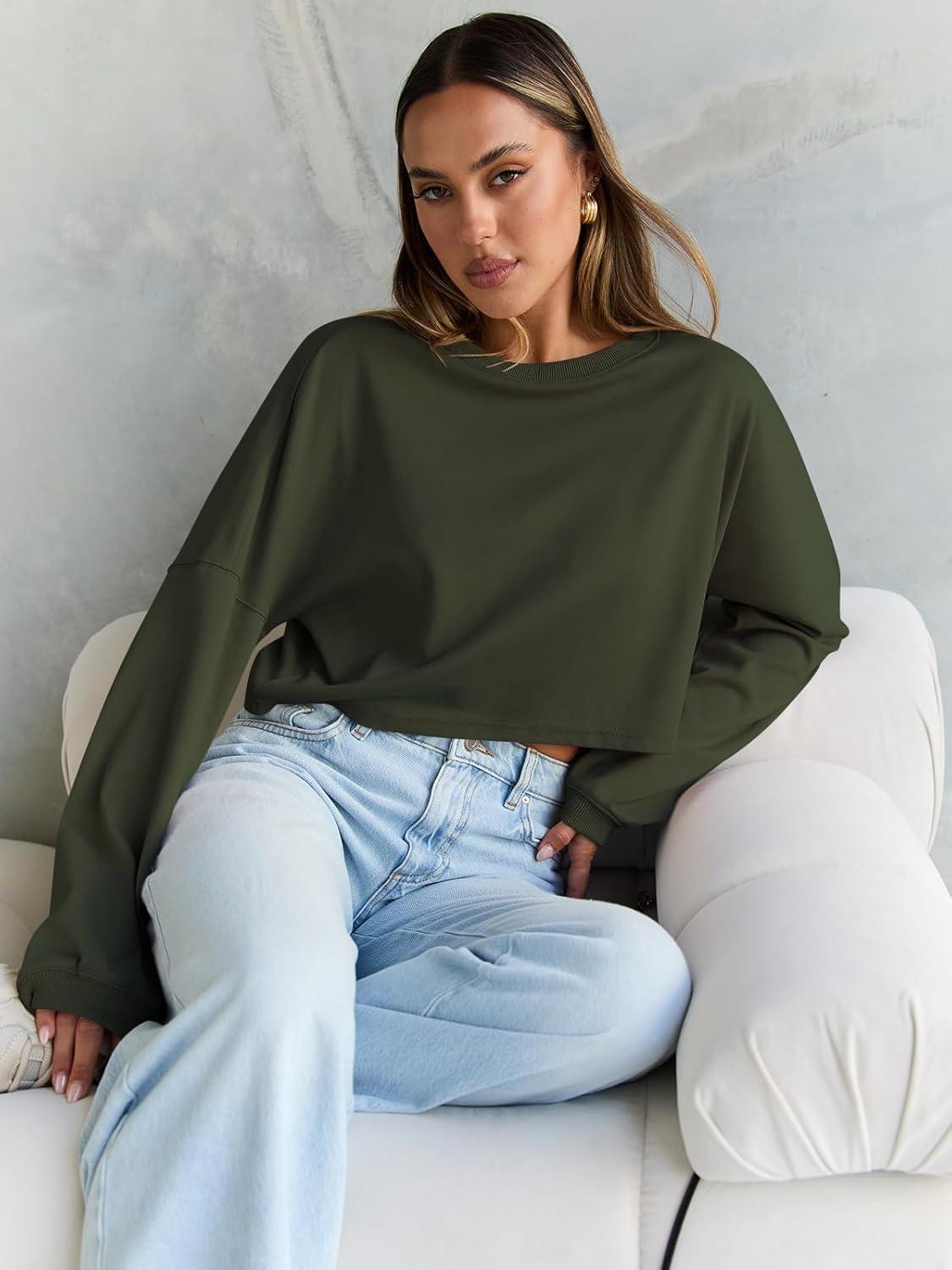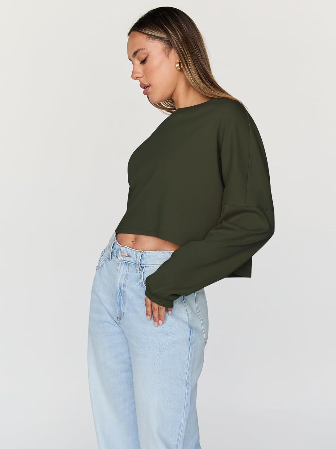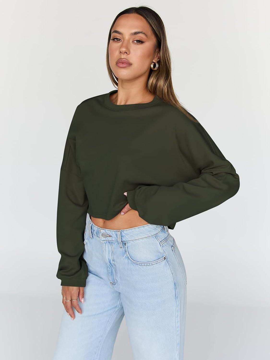 Trendy Queen Cropped Sweatshirts for Women Oversized Crewneck Sweaters Long Sleeve Tops Fall Winter Clothes 2025(Armygreen)