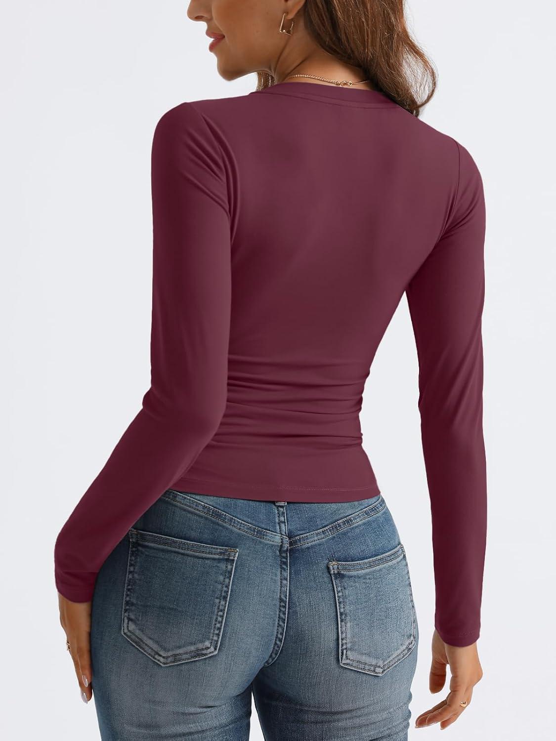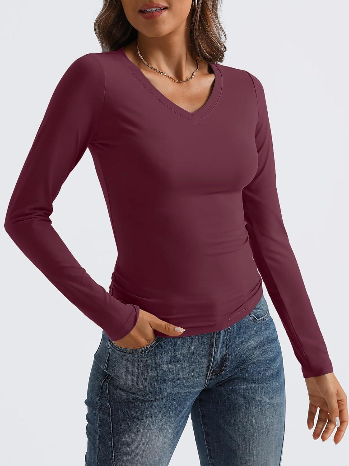 Score big savings on Trendy Queen Long Sleeve Shirts for Women 2025 Fall Fashion V Neck Basics Crop Tops Slim Fitted Y2K Tops Outfits Clothes(Wine Red) during our back-to-school sale. Limited quantities available.