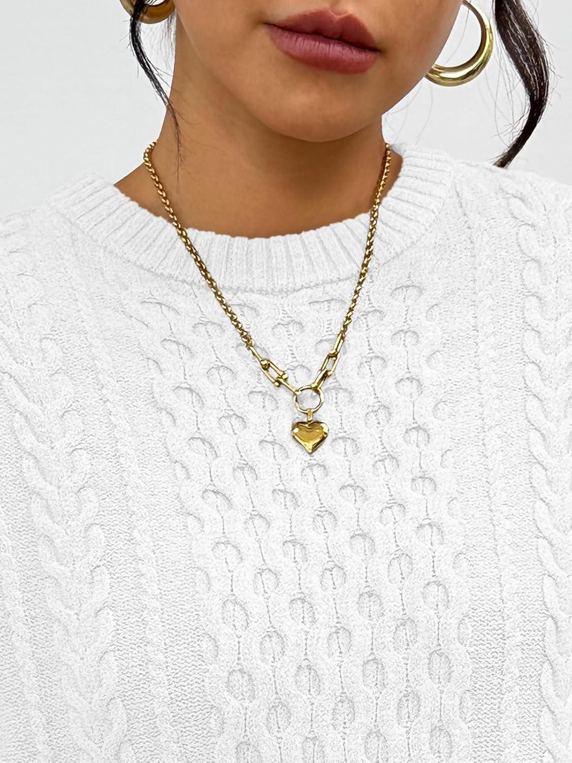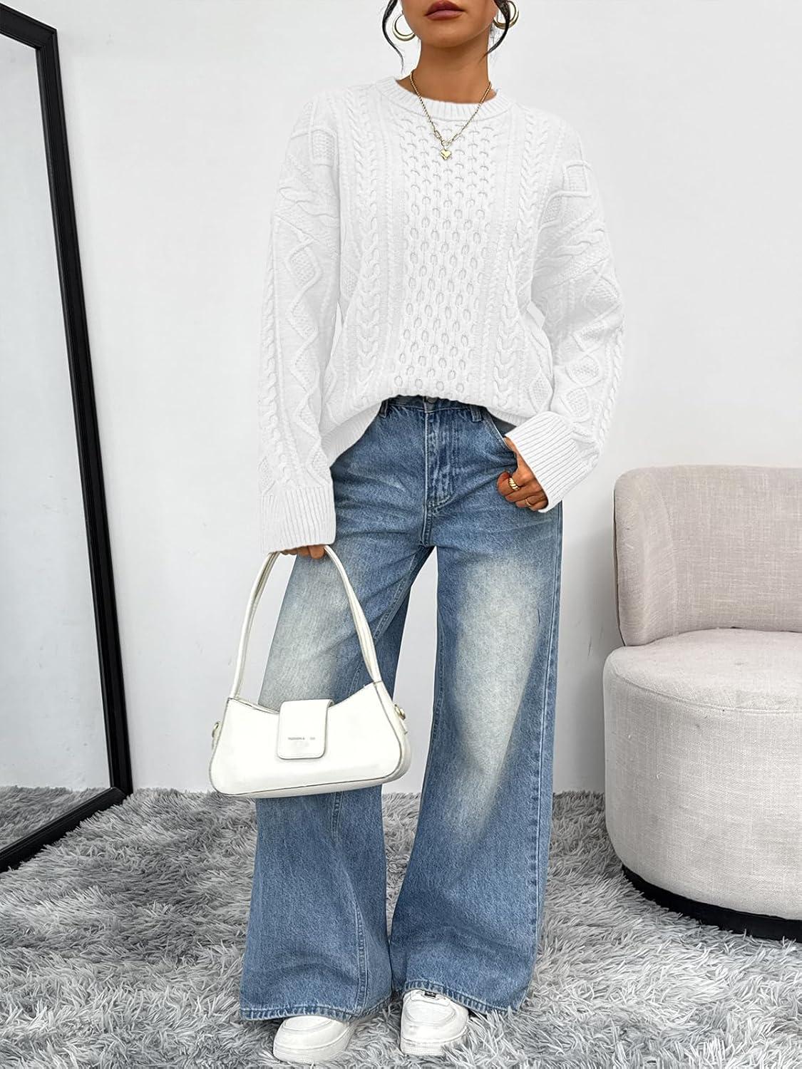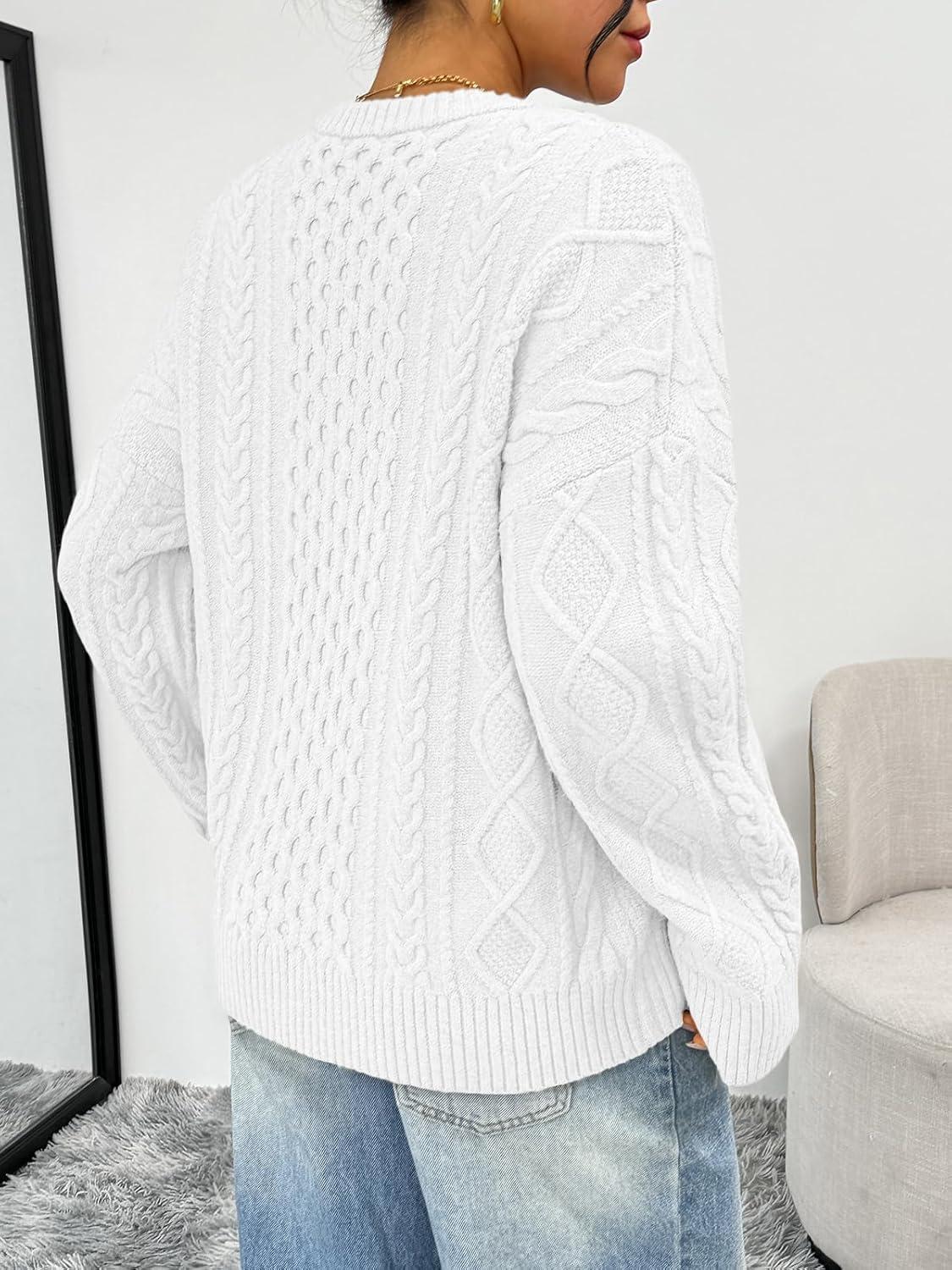 Trendy Queen Oversized Cable Knit Sweaters for Women Trendy 2025 Fall Fashion Outfits Pullover Crewneck Sweaters Tops(White)