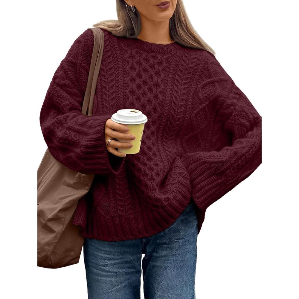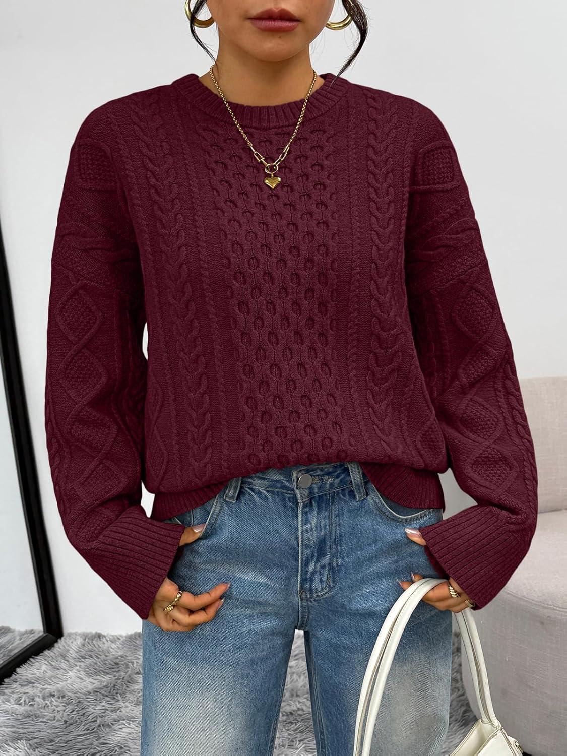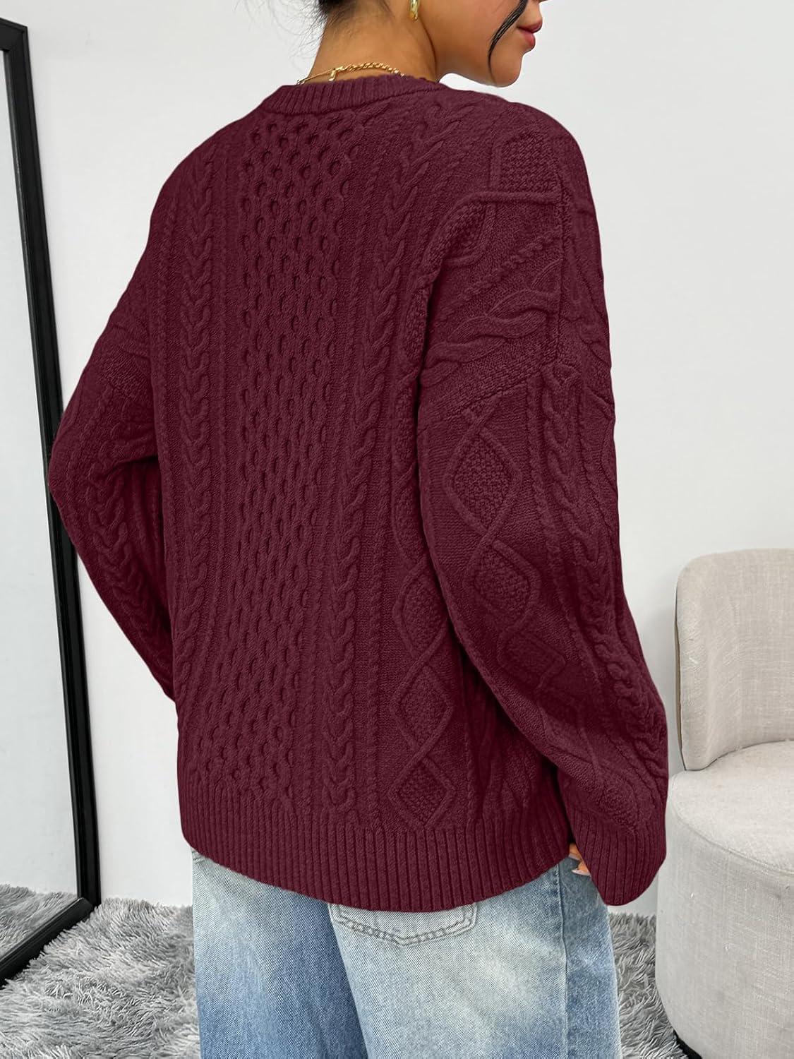 Trendy Queen Oversized Cable Knit Sweaters for Women Trendy 2025 Fall Fashion Outfits Pullover Crewneck Sweaters Tops(Wine Red)