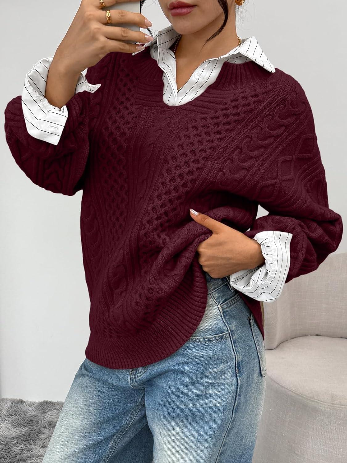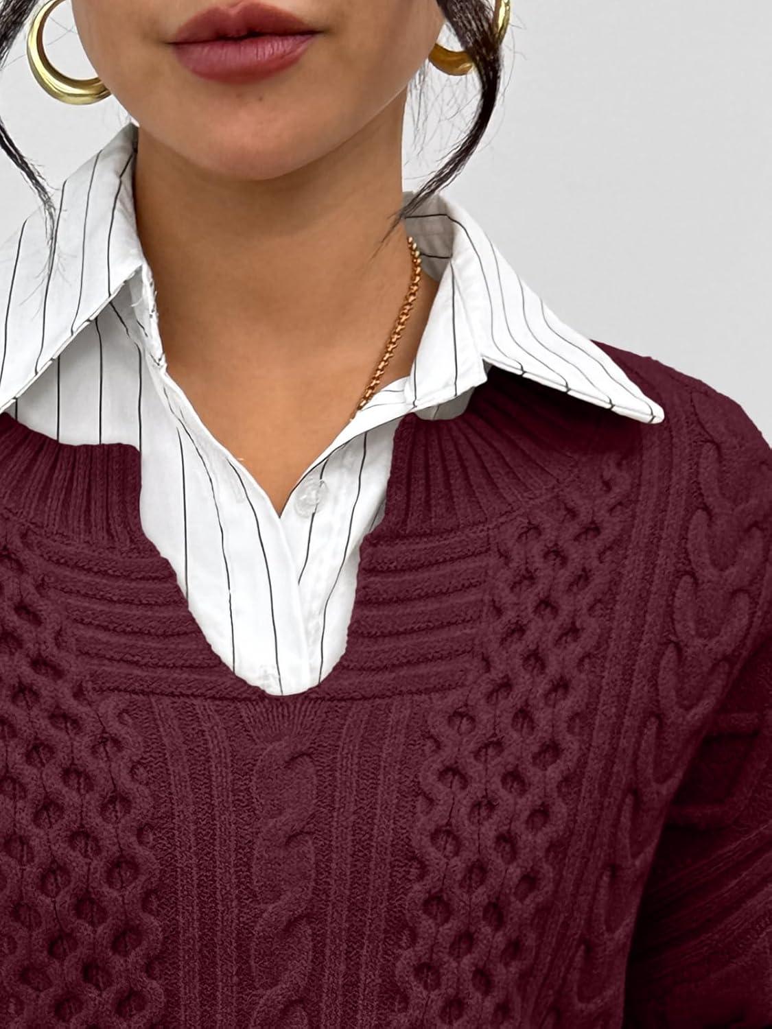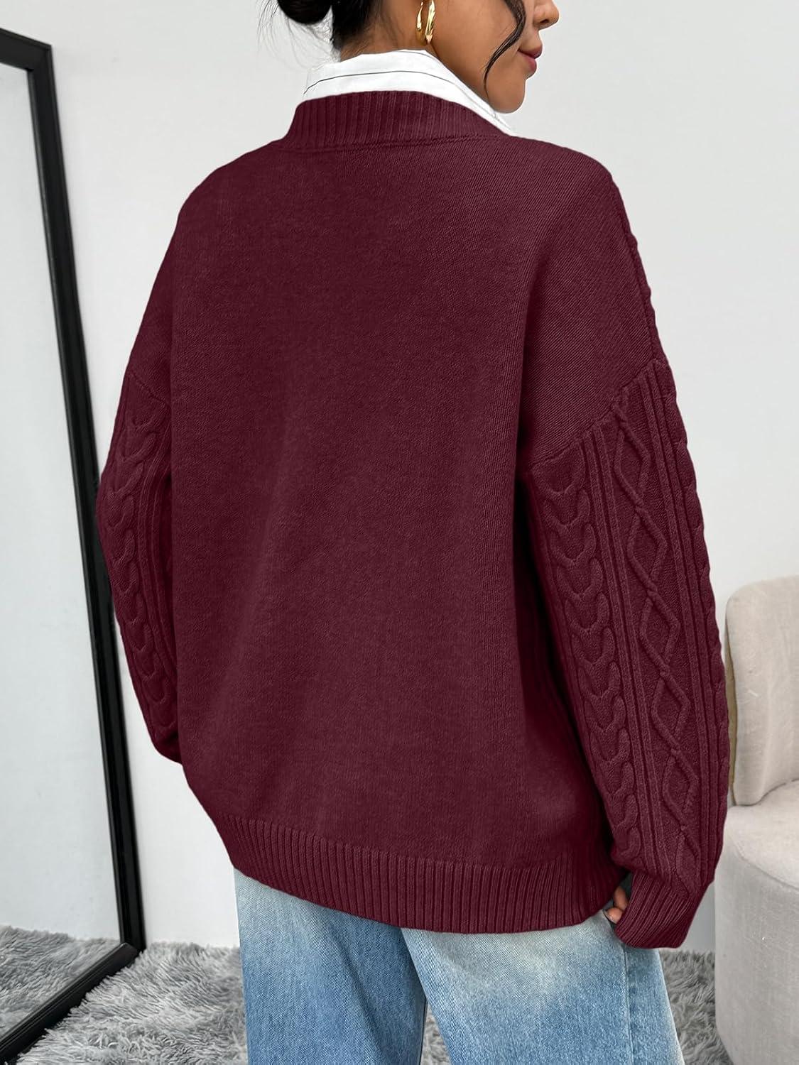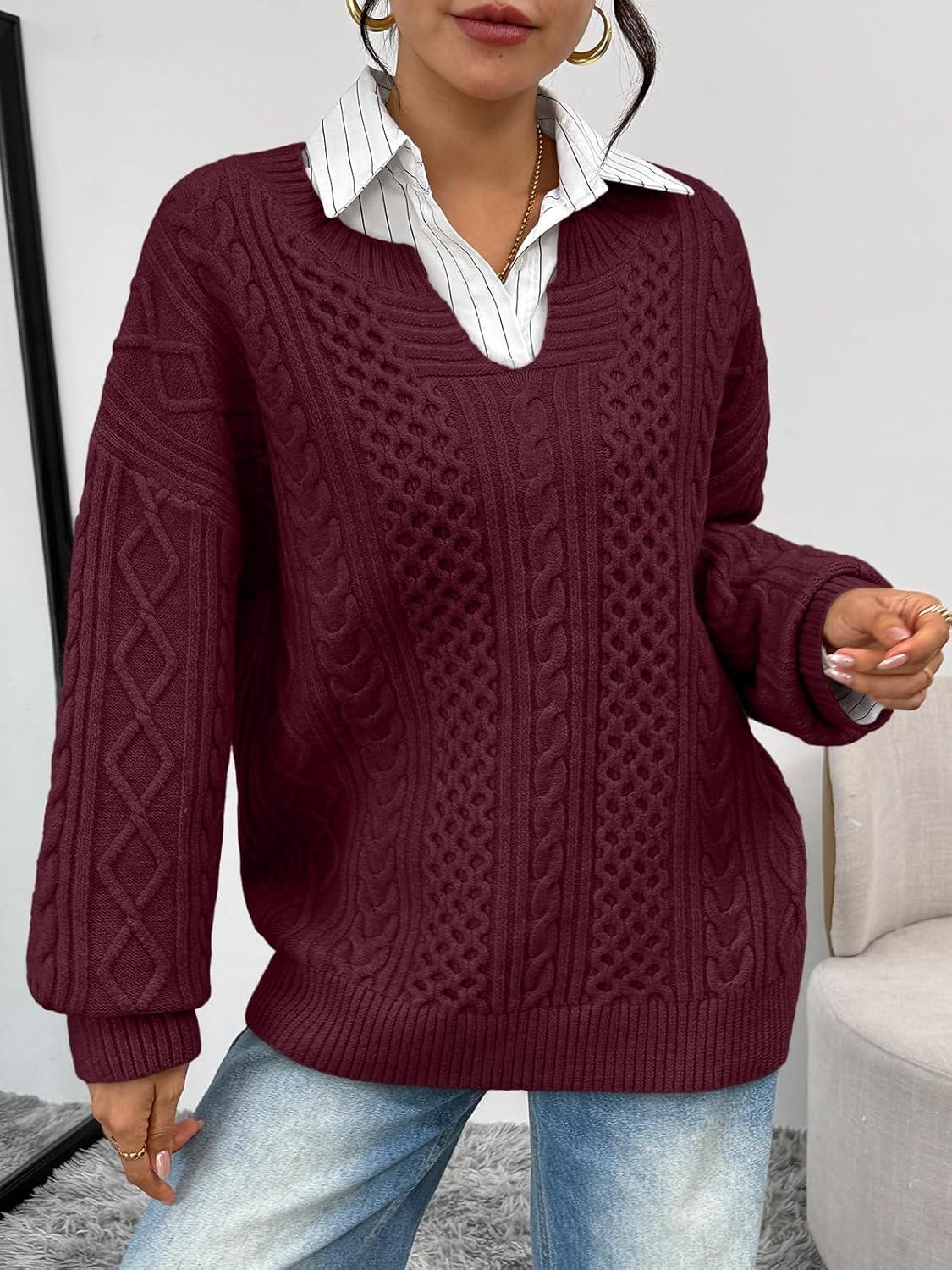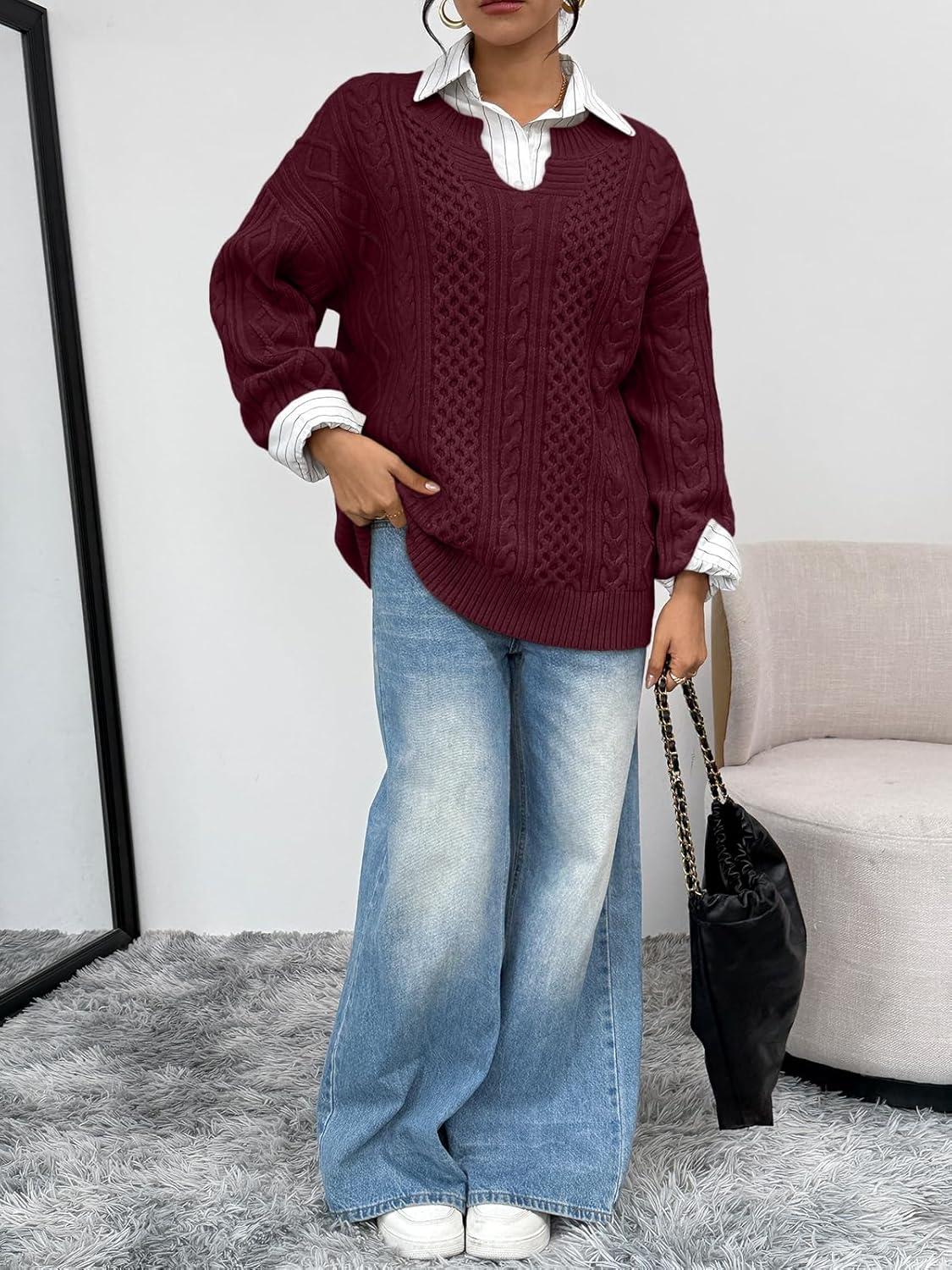 Trendy Queen V Neck Oversized Cable Knit Sweaters for Women Trendy 2025 Fall Fashion Outfits Clothes Winter Clothing(Wine)