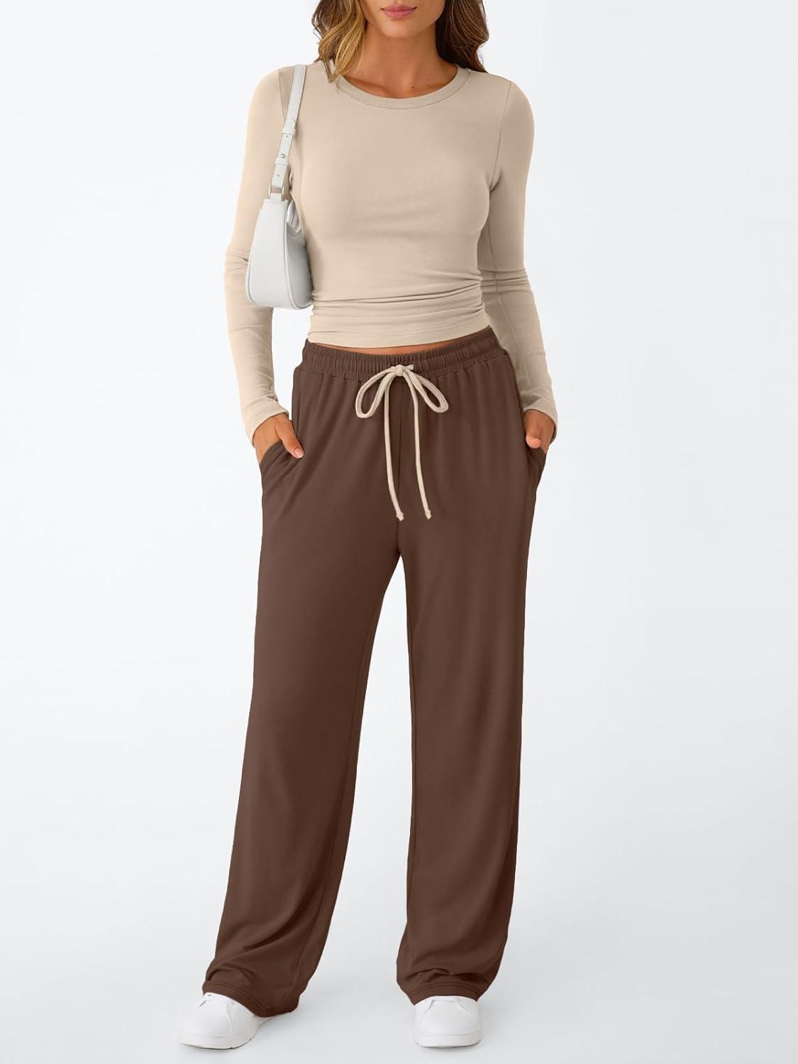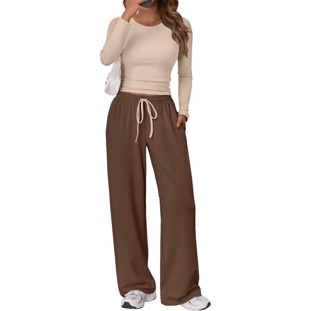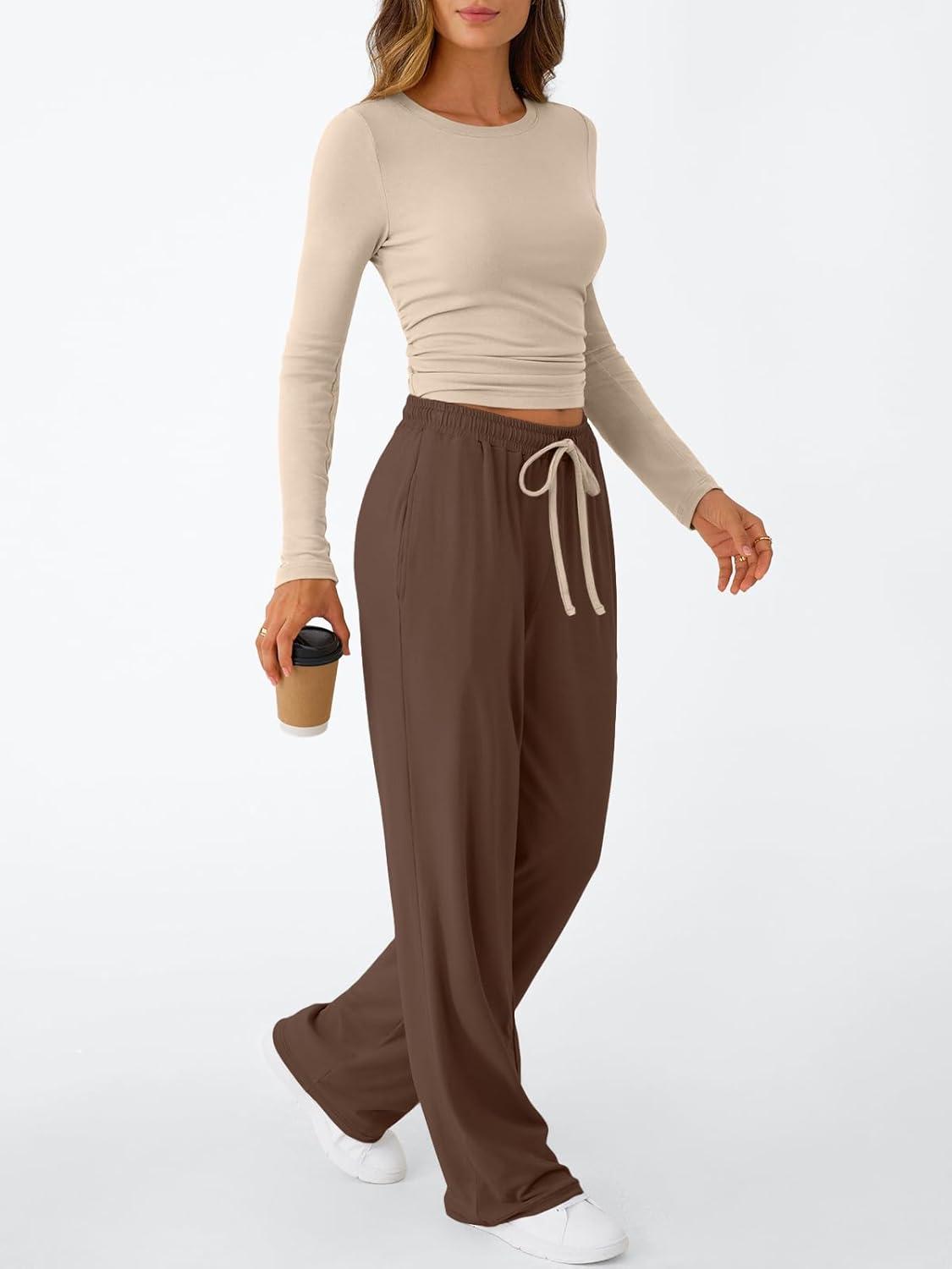 Trendy Queen Women’s 2 Piece Matching Lounge Set Long Sleeve Slightly Crop Top Wide Leg Pants Casual Sweatsuit(Beige Coffee)