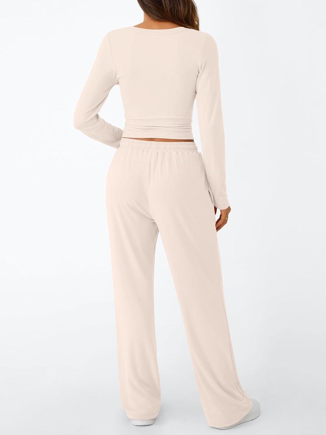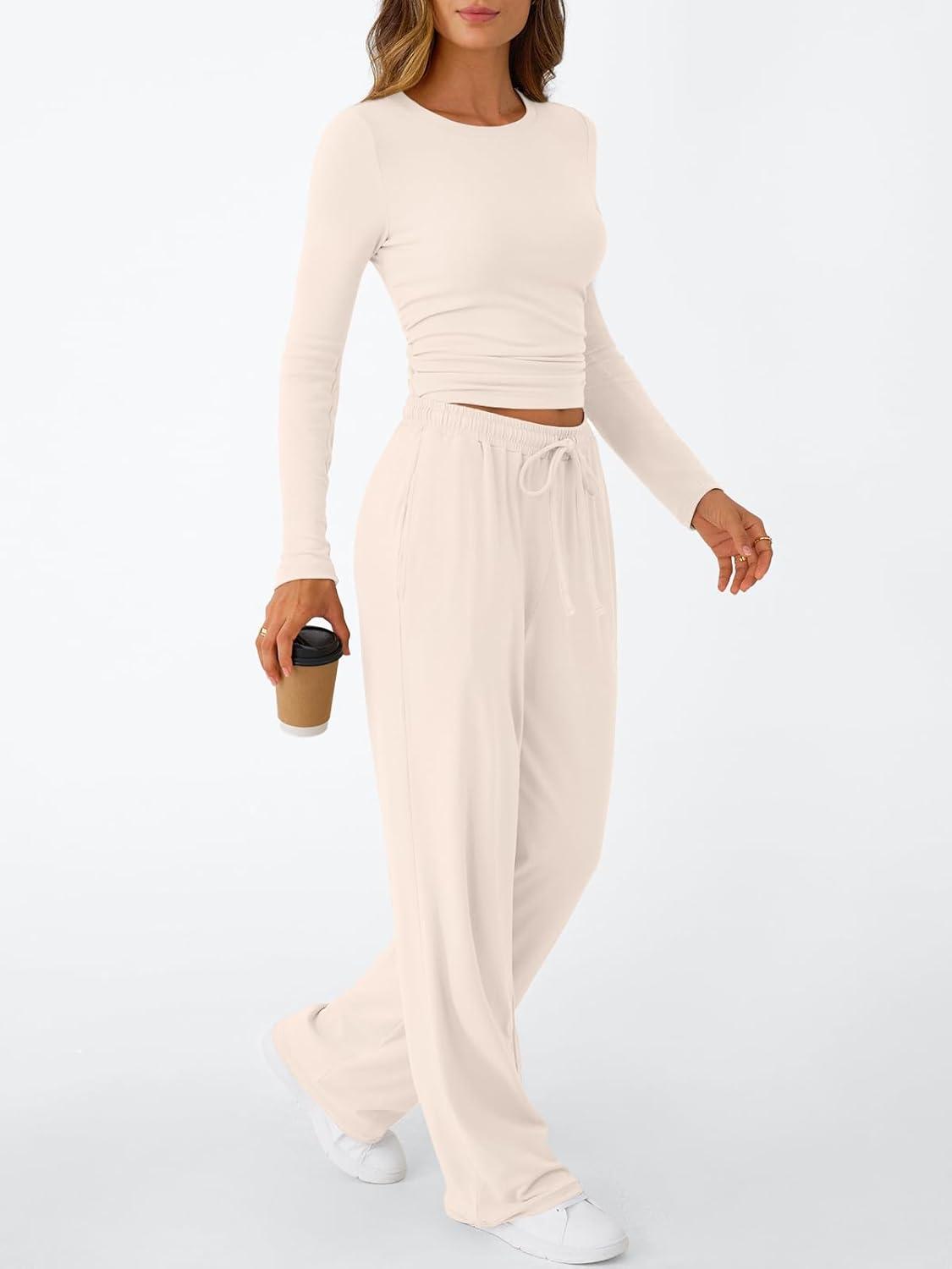Trendy Queen Women’s 2 Piece Matching Lounge Set Long Sleeve Slightly Crop Top Wide Leg Pants Casual Sweatsuit(Beige)