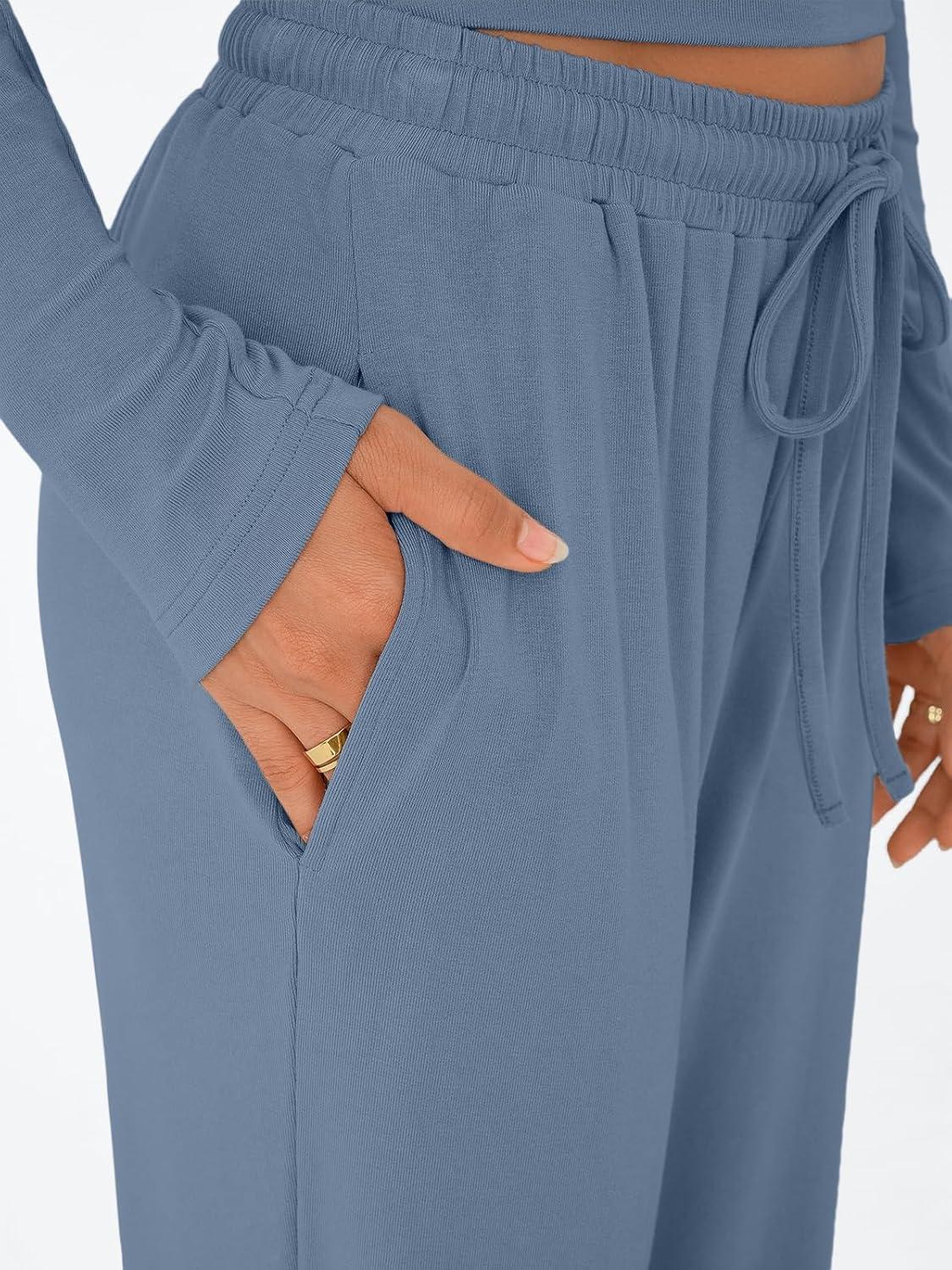 Trendy Queen Women’s 2 Piece Matching Lounge Set Long Sleeve Slightly Crop Top Wide Leg Pants Casual Sweatsuit(Dusty Blue)