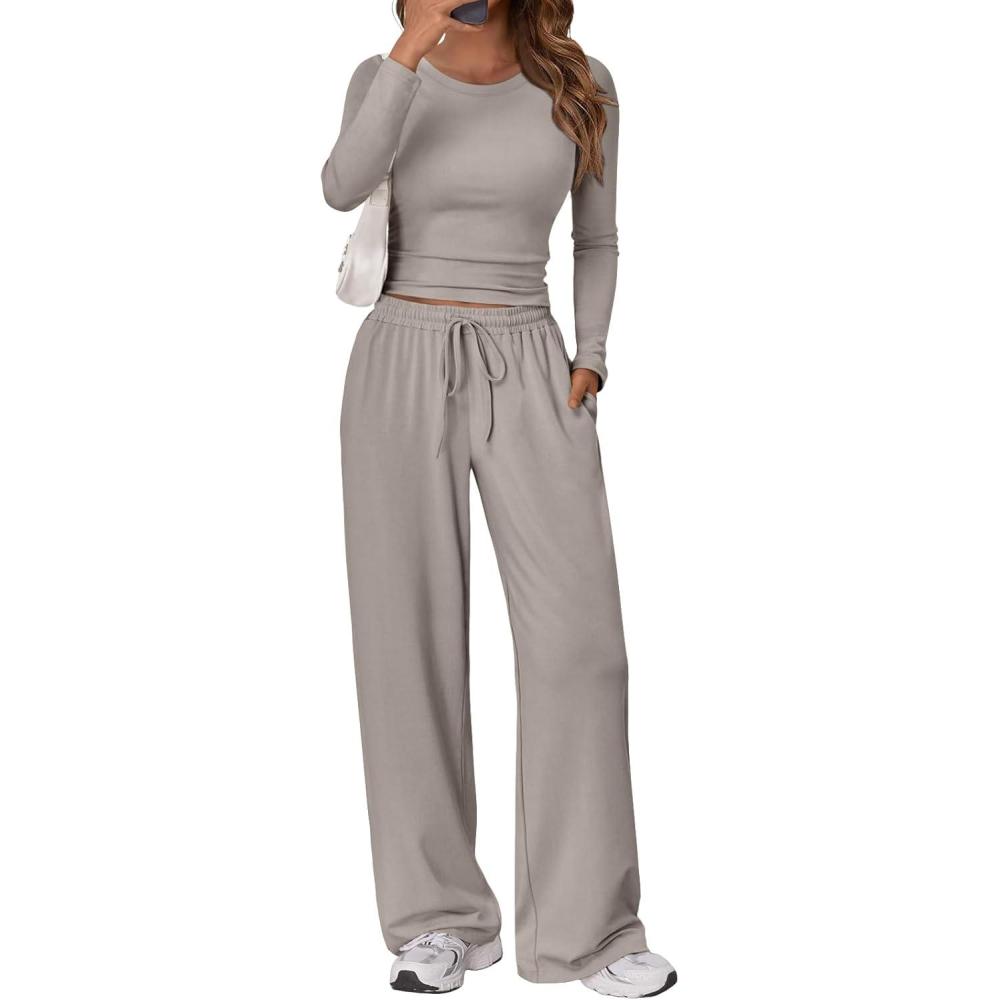 Trendy Queen Women’s 2 Piece Matching Lounge Set Long Sleeve Slightly Crop Top Wide Leg Pants Casual Sweatsuit(Smoke)