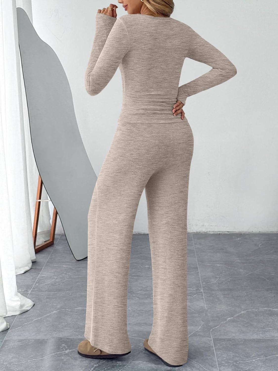 Trendy Queen Women’s 2 Piece Matching Lounge Sets Fall Fashion Outfits Henley Neck Sweater Top Wide Leg Pants Sweat Suits(Khaki)