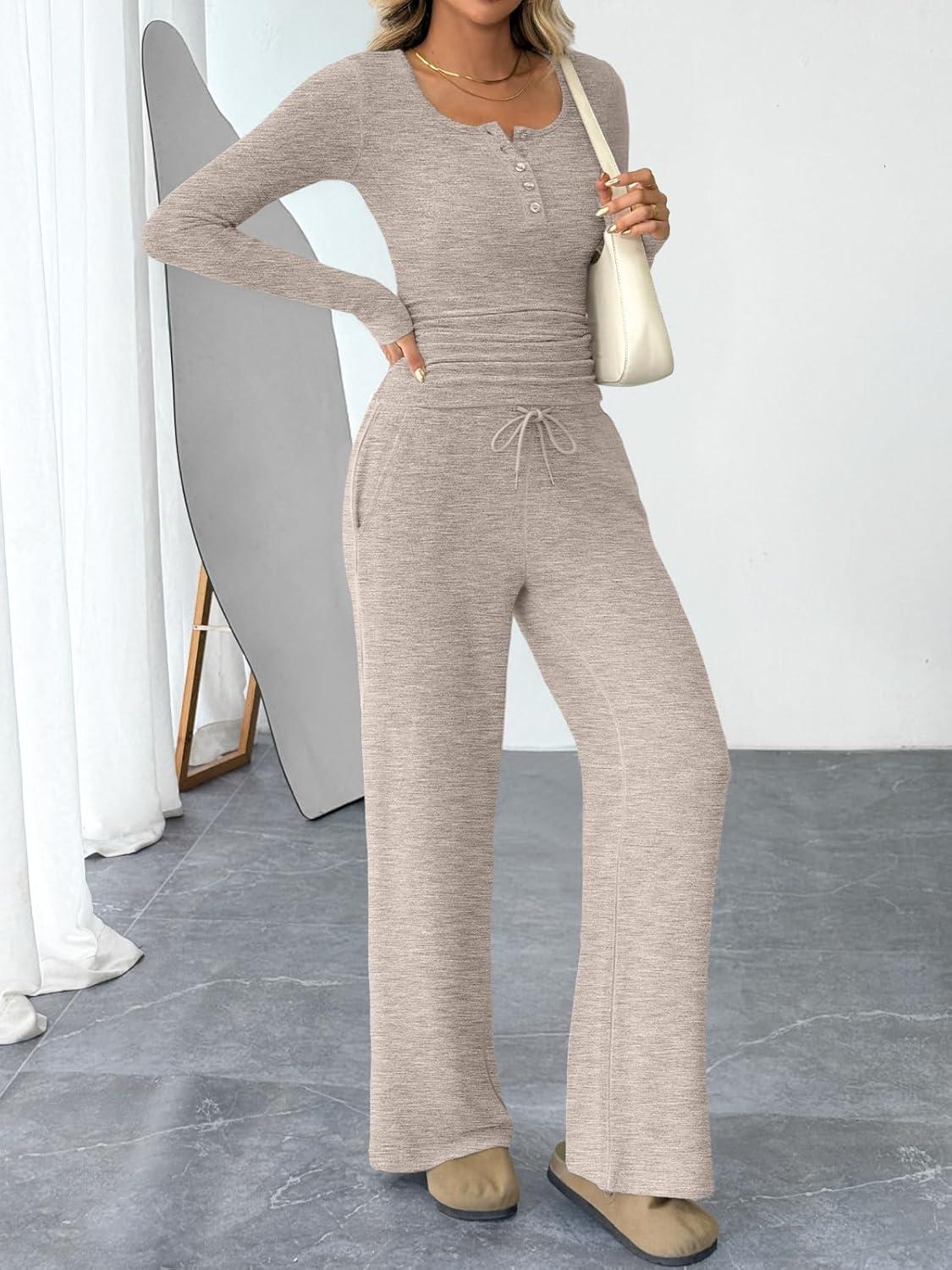 Save up to 40% on Trendy Queen Women’s 2 Piece Matching Lounge Sets Fall Fashion Outfits Henley Neck Sweater Top Wide Leg Pants Sweat Suits(Khaki) styles during our end-of-season sale.