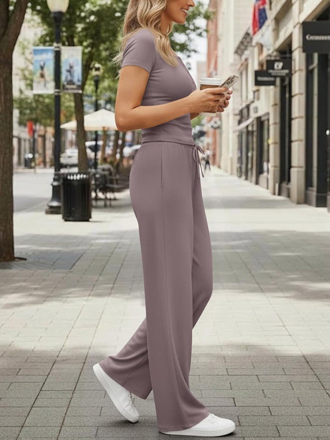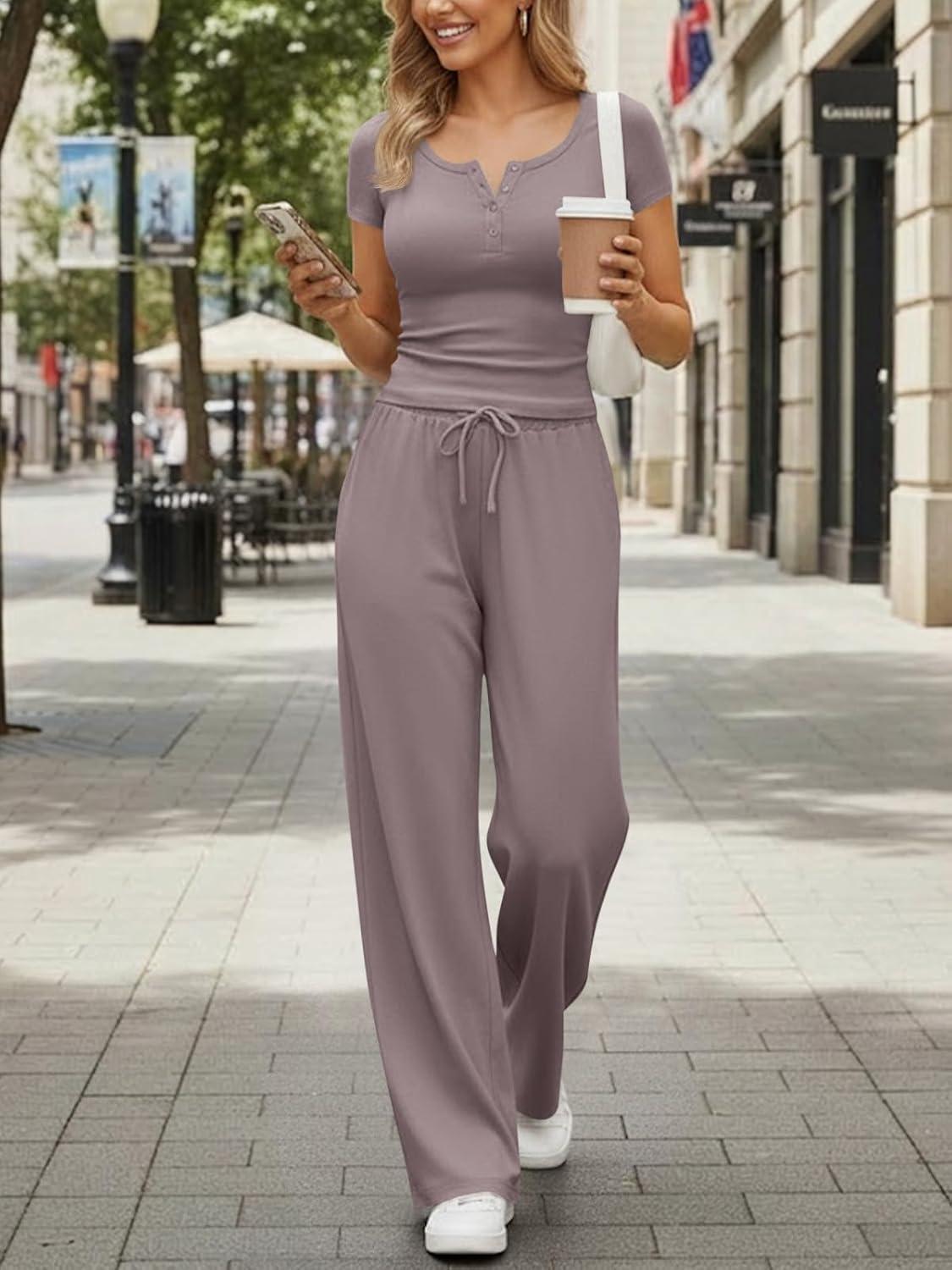 imageTrendy Queen Womens 2 Piece Matching Lounge Sets Summer Henley Neck Slightly Crop Top Wide Leg Pants Casual Sweat SuitSmoke