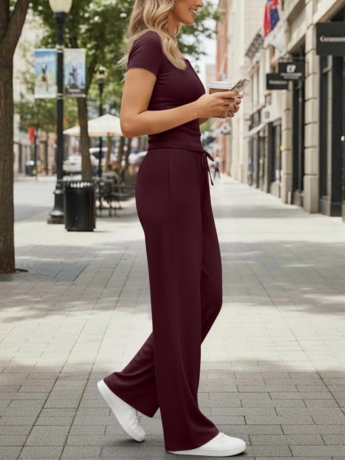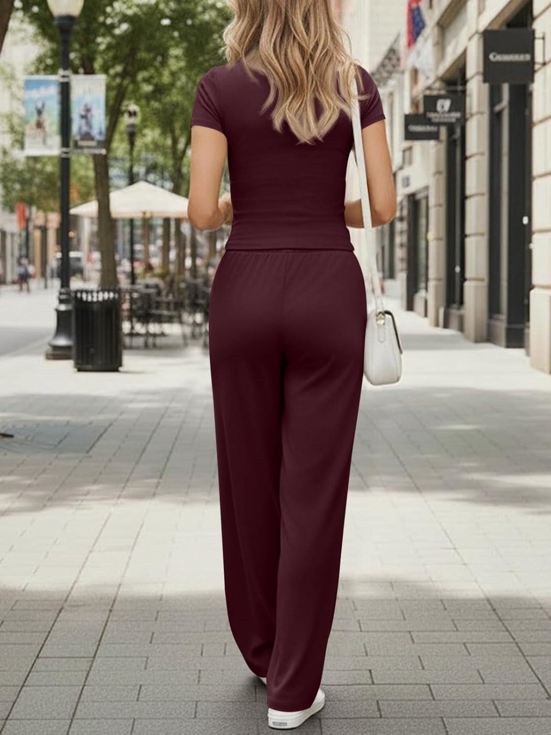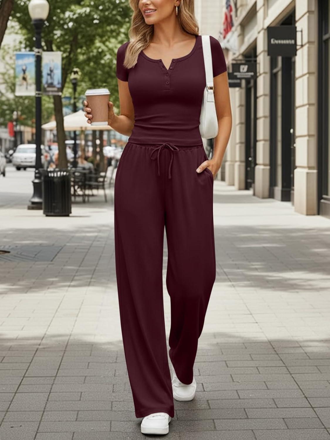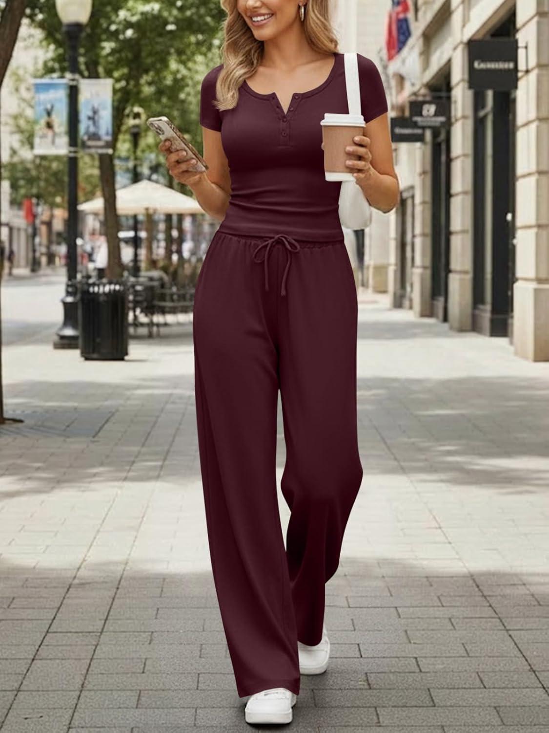 Trendy Queen Women’s 2 Piece Matching Lounge Sets Summer Henley Neck Slightly Crop Top Wide Leg Pants Casual Sweat Suit(Wine Red)