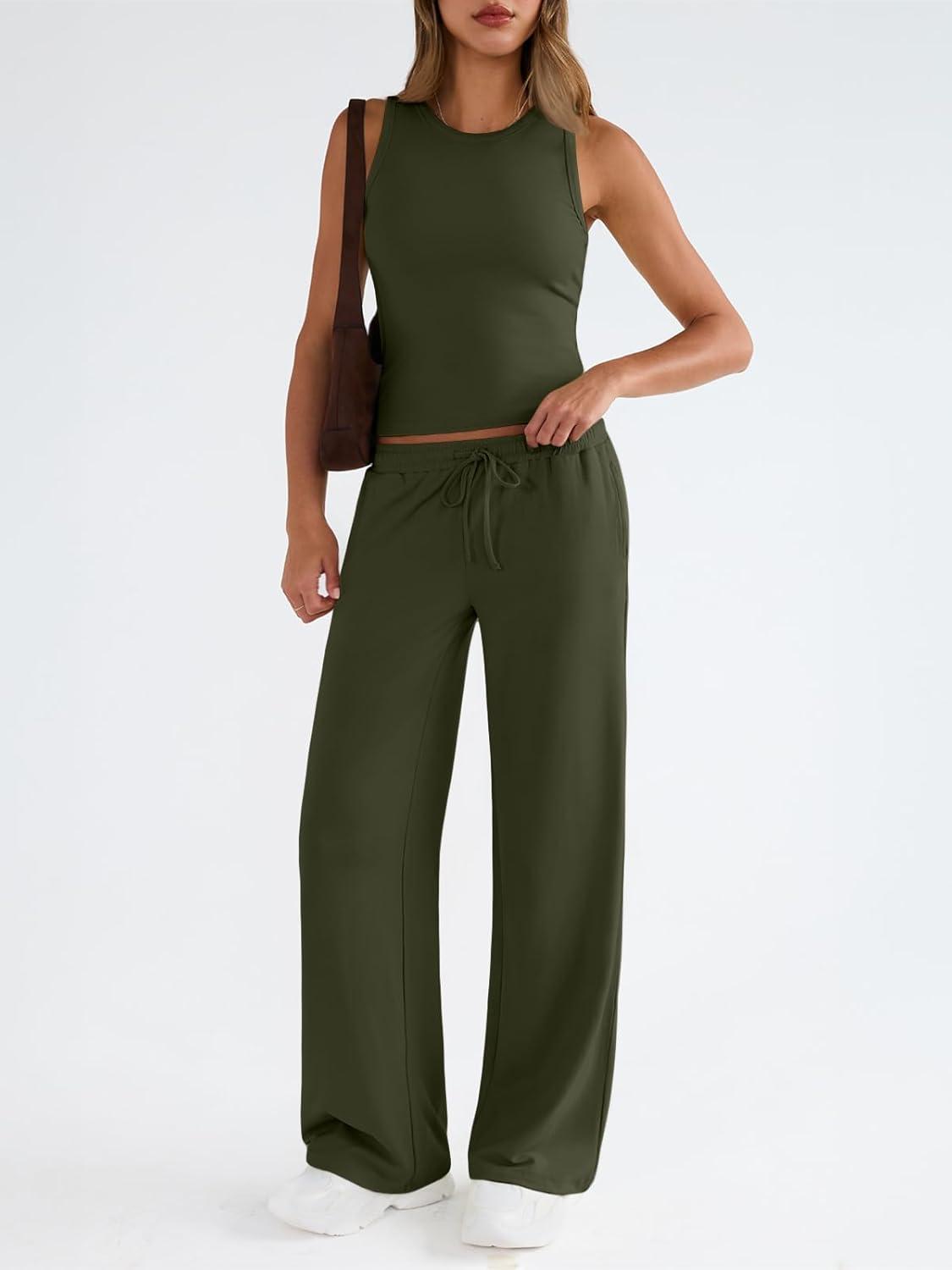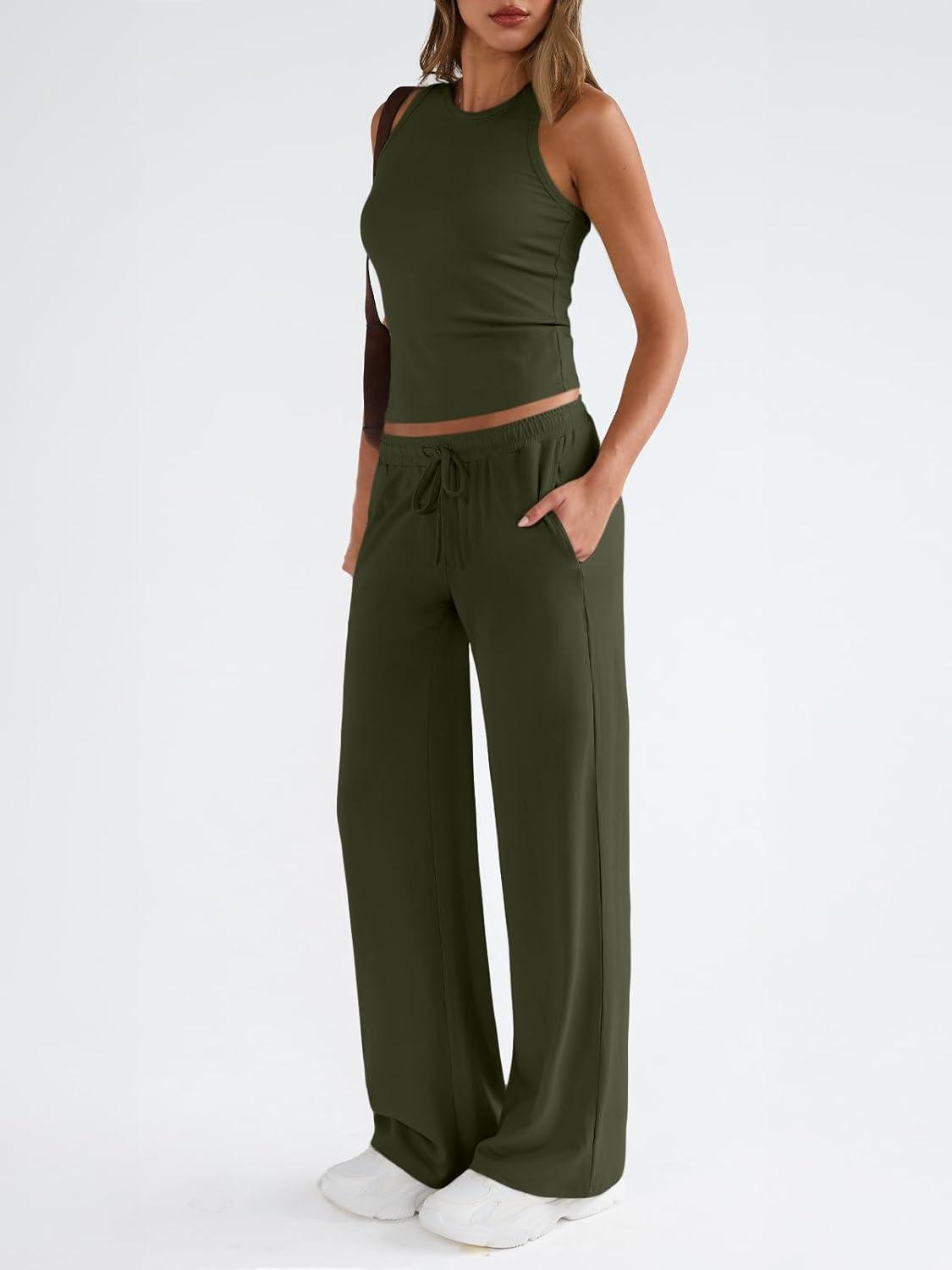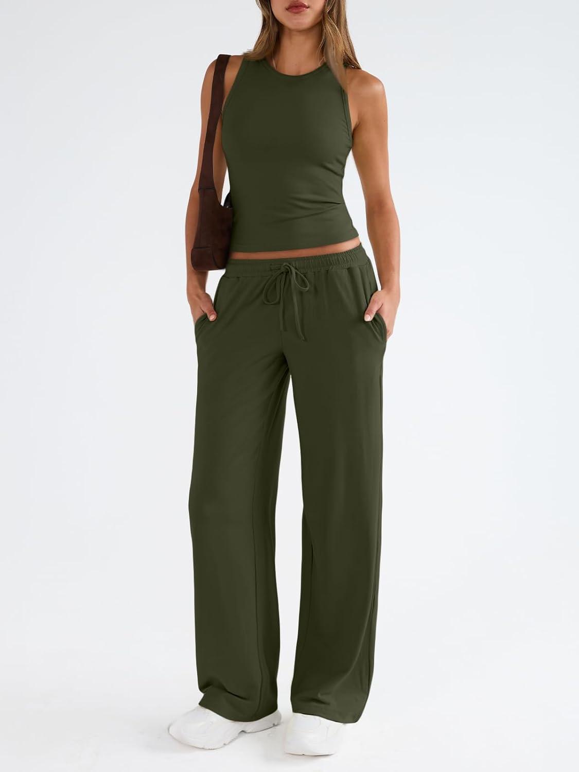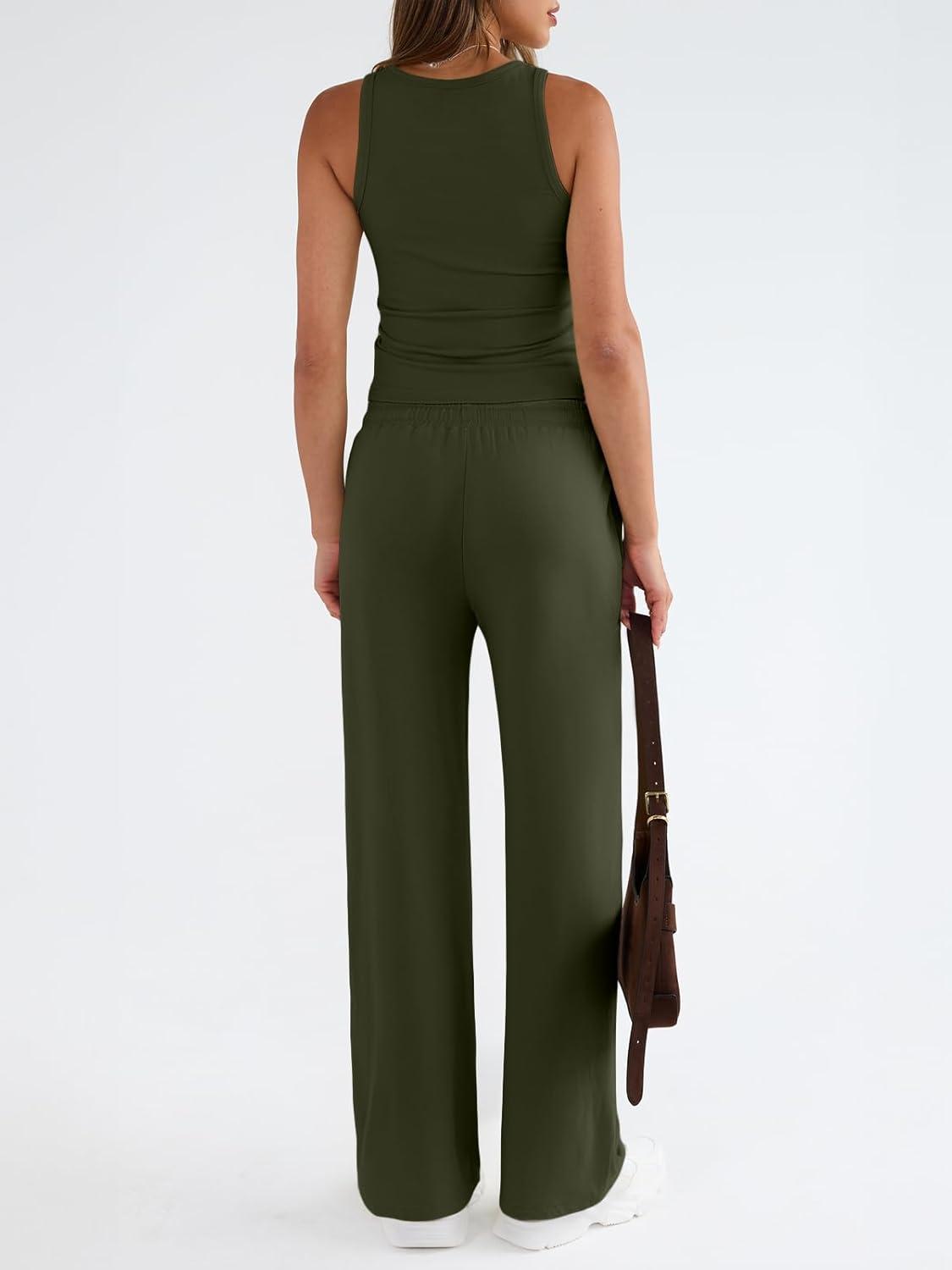 Trendy Queen Womens 2 Piece Outfits Sweatsuit Lounge Sets Sleeveless Tank Tops Summer Vacation Wide Leg Pants Tracksuits(Army Green)