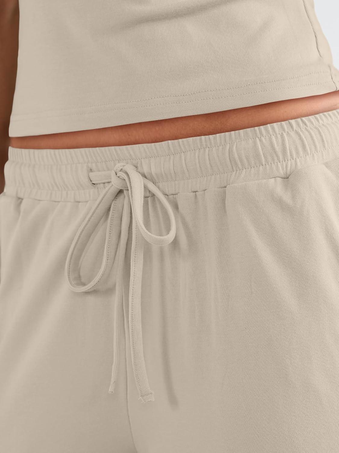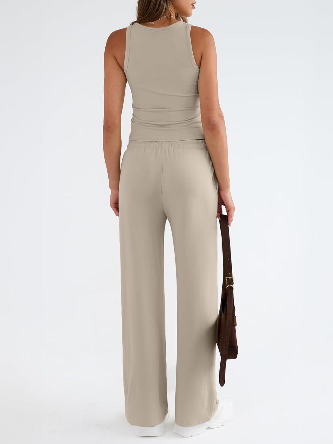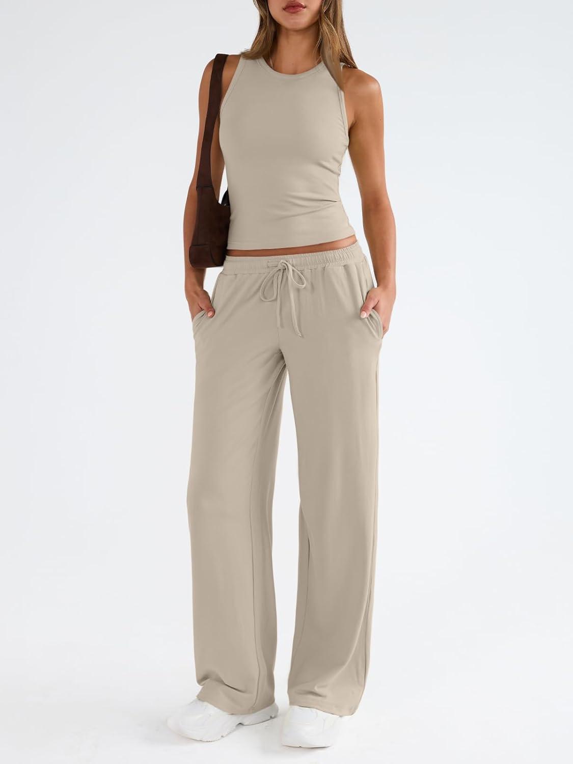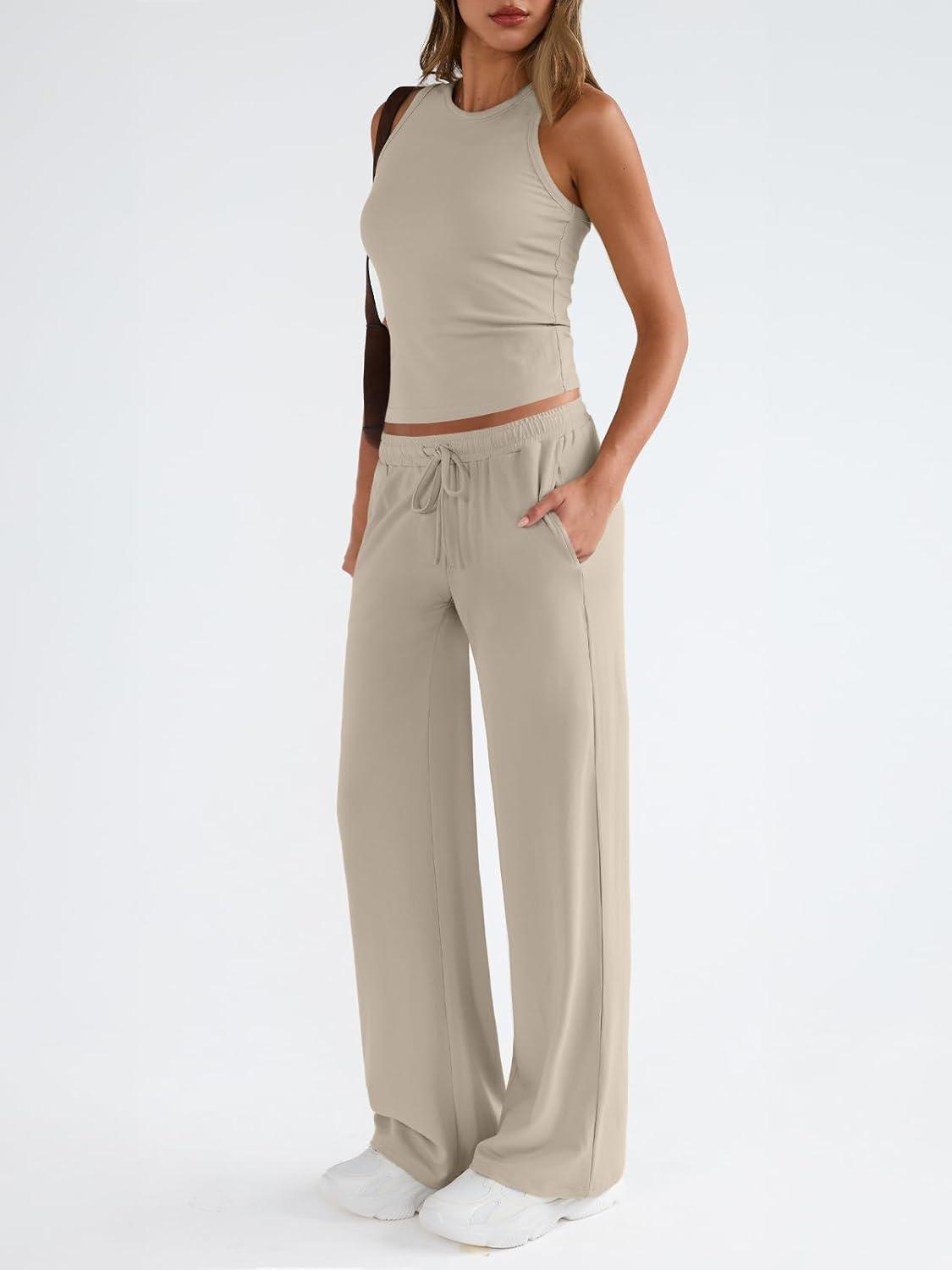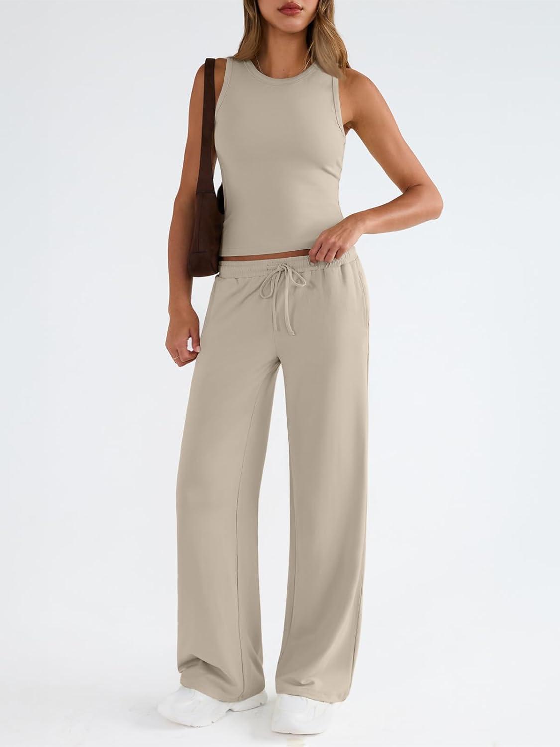 Trendy Queen Womens 2 Piece Outfits Sweatsuit Lounge Sets Sleeveless Tank Tops Summer Vacation Wide Leg Pants Tracksuits(Beige)