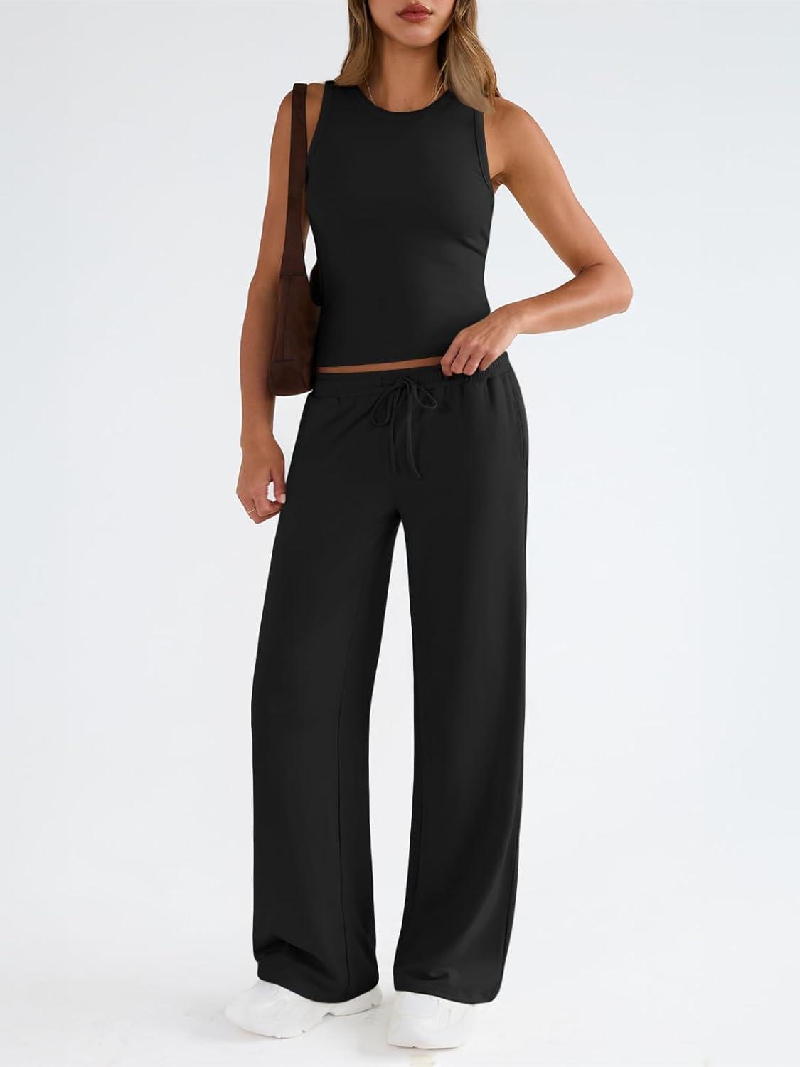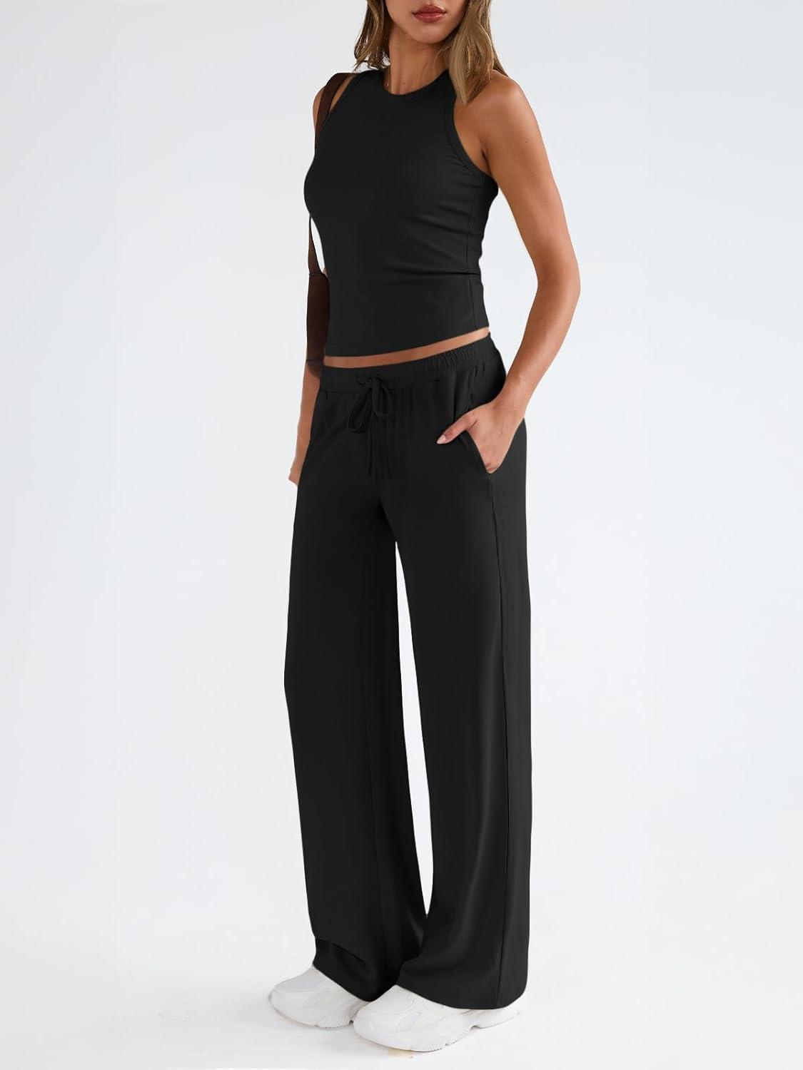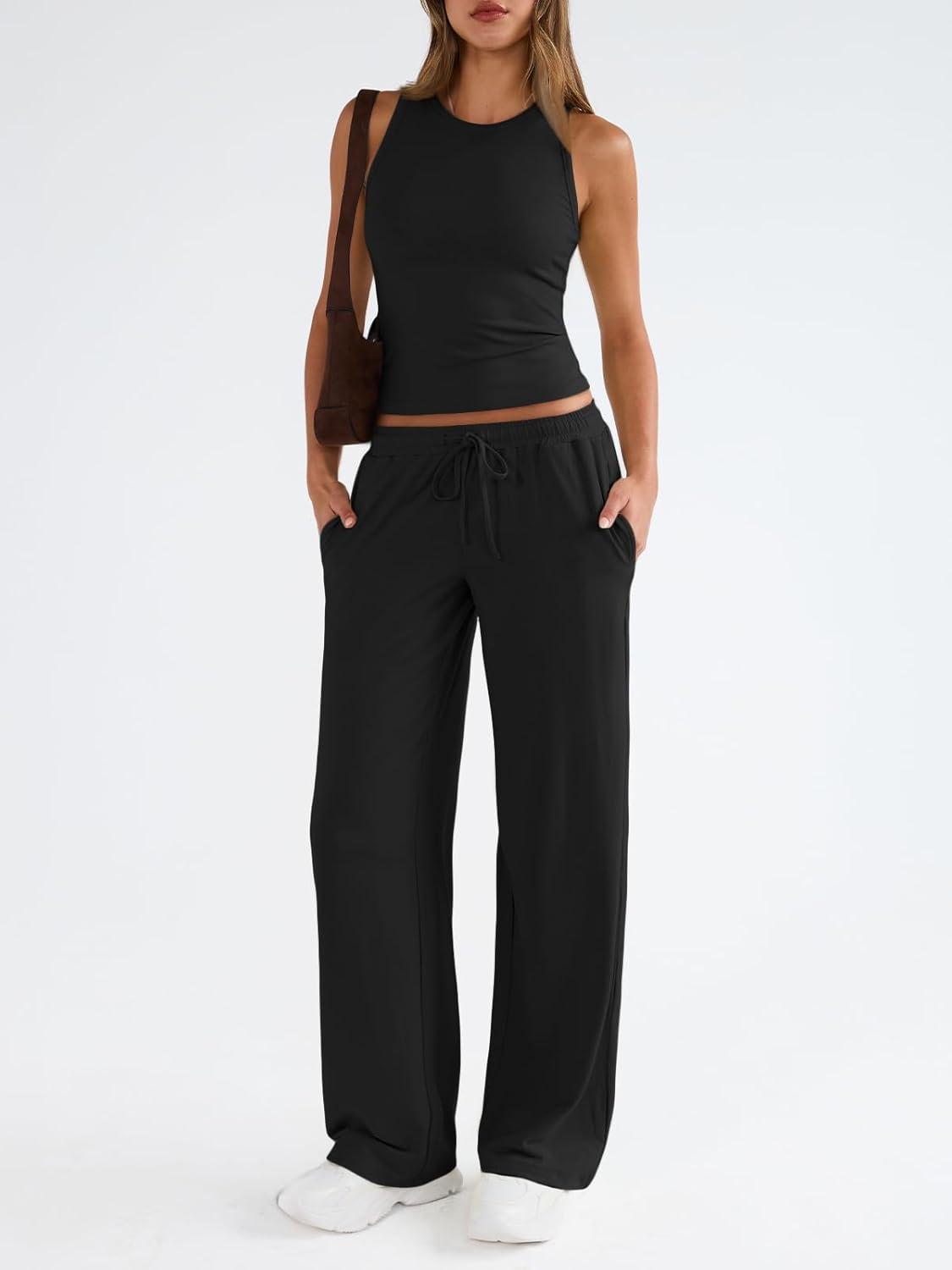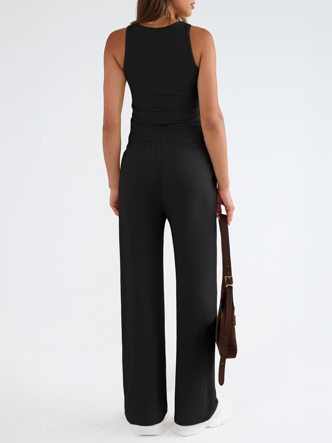Trendy Queen Womens 2 Piece Outfits Sweatsuit Lounge Sets Sleeveless Tank Tops Summer Vacation Wide Leg Pants Tracksuits(Black)