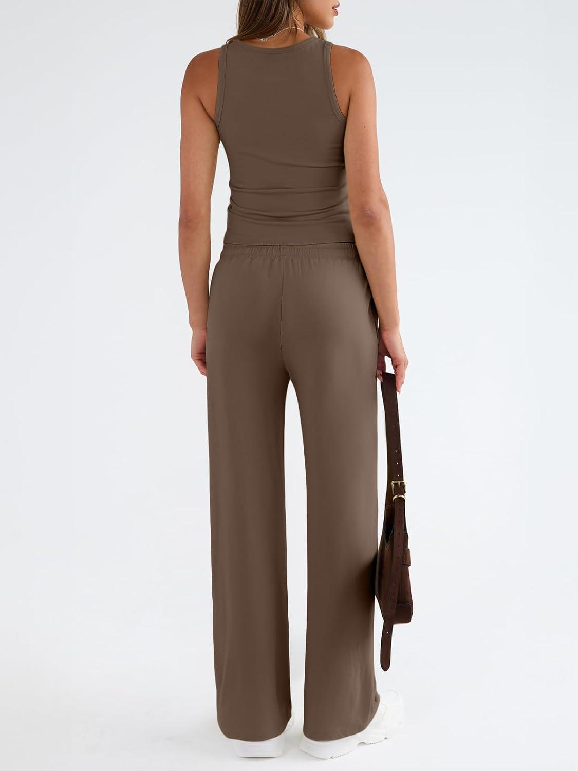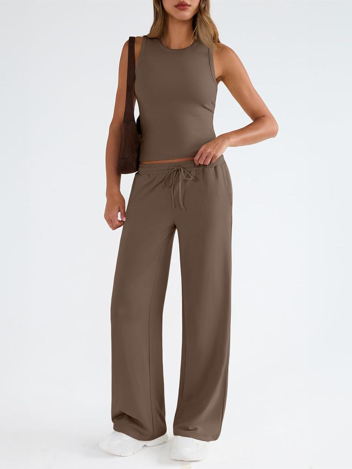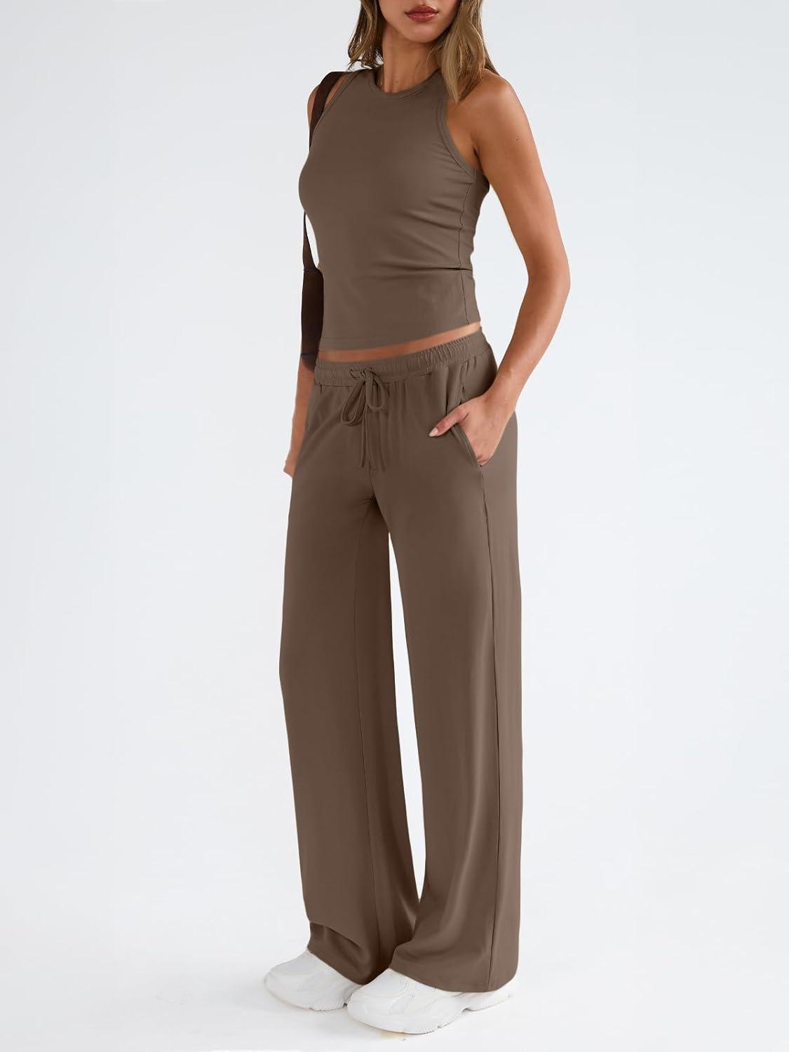 Trendy Queen Womens 2 Piece Outfits Sweatsuit Lounge Sets Sleeveless Tank Tops Summer Vacation Wide Leg Pants Tracksuits(Mocha)