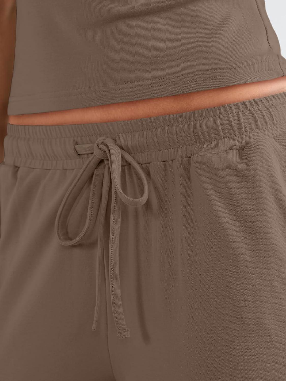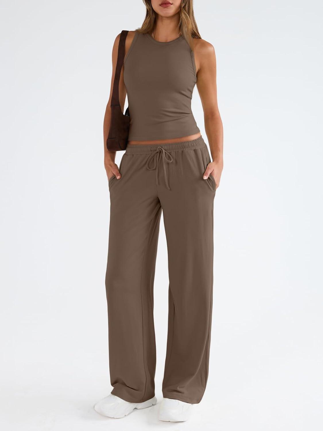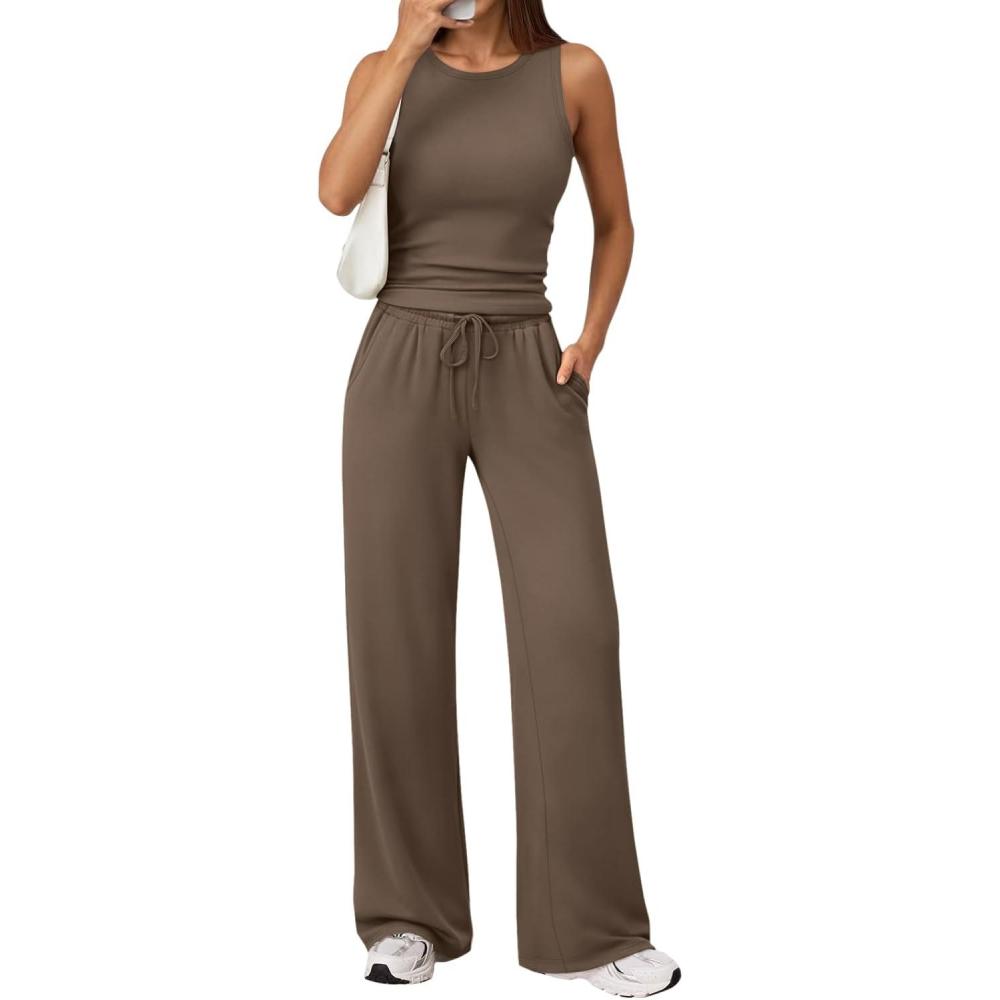 Trendy Queen Womens 2 Piece Outfits Sweatsuit Lounge Sets Sleeveless Tank Tops Summer Vacation Wide Leg Pants Tracksuits(Mocha)