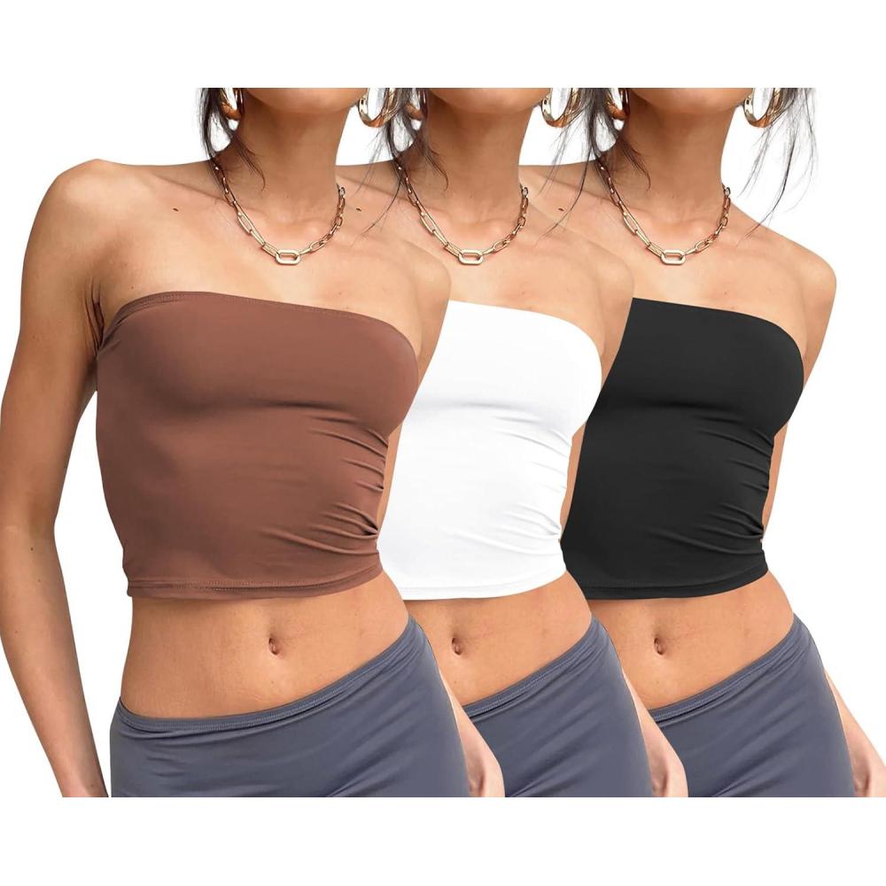 Trendy Queen Womens 3 Pack Tube Tops Crop Going Out Strapless Basic Backless Bandeau Bra Summer Outfits 2025(Black white coffee)