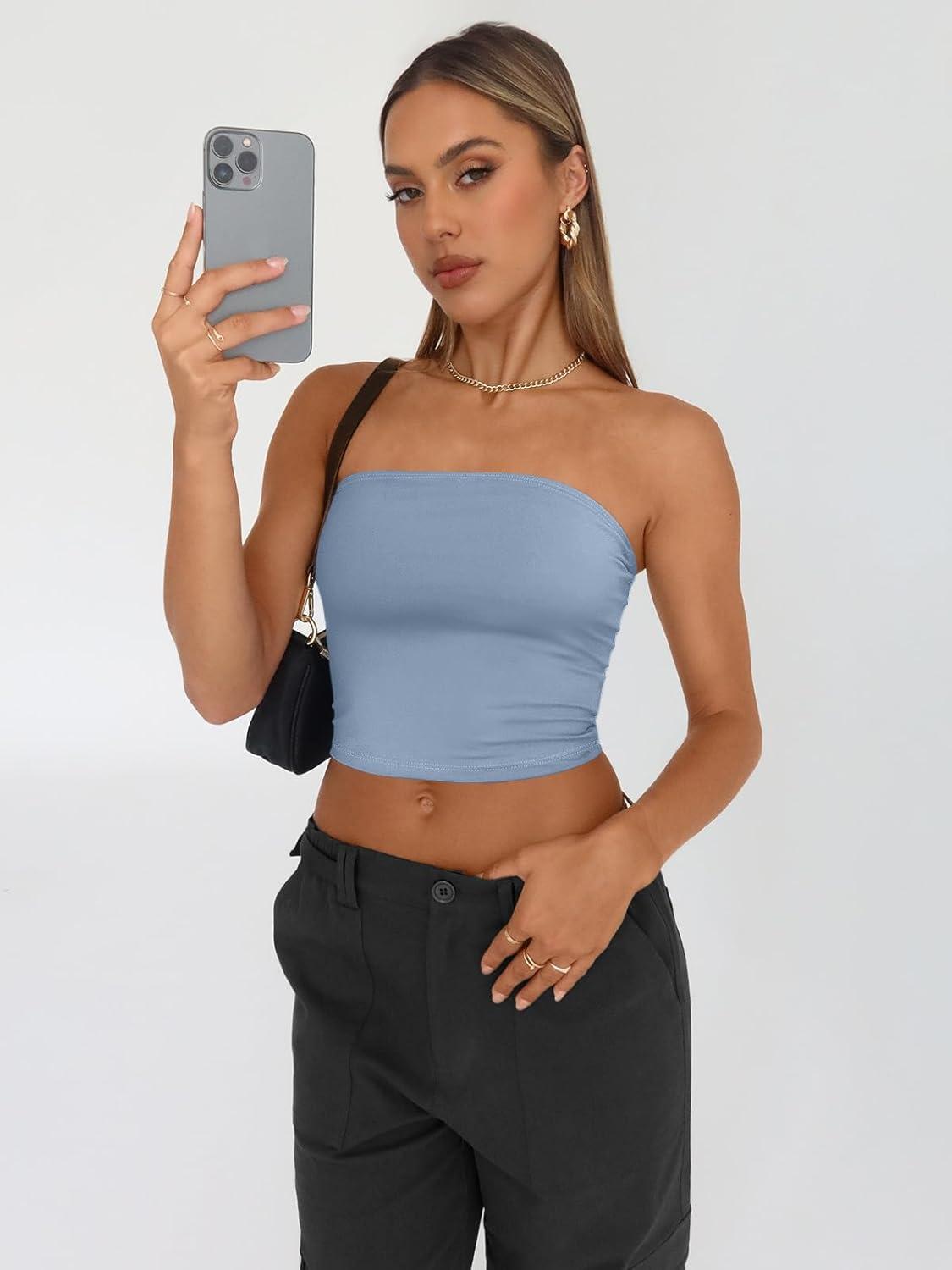 Trendy Queen Womens 3 Pack Tube Tops Crop Going Out Strapless Basic Backless Bandeau Bra Summer Outfits 2025(Black white light Blue)