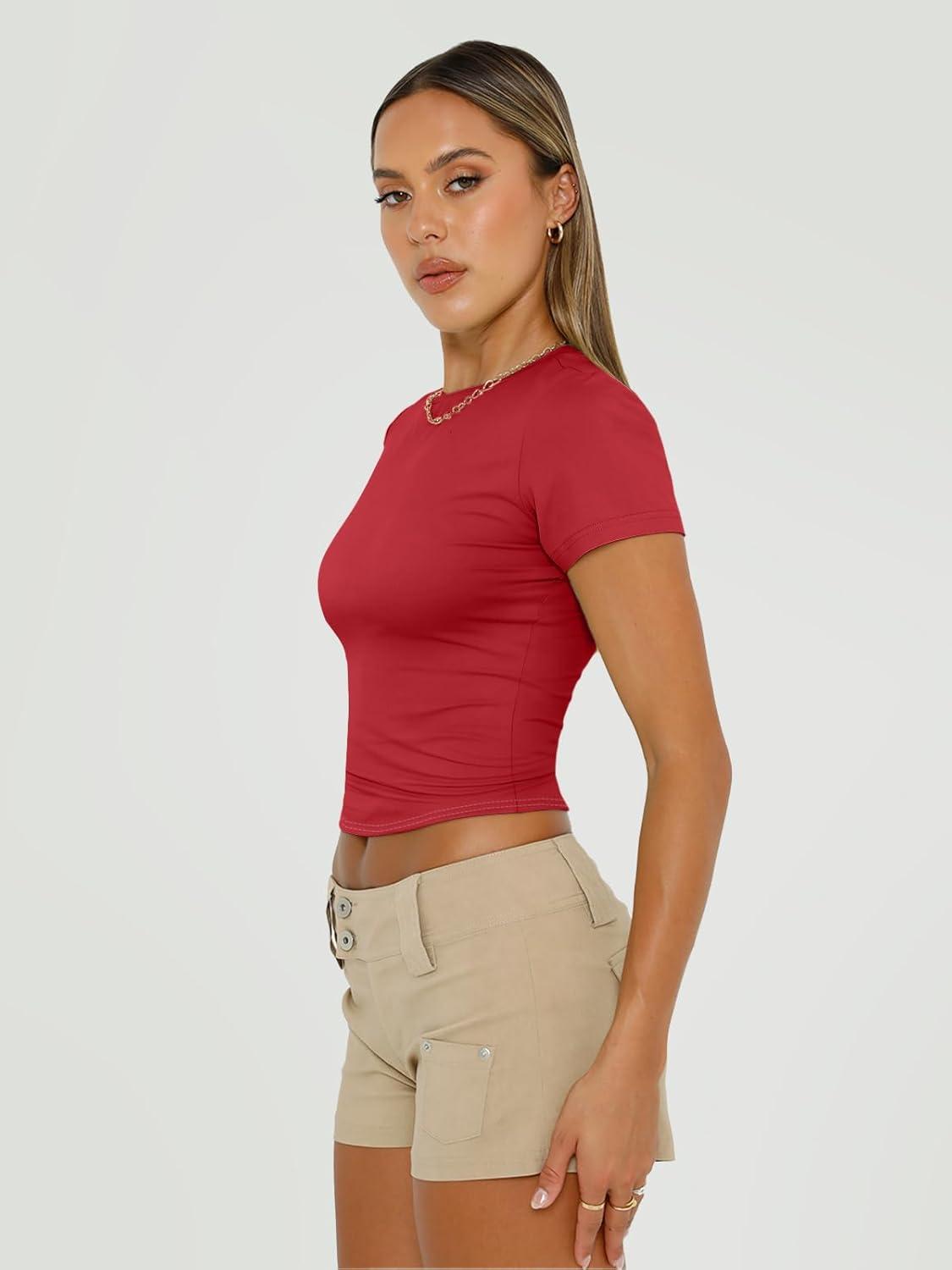 Get up to 60% off on Trendy Queen Womens Basic T Shirts Summer 2025 Scoop Neck Short Sleeve Crop Tops Slim Fit Tees Y2k Clothing(Red) styles during our winter sale event.