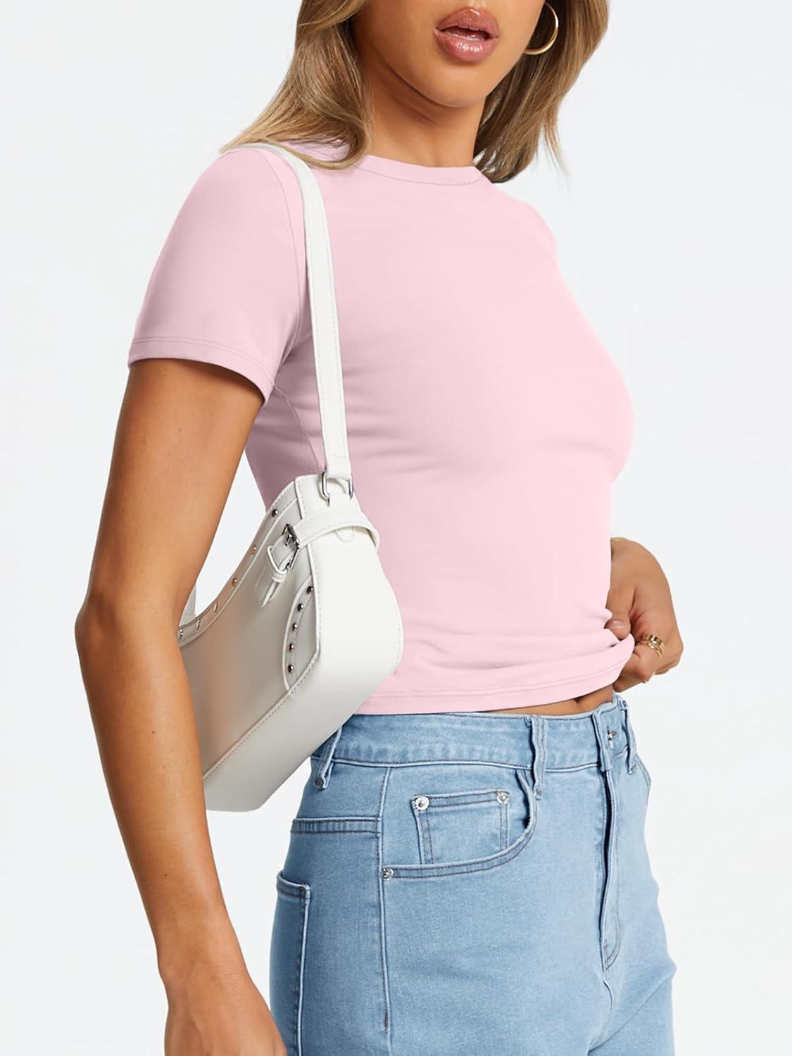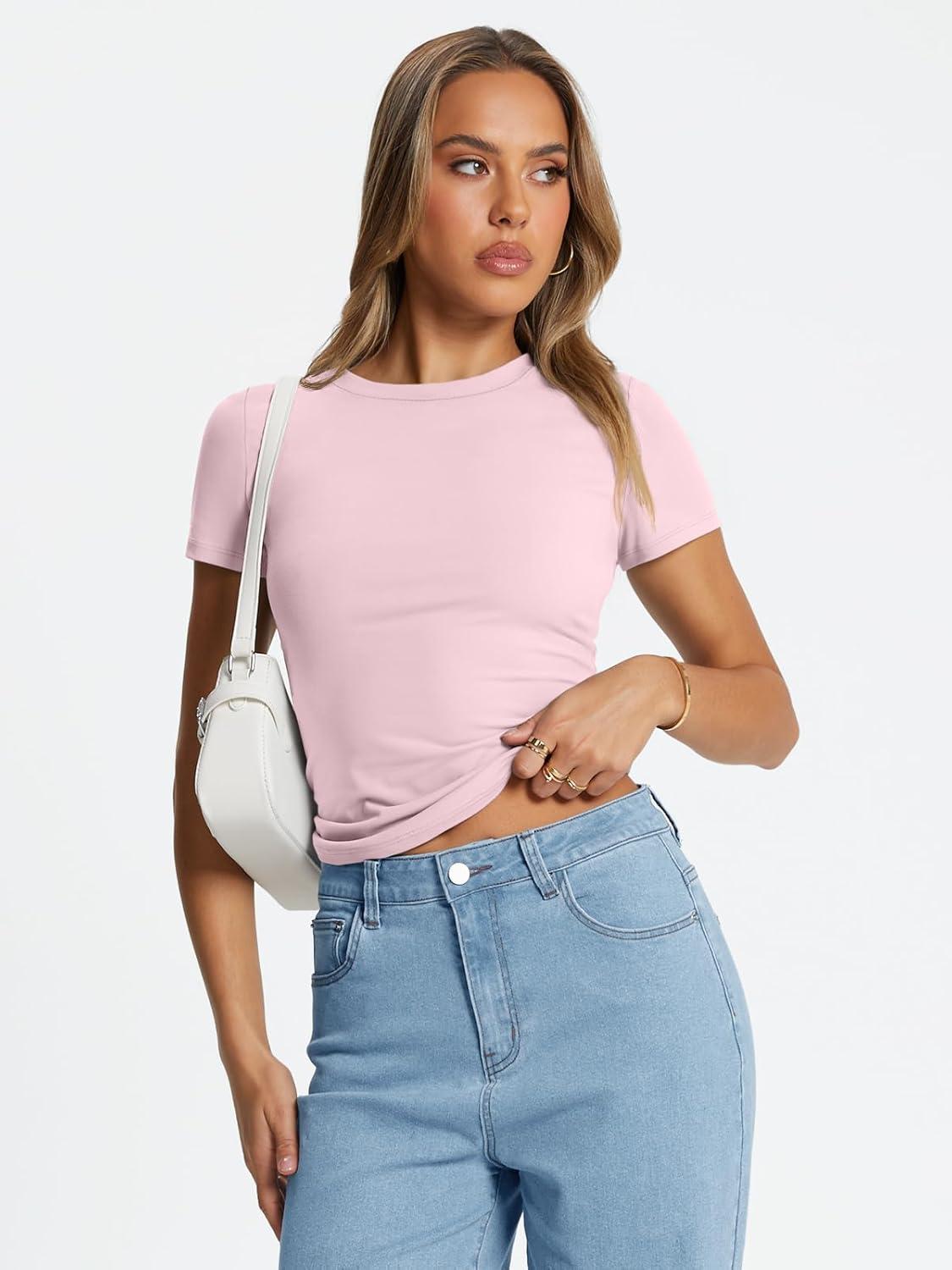 Trendy Queen Womens Basic T Shirts Summer Tops 2025 Crop Short Sleeve Slim Fit Tee Cute Gym Workout Clothes(Lightpink)