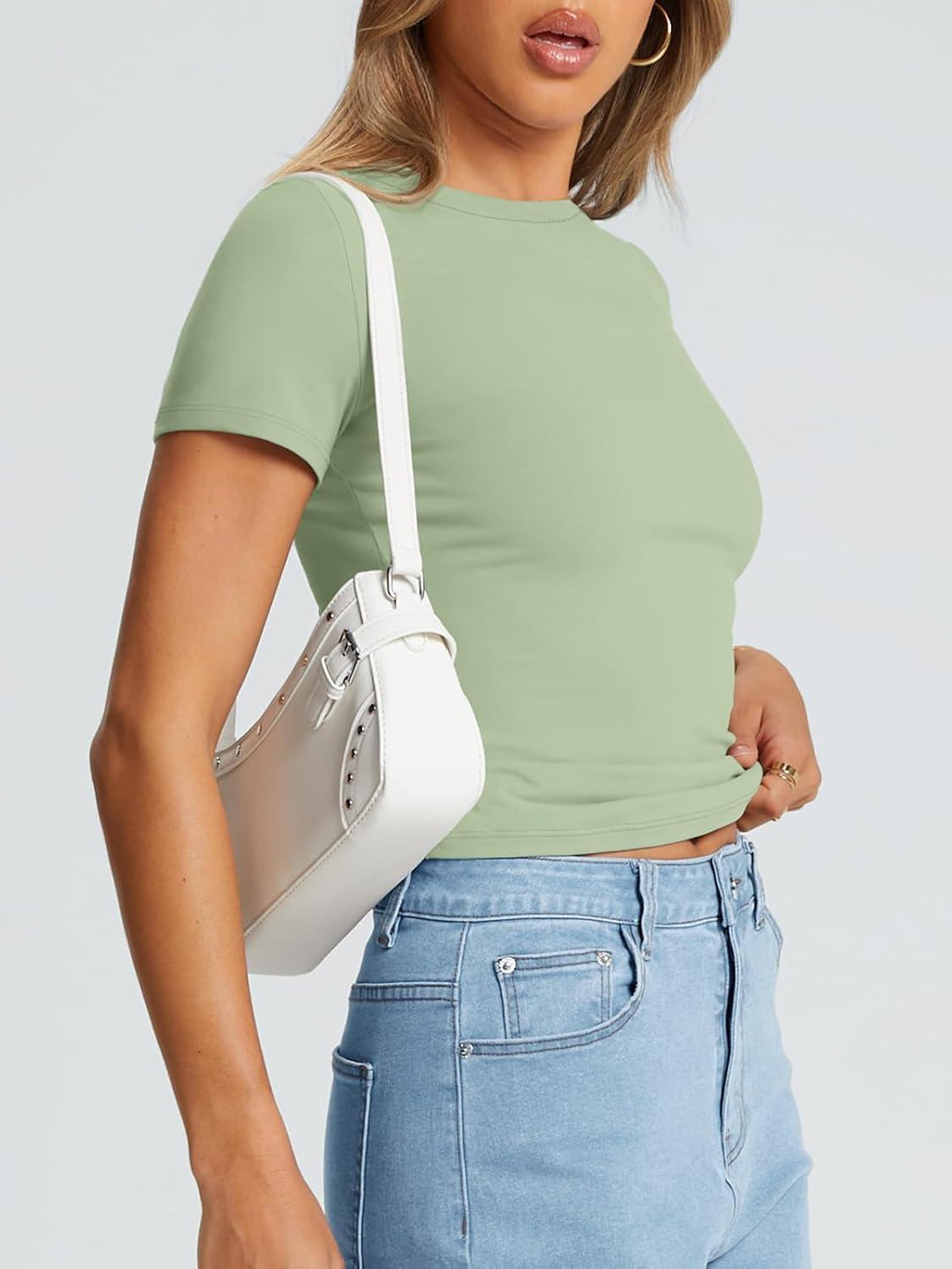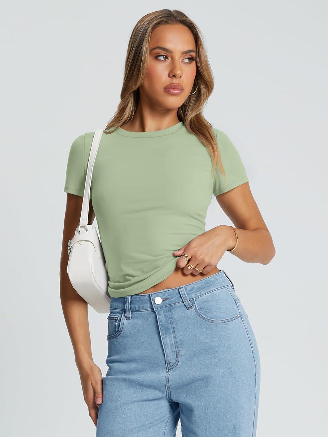 Trendy Queen Womens Basic T Shirts Summer Tops 2026 Crop Short Sleeve Slim Fit Tee Cute Gym Workout Clothes(Lightgreen)