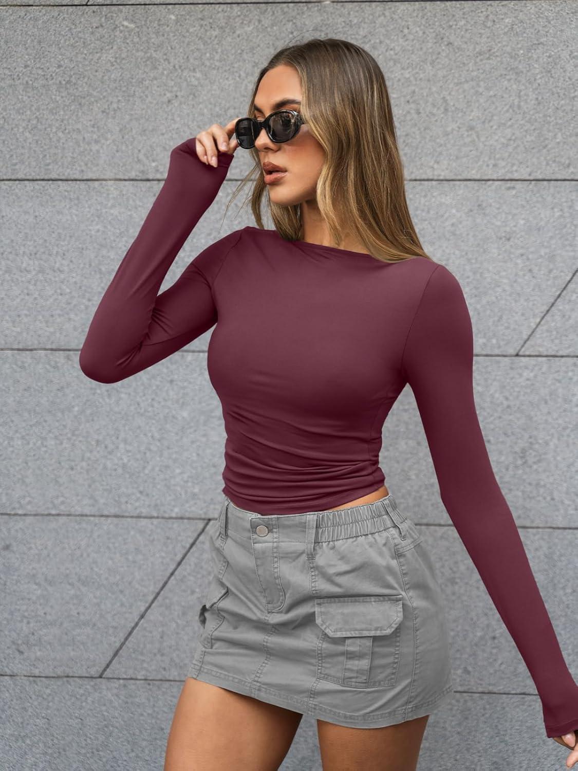 Trendy Queen Women’s Boat Neck Tops Long Sleeve Shirts Casual Fitted Tee Shirts Solid Color Fall Basic Clothes 2025(Winered)
