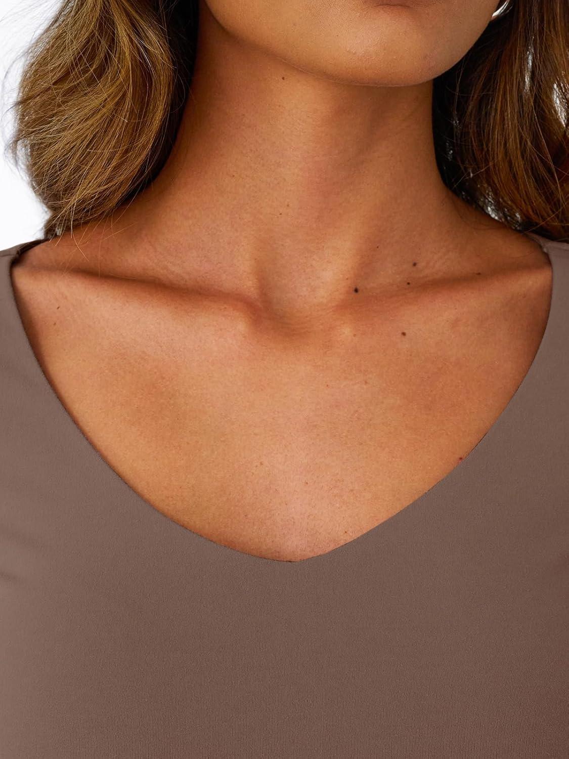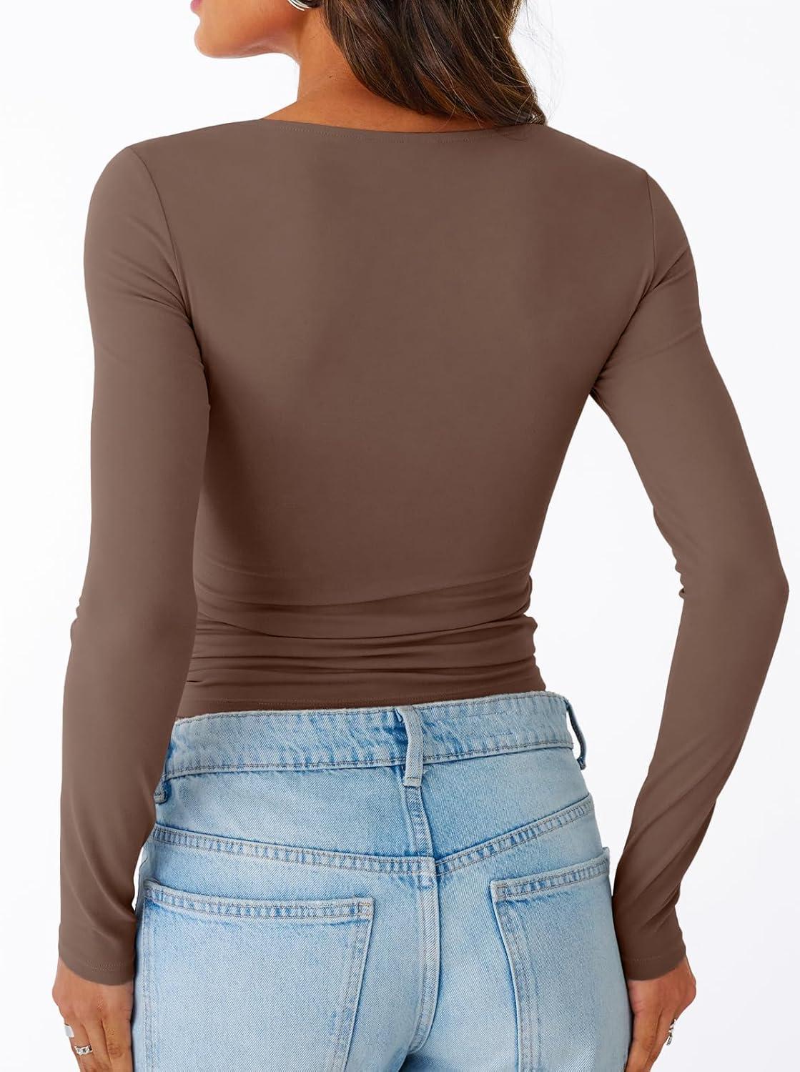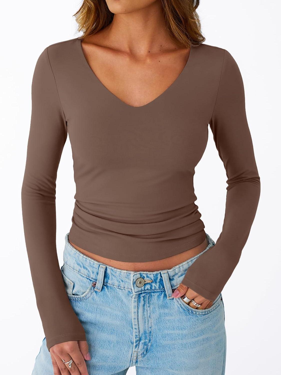 Trendy Queen Womens Double Lined V Neck Long Sleeve Shirt 2025 Fall Fitted Crop Top Going Out Basic Tee Fashion Clothing(Coffee Grey)