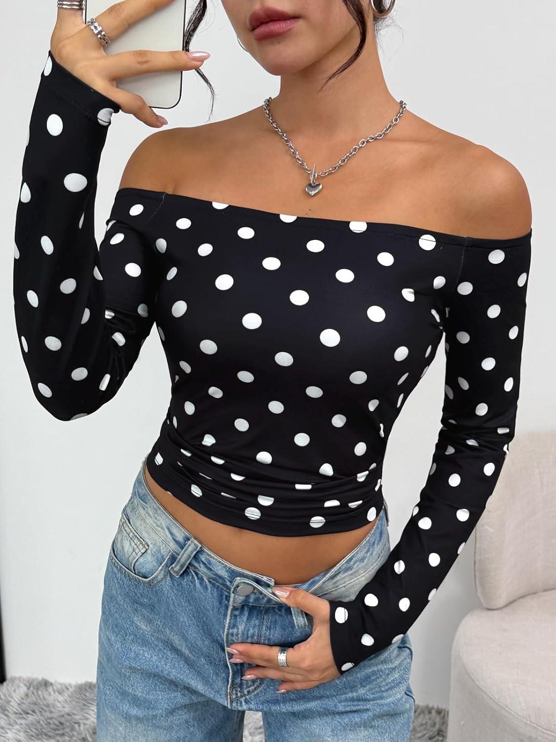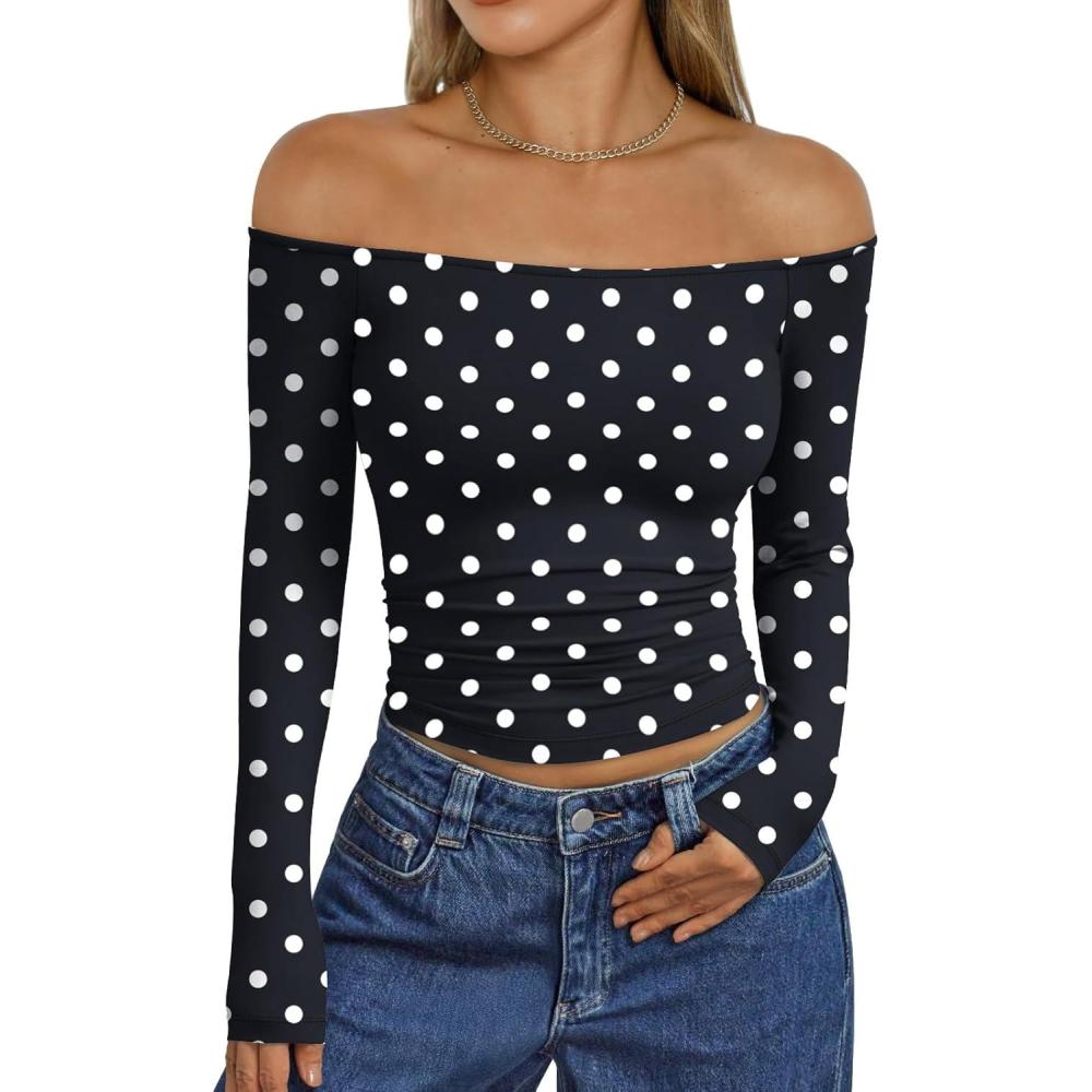 Trendy Queen Womens Long Sleeve Off The Shoulder Tops Going Out Cute Basic Y2K Fall Fashion 2025 Outfits Clothes(Black Dots)