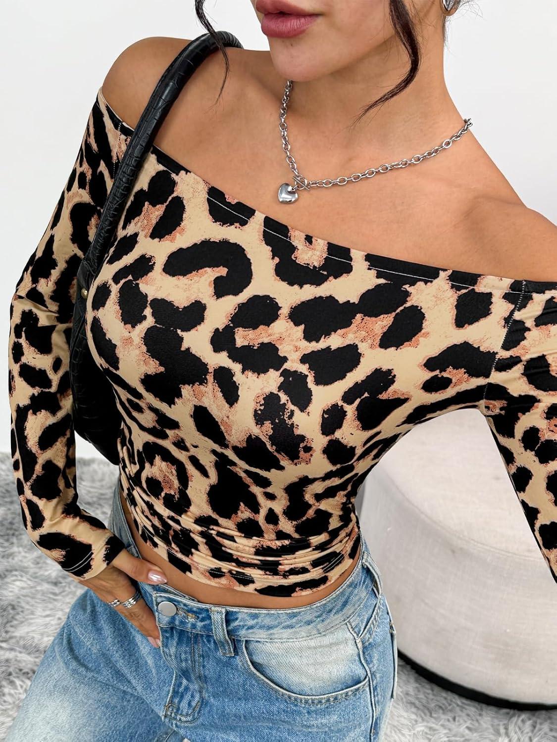 Trendy Queen Womens Long Sleeve Off The Shoulder Tops Going Out Cute Basic Y2K Fall Fashion 2025 Outfits Clothes(Leopard)