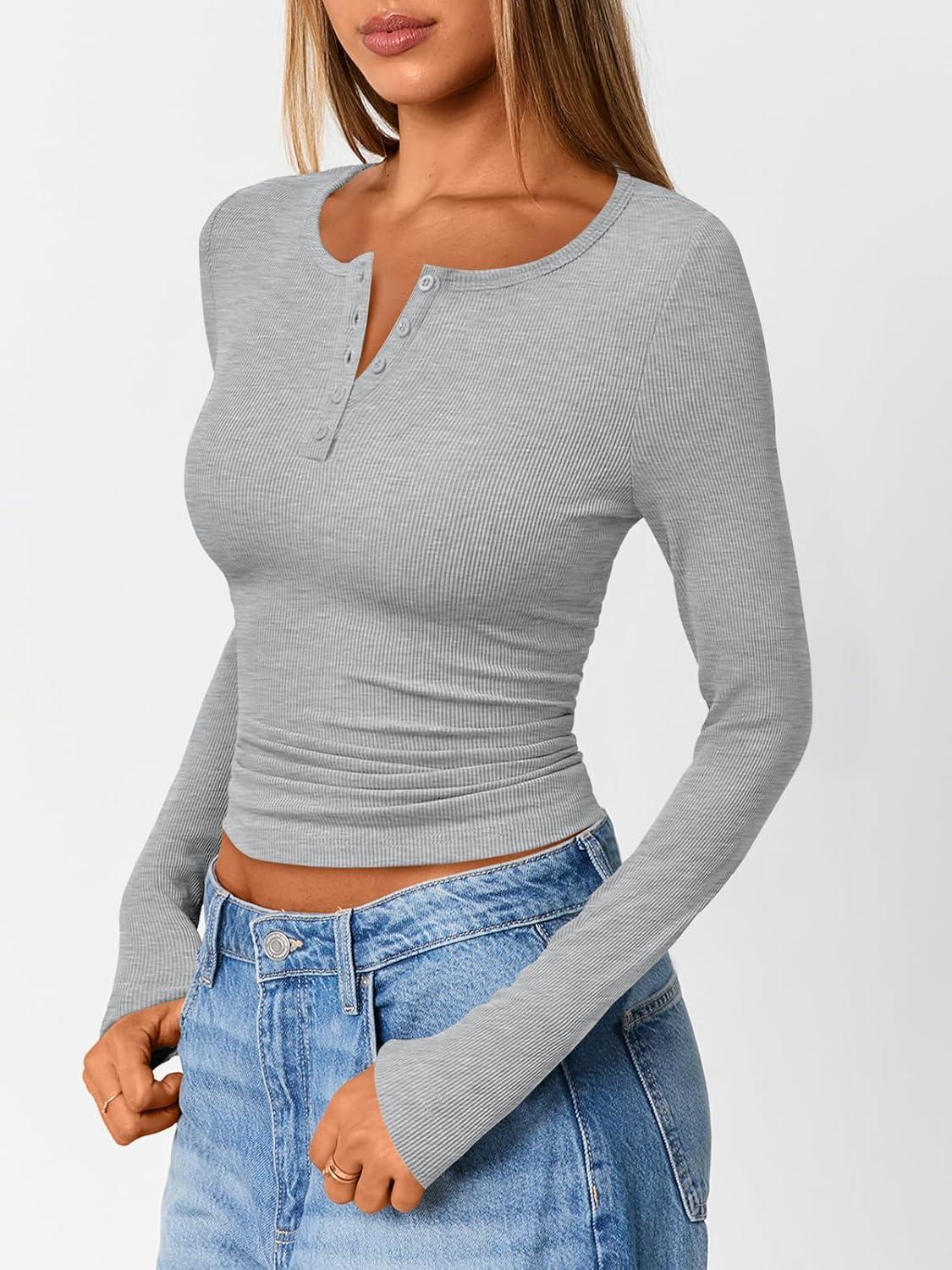 Trendy Queen Womens Long Sleeve Shirts 2025 Henley Casual Fall Outfits Fitted Tops Ribbed Fashion Basic Tees(Grey)