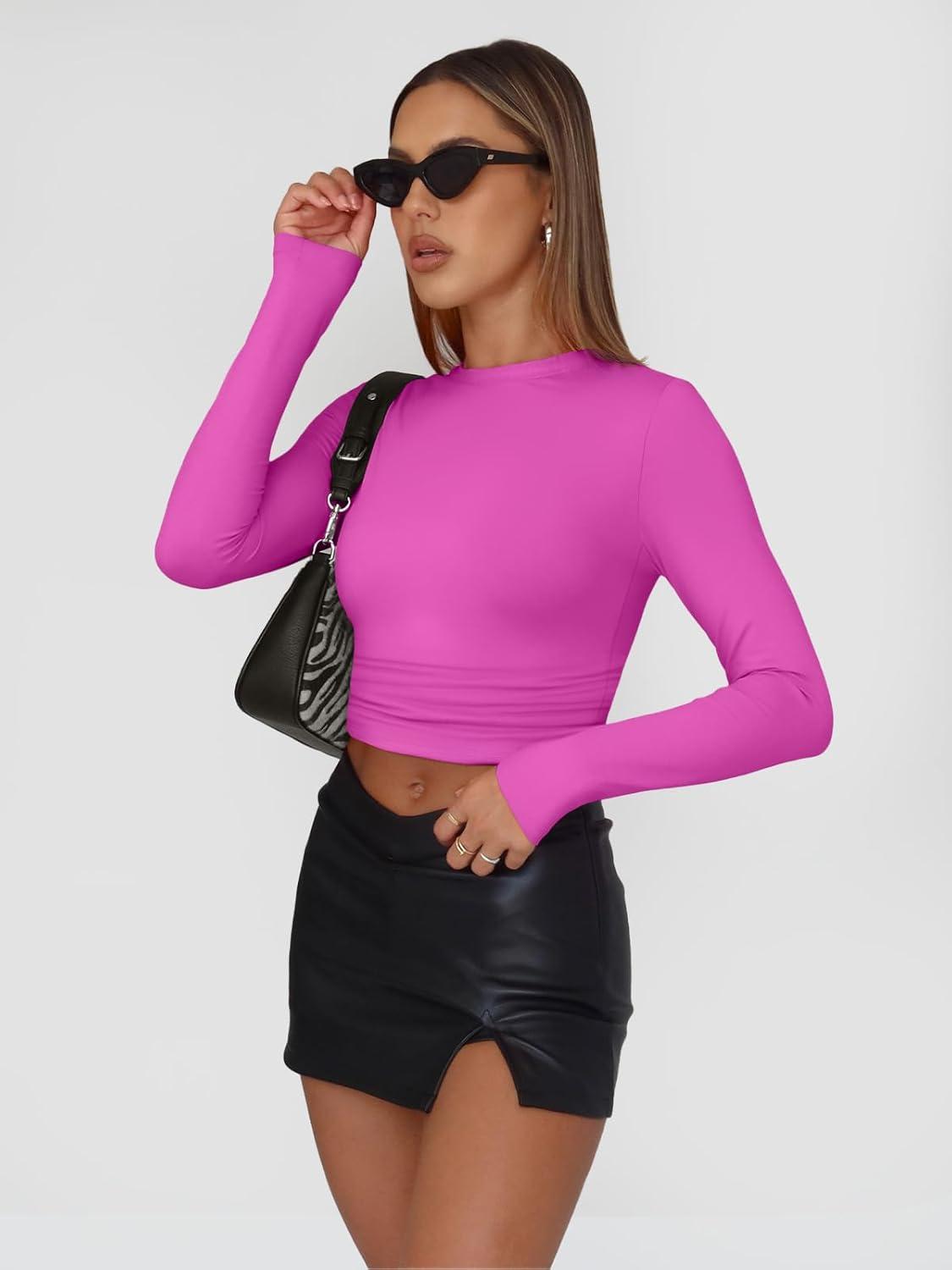 Get the Trendy Queen Womens Long Sleeve Shirts Basic Crop Tops Tight Slim Fit Cute Teen Girls Fall Winter Y2k Clothes(Hot Pink) you want at a price you can afford with our markdown sale.