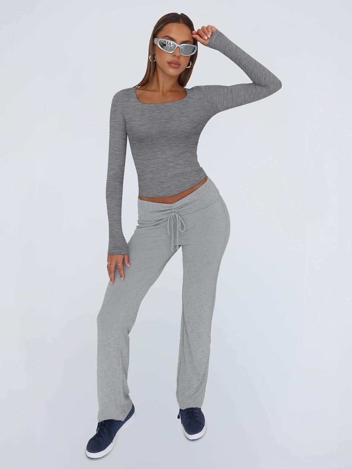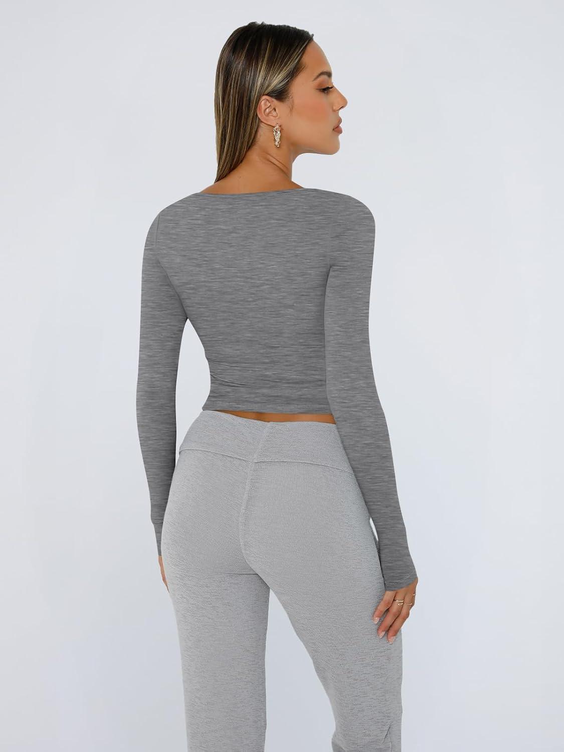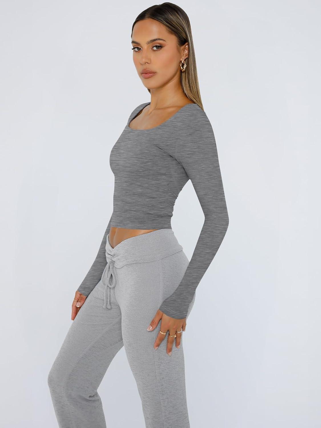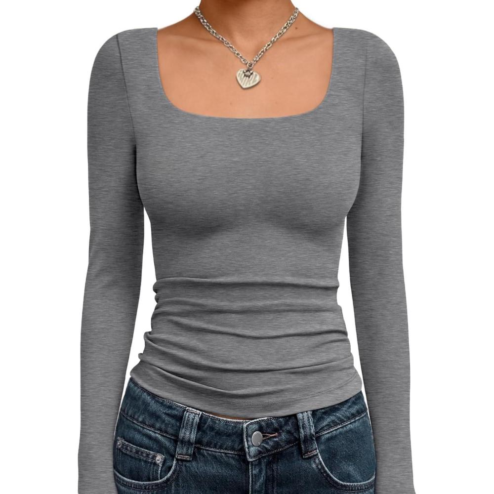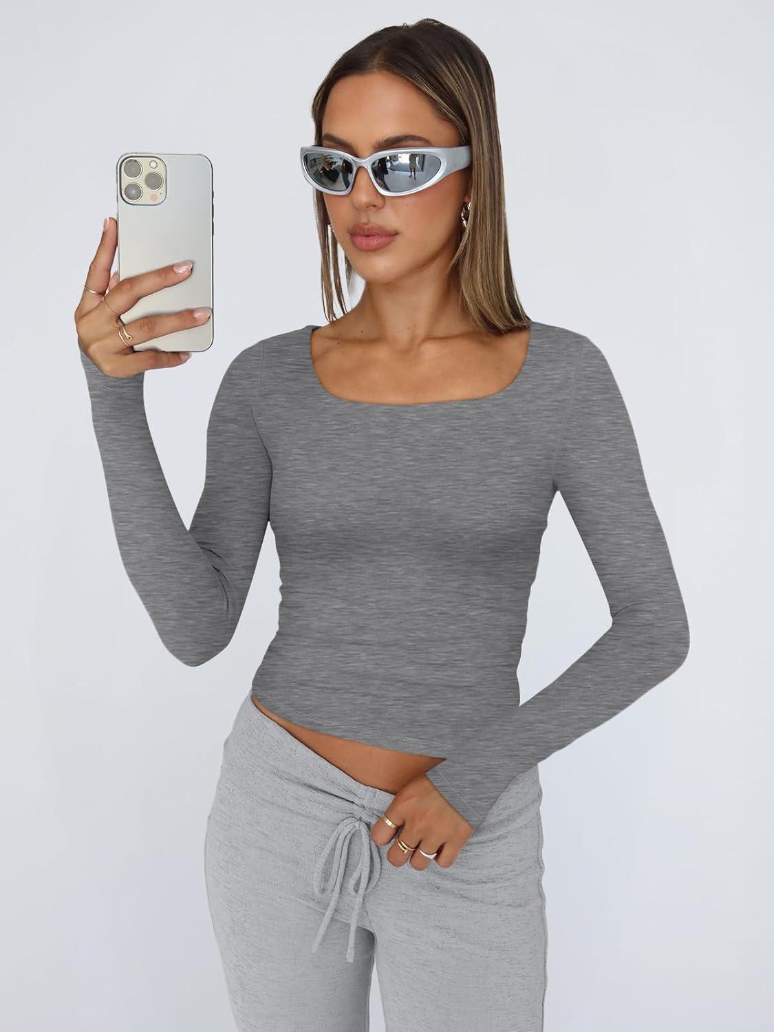 Trendy Queen Womens Long Sleeve Shirts Crop Tops Fall Fashion 2025 Square Neck Going Out Basics Tees Y2k Clothes(Black Grey)