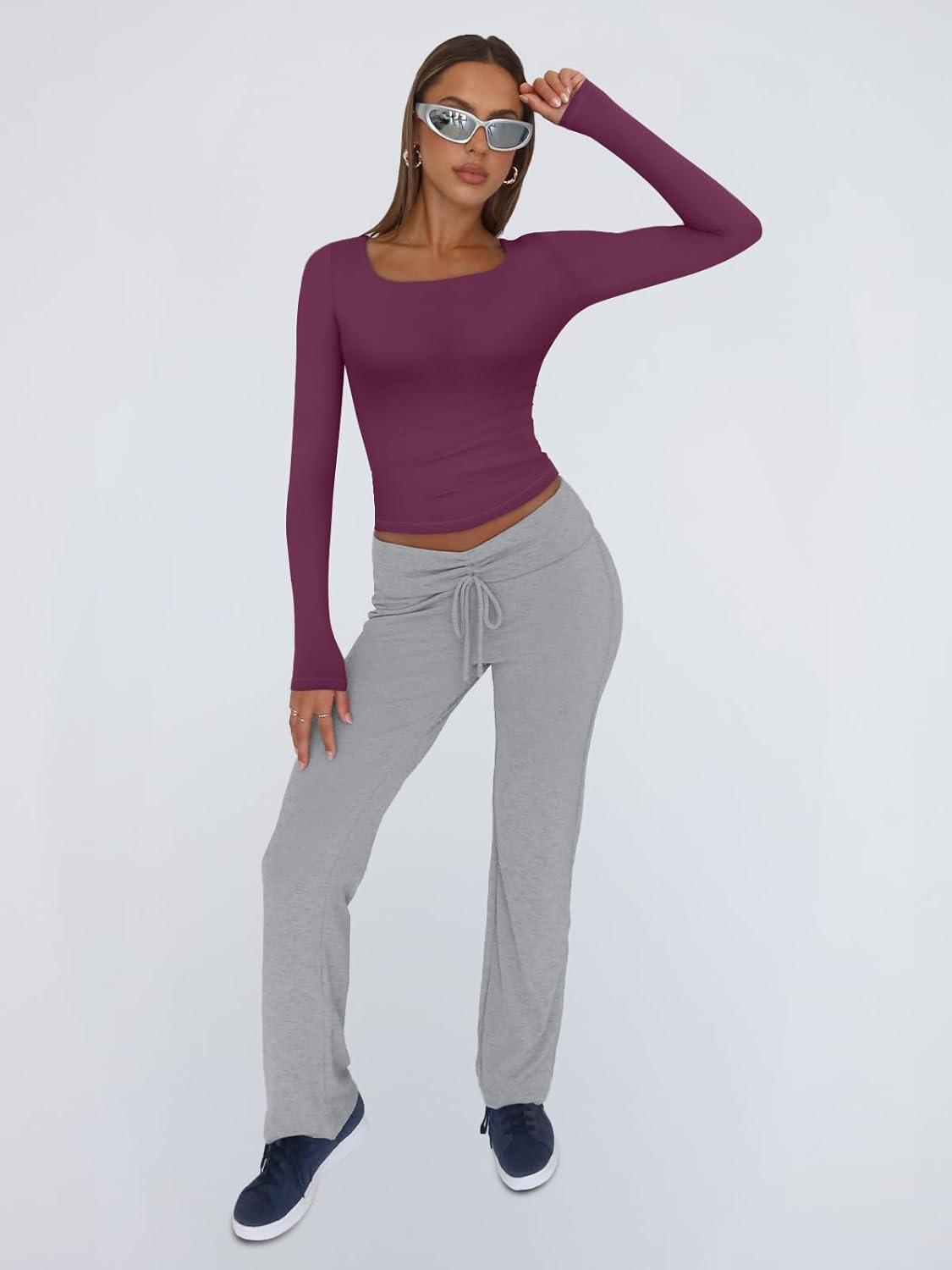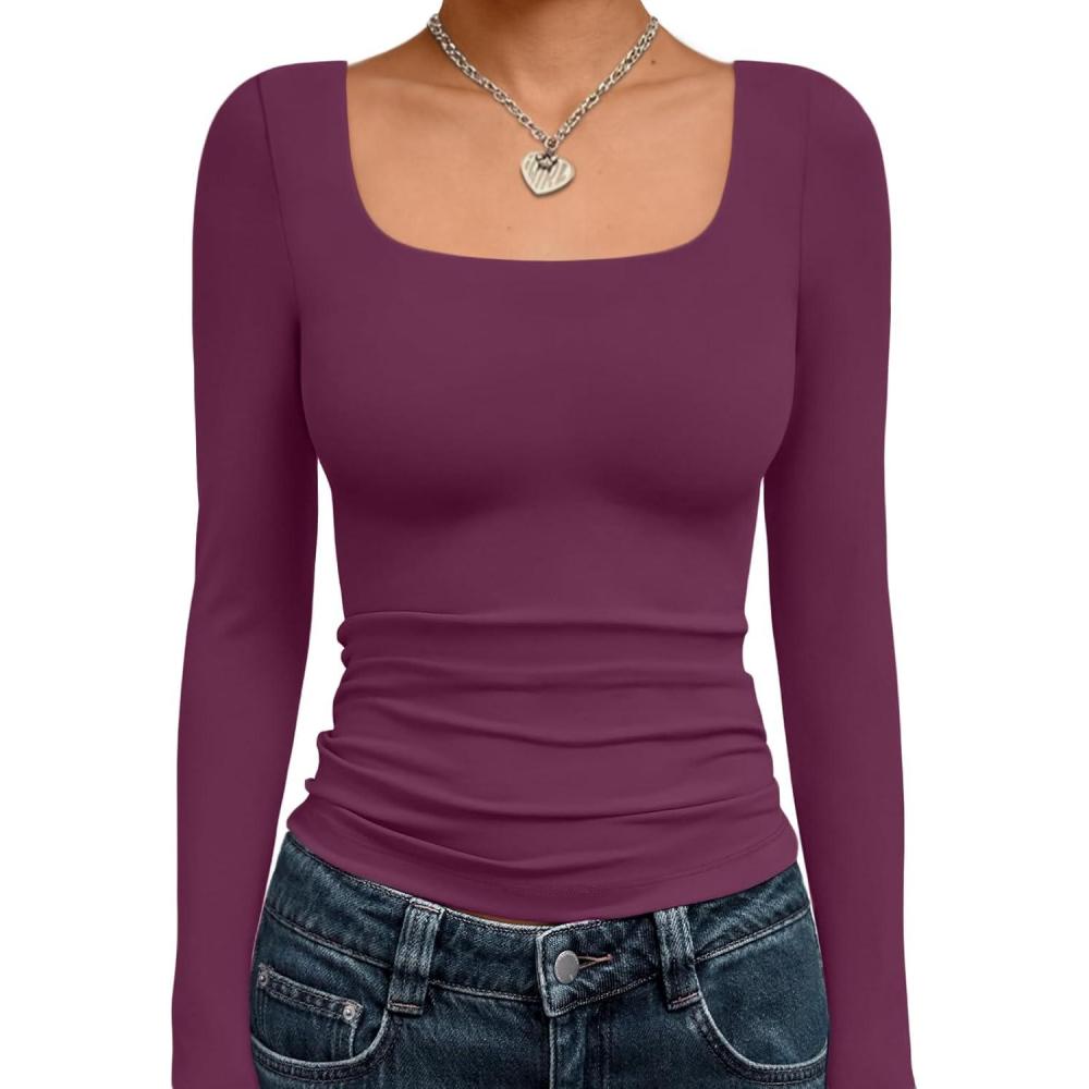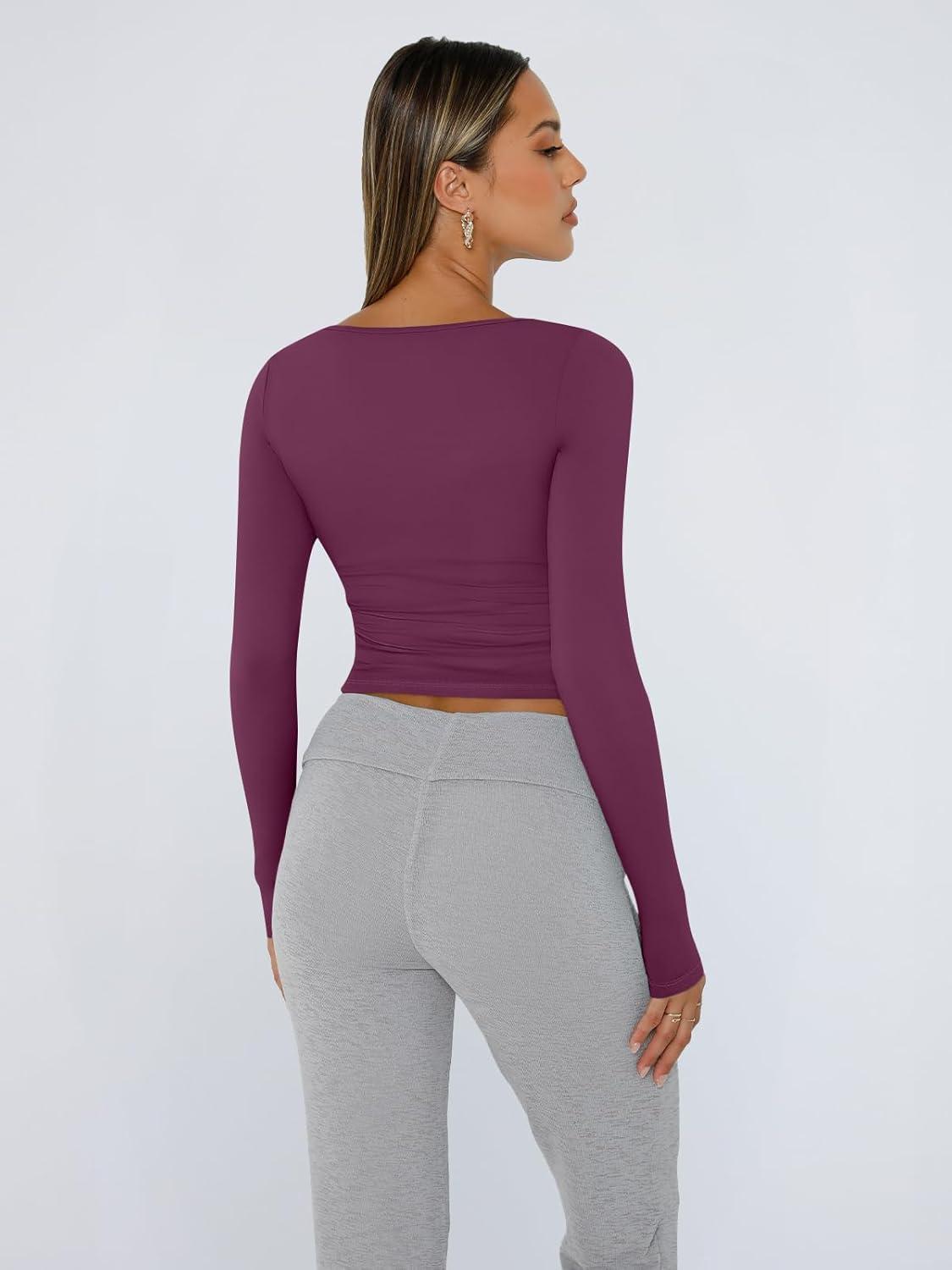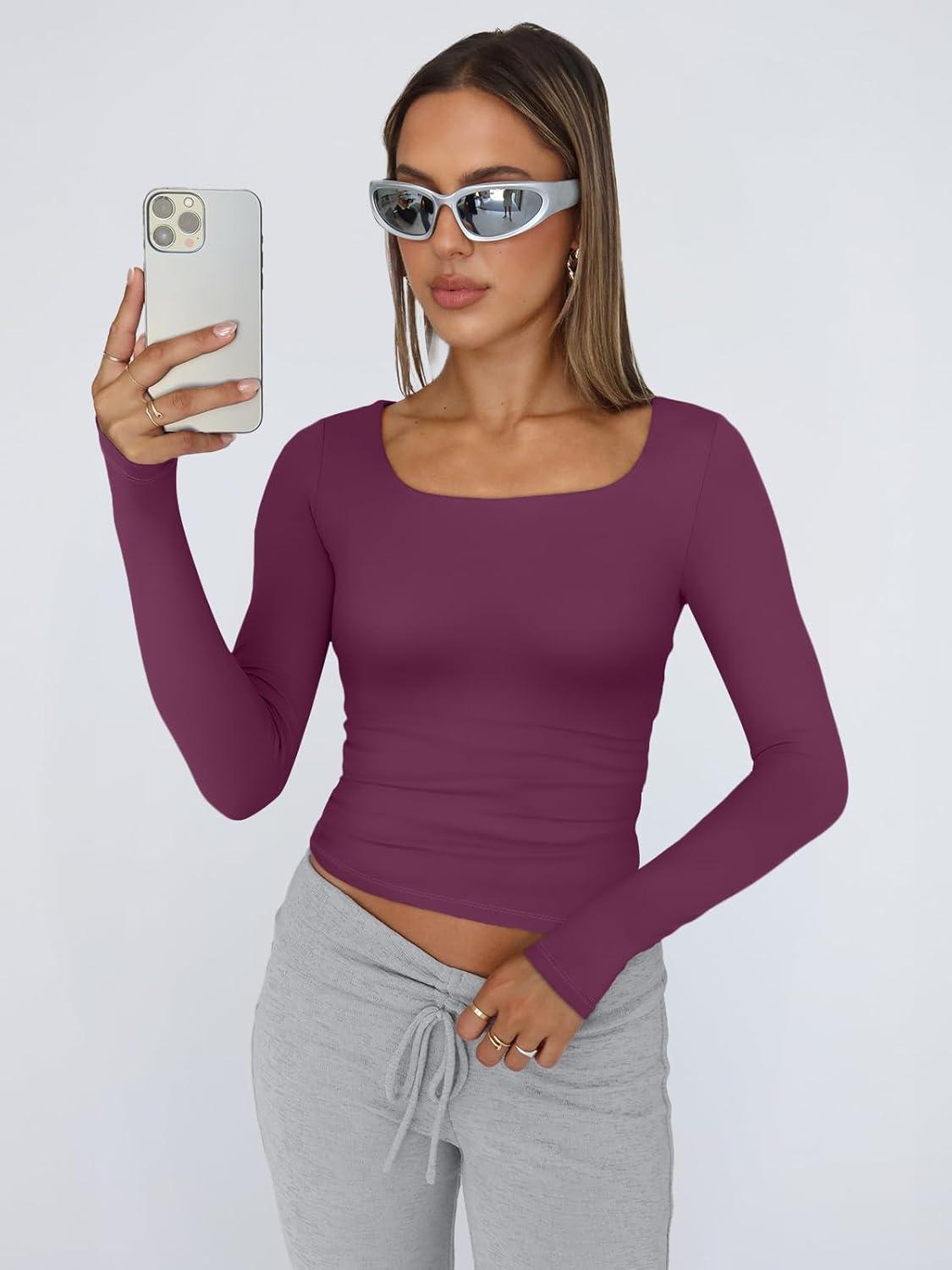 Trendy Queen Womens Long Sleeve Shirts Crop Tops Fall Fashion 2025 Square Neck Going Out Basics Tees Y2k Clothes(Mulberry)