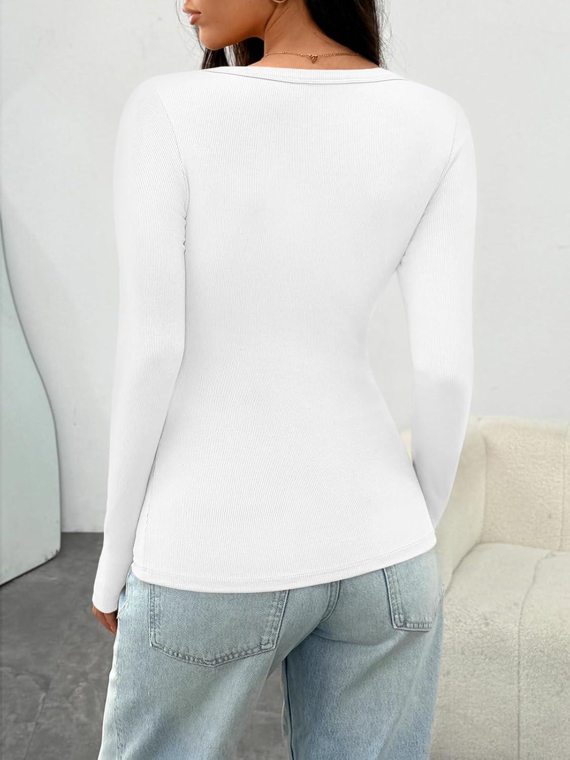Trendy Queen Womens Long Sleeve Shirts Henley V Neck Ribbed Knit Tops Business Casual Basic Tees(White)