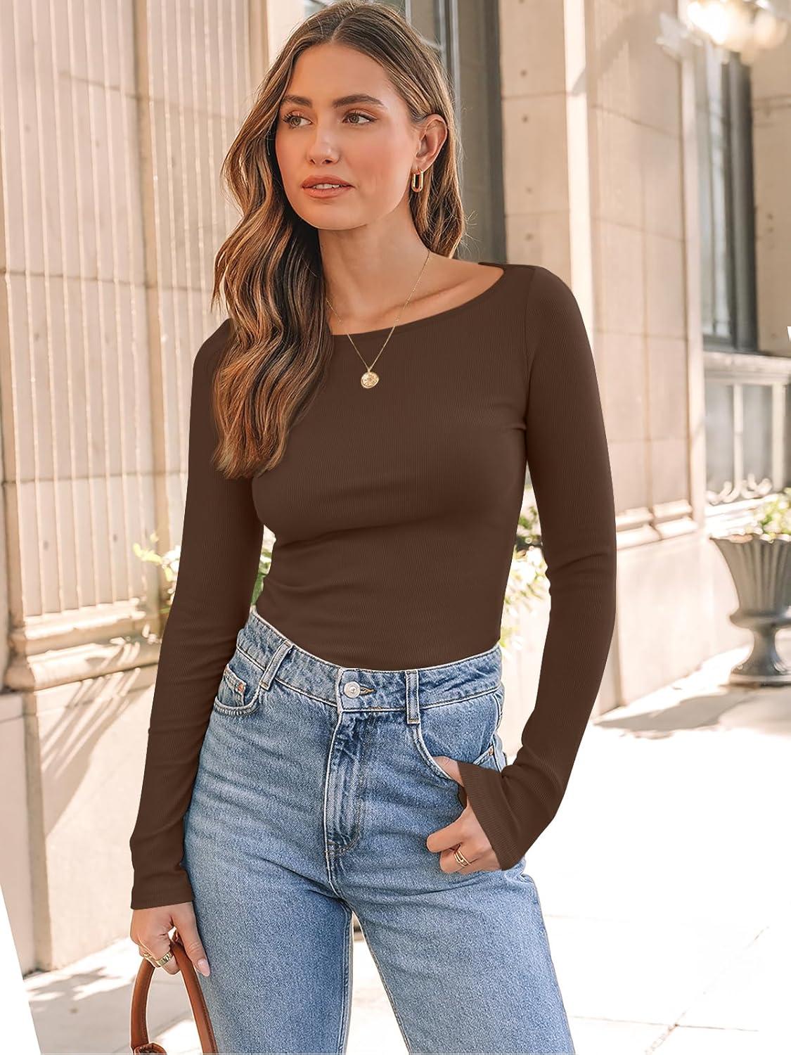 Trendy Queen Womens Long Sleeve Shirts Ribbed Underscrub Tops Boat Neck Basic Tees Fall Fashion Clothes 2025(Brown)
