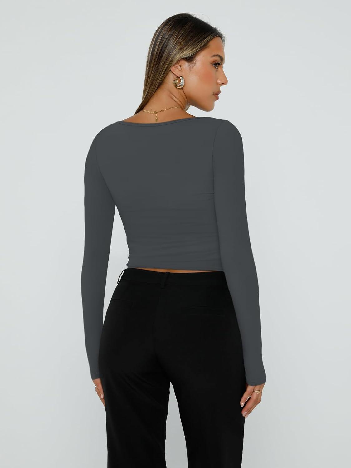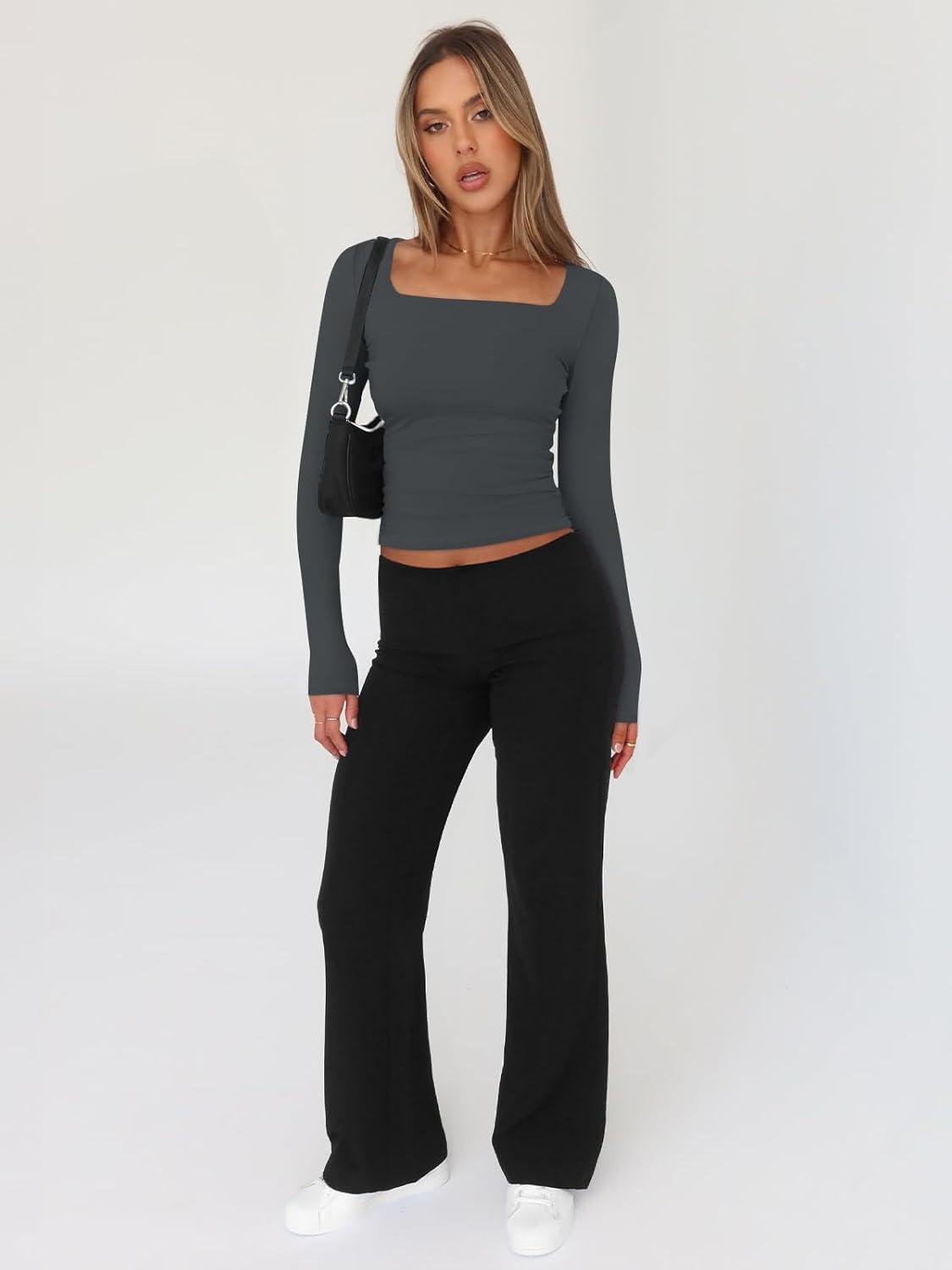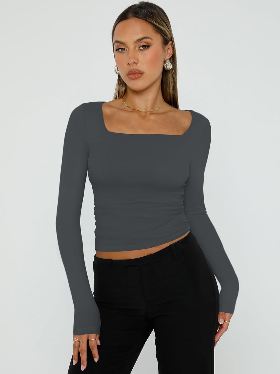Trendy Queen Womens Long Sleeve Shirts Square Neck Going Out Crop Tops Fashion Y2k Workout Clothes Fall Outfits 2025(Gray)