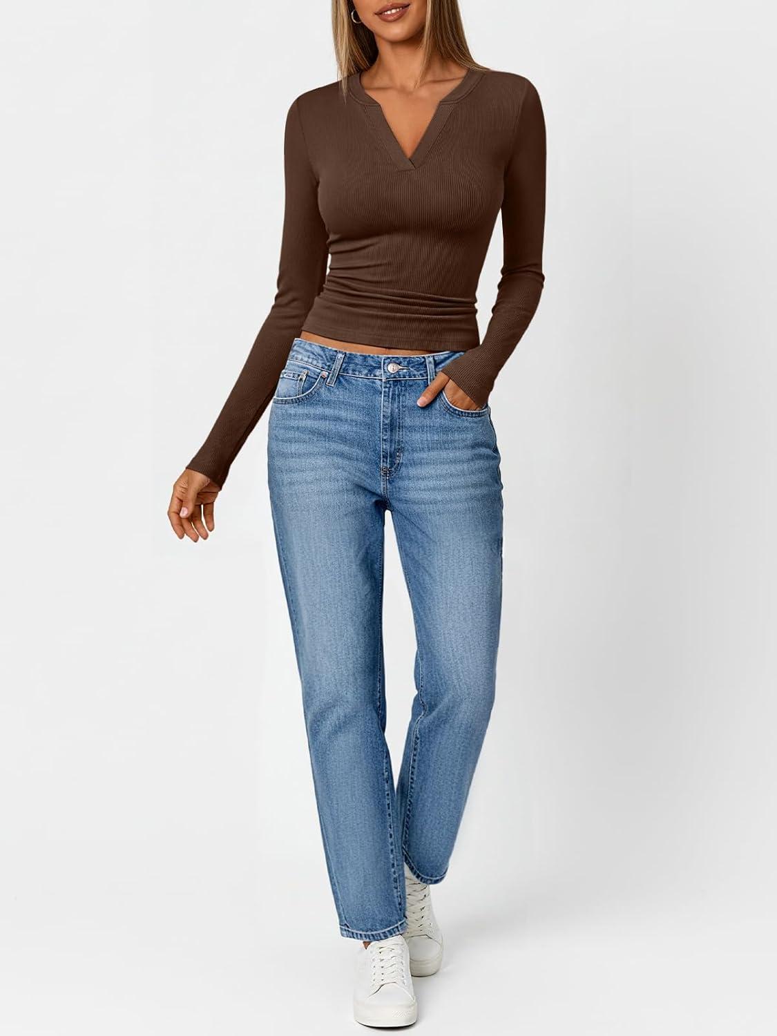 Trendy Queen Womens Long Sleeve Shirts V Neck Ribbed Knit Fall Tops Henley Teen Girls Basic Tee 2025(Brown)