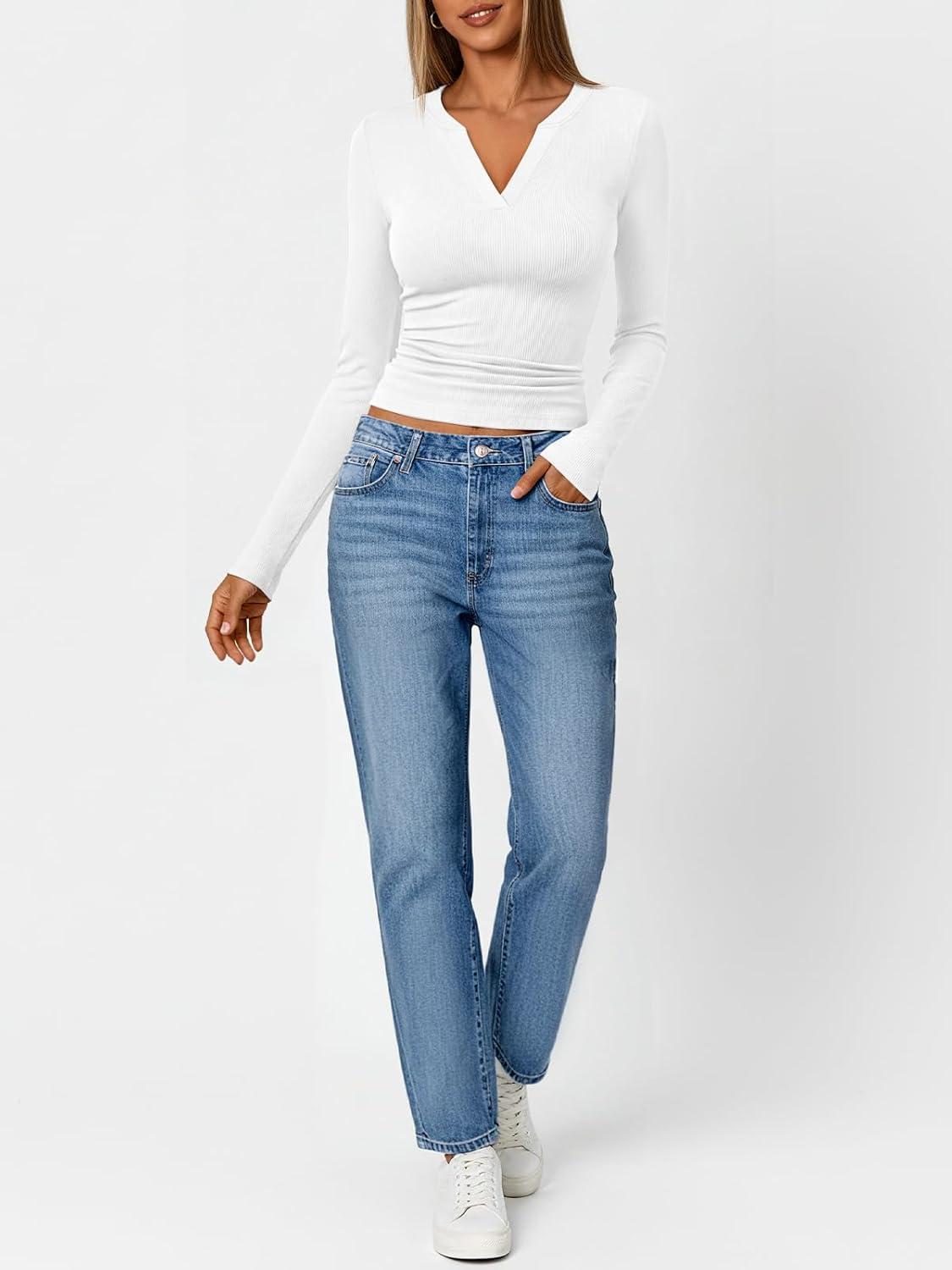 Trendy Queen Womens Long Sleeve Shirts V Neck Ribbed Knit Fall Tops Henley Teen Girls Basic Tee 2025(White)