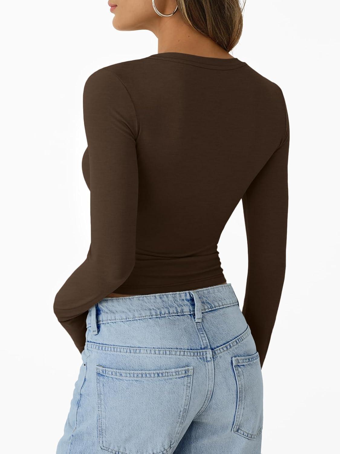 Trendy Queen Womens Long Sleeve T-Shirts Basic Crop Tops 2025 Fall Fashion Outfits Going Out Winter Clothes(Brown)