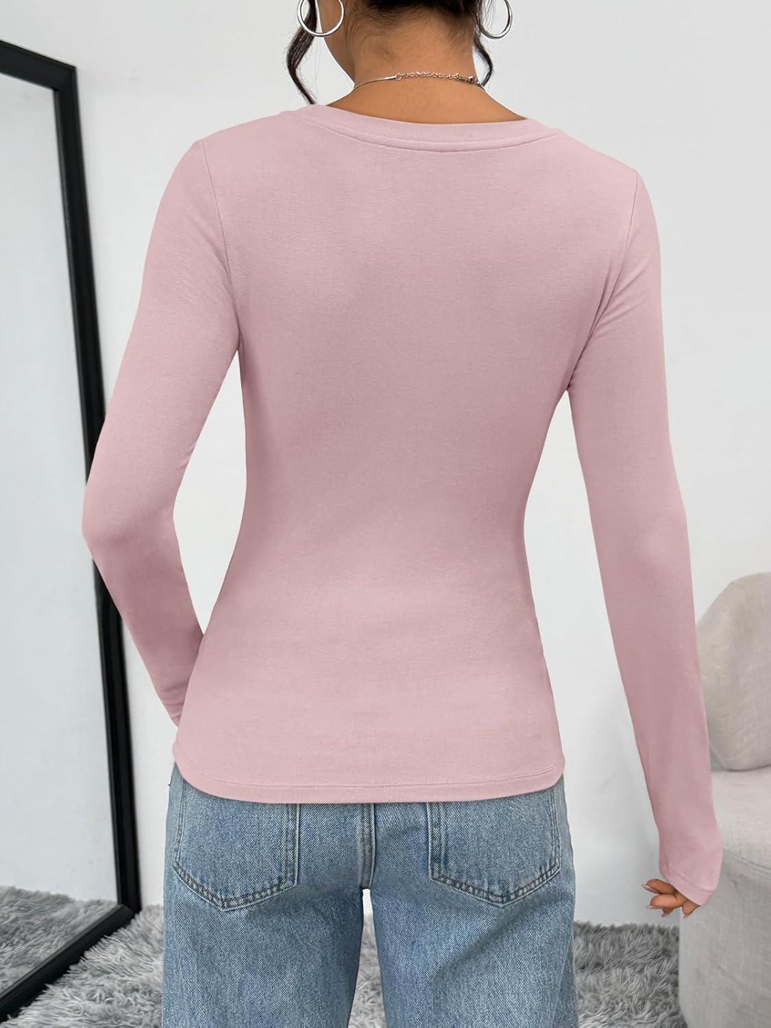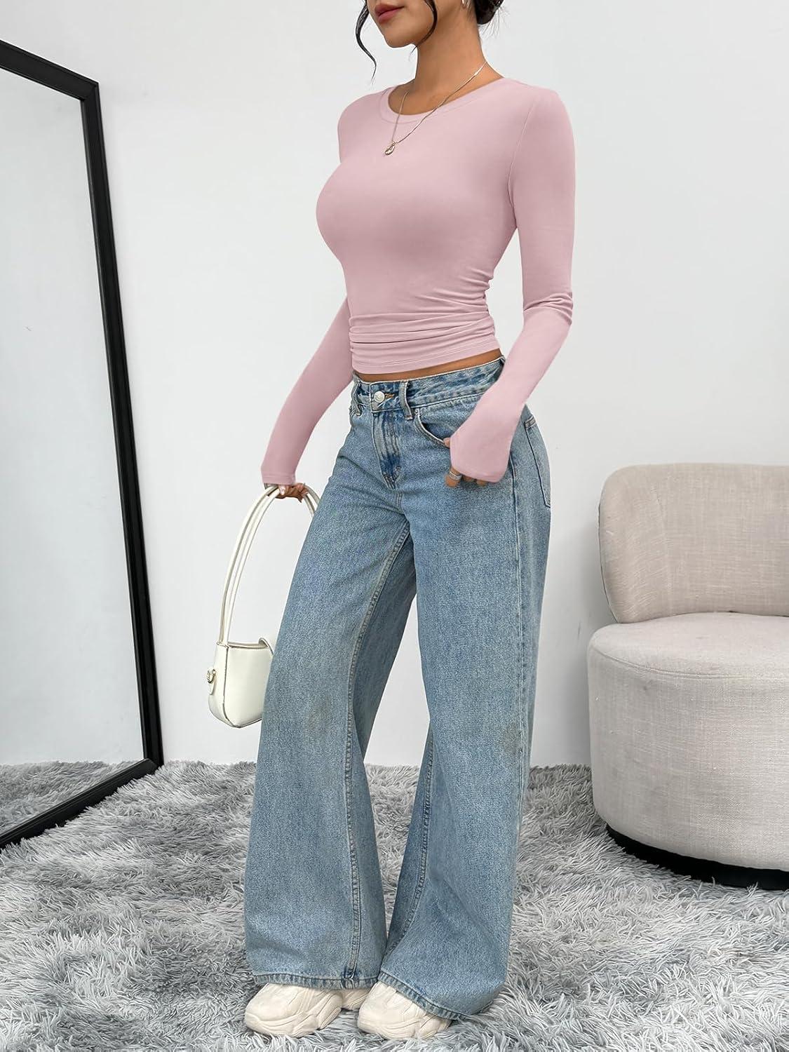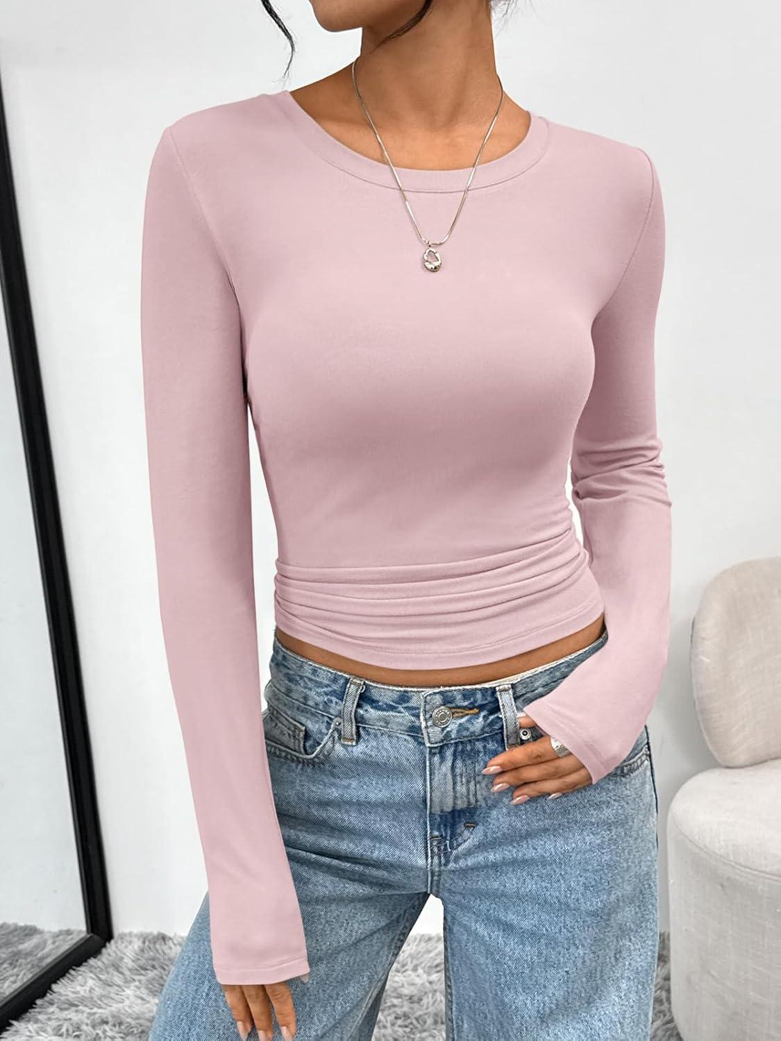 Trendy Queen Womens Long Sleeve T-Shirts Basic Crop Tops 2025 Fall Fashion Outfits Going Out Winter Clothes(Pink)