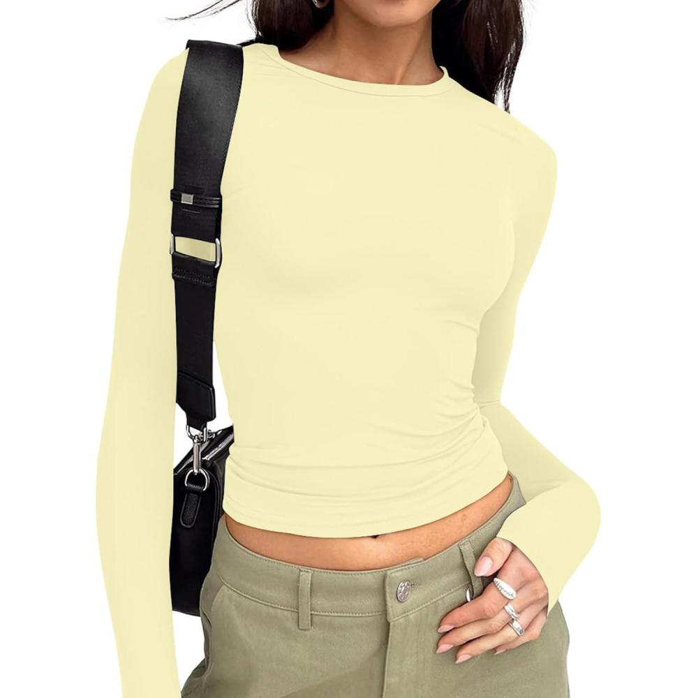 Trendy Queen Womens Long Sleeve T Shirts Fall Fashion 2025 Basic Crop Tops Going Out Outfits Y2k Clothes(Creamy Yellow)