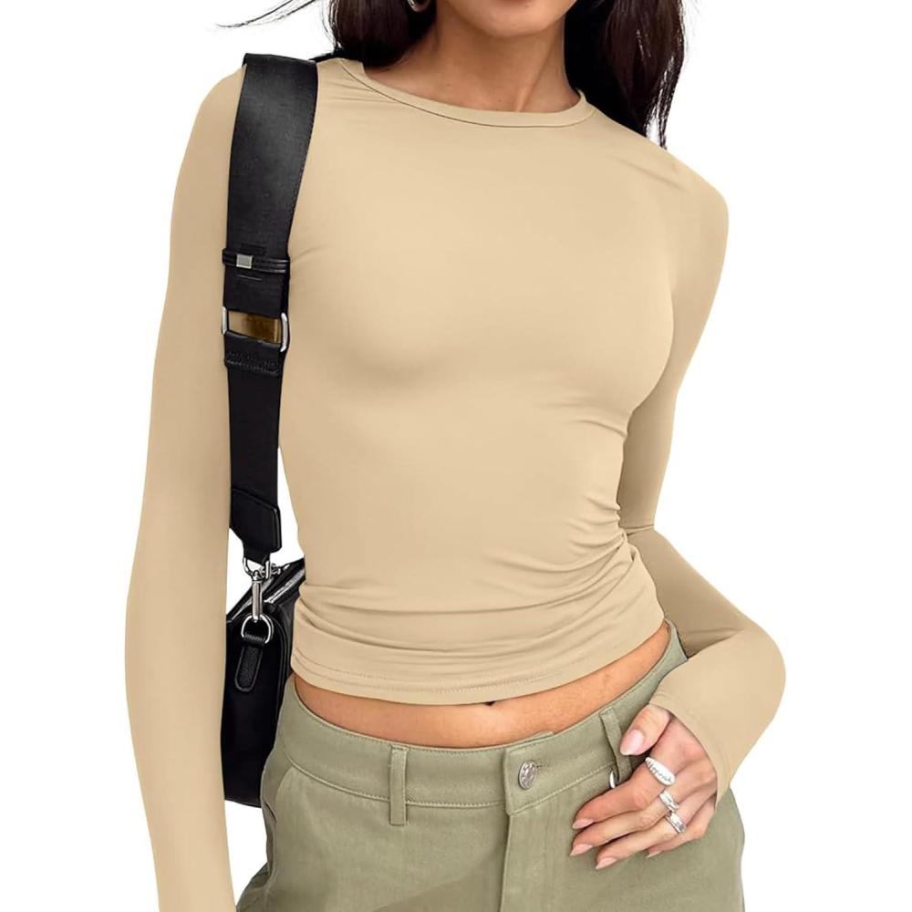 Don’t miss out on our limited-time offer: buy Trendy Queen Womens Long Sleeve T Shirts Fall Fashion 2025 Basic Crop Tops Going Out Outfits Y2k Clothes(Khaki), get {accessory} free!