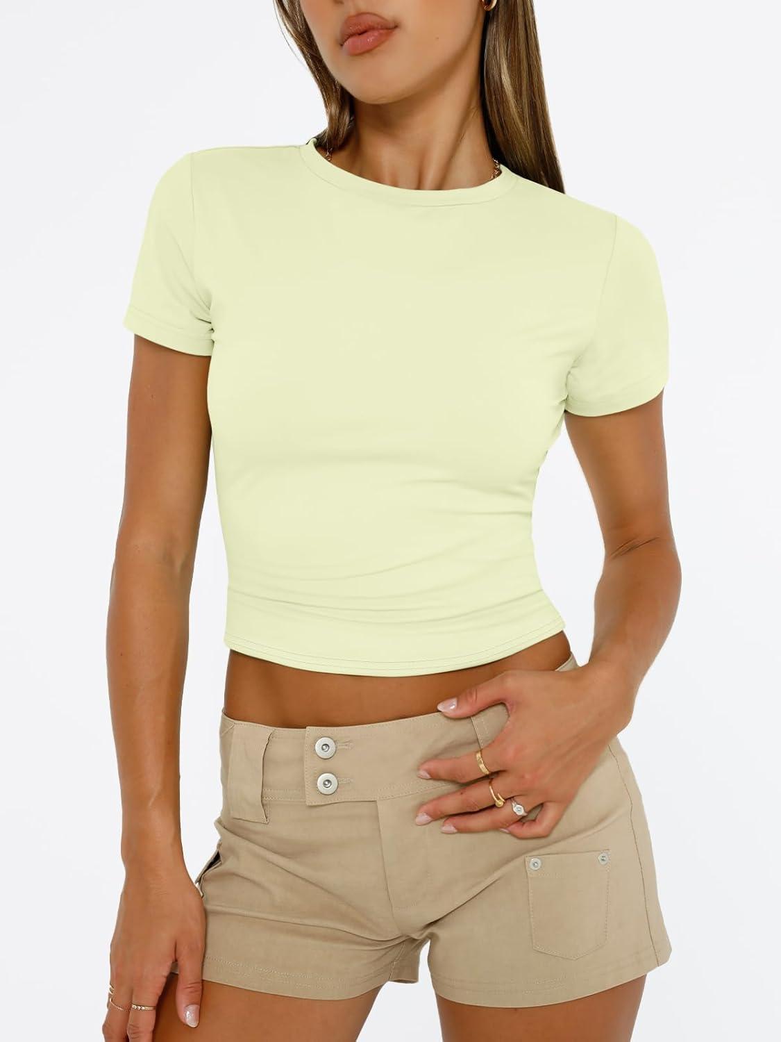 Trendy Queen Womens Short Sleeve T Shirts Summer Crop Tops Basic Slim Fit Gym Workout Y2k Clothes(Lemon Yellow)