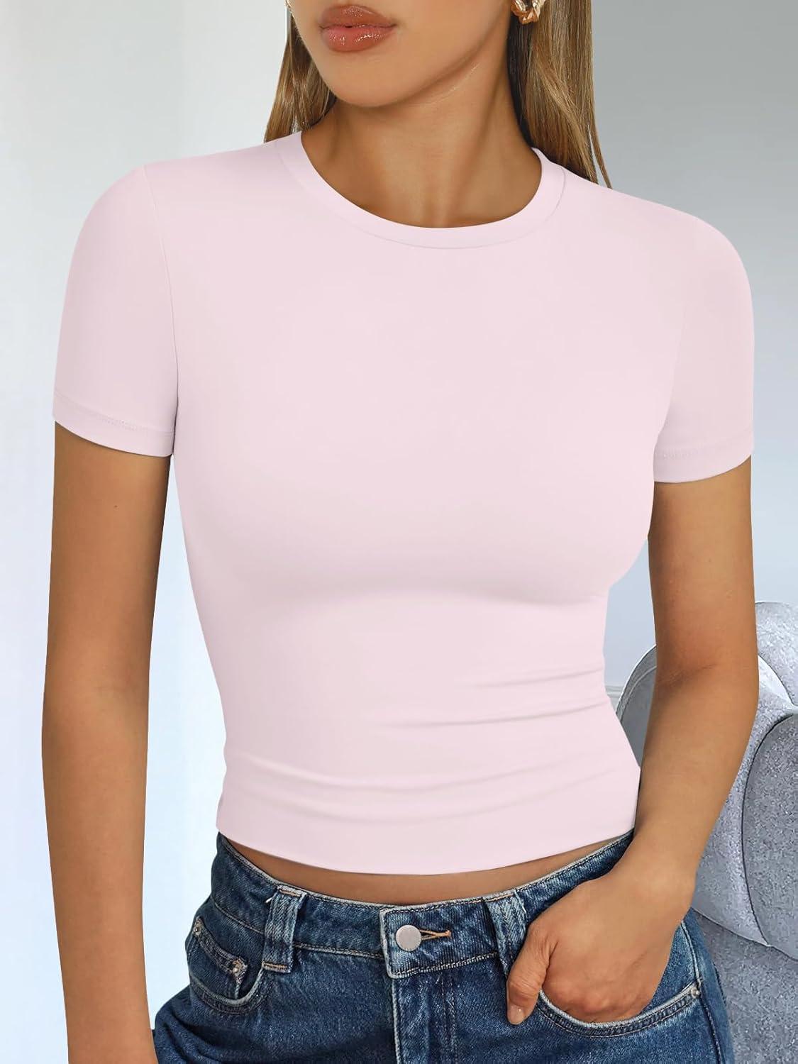 Trendy Queen Womens Short Sleeve T Shirts Summer Crop Tops Basic Slim Fit Gym Workout Y2k Clothes(Light Pink)