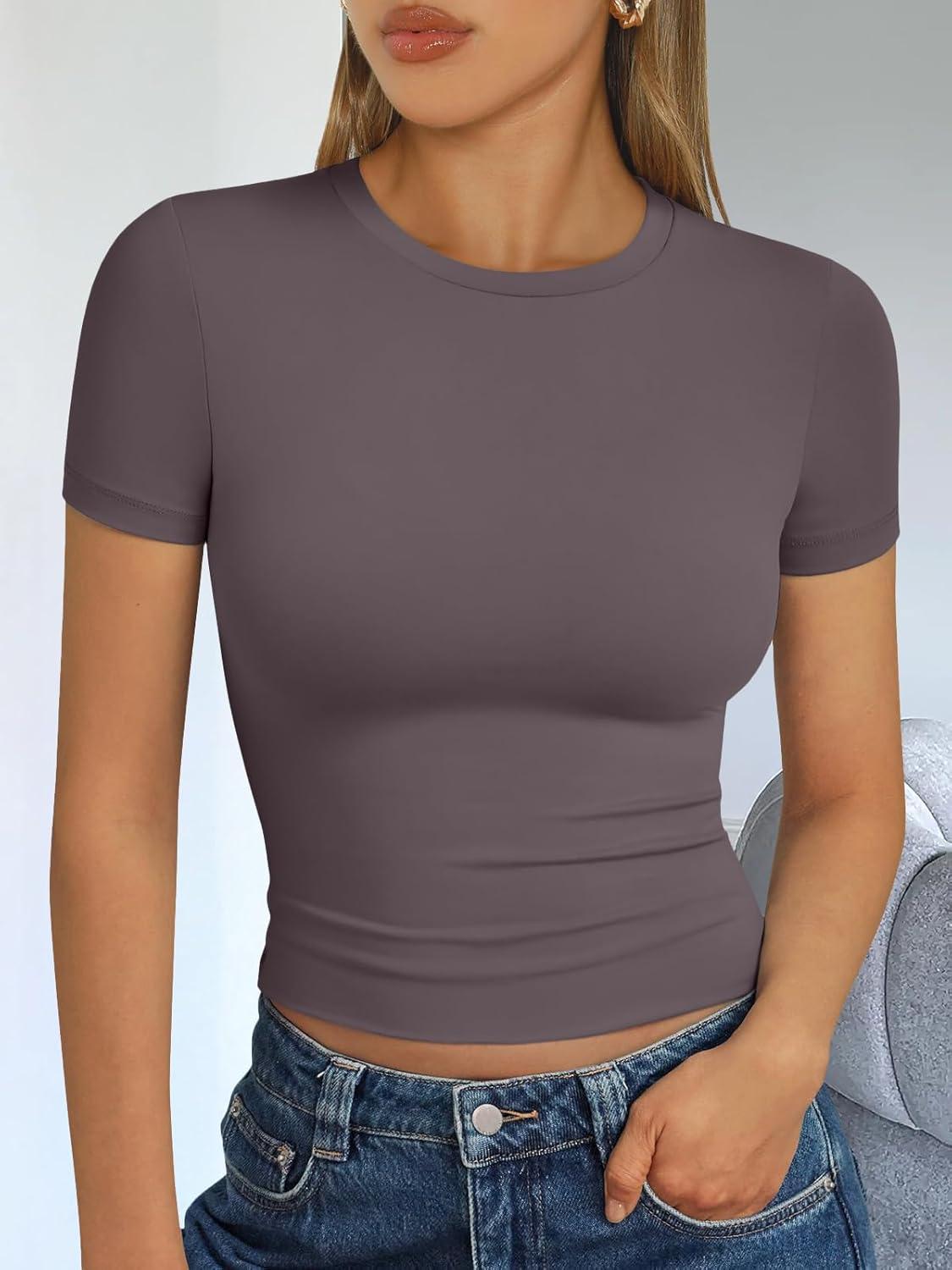 Trendy Queen Womens Short Sleeve T Shirts Summer Crop Tops Basic Slim Fit Gym Workout Y2k Clothes(Nutmeg)