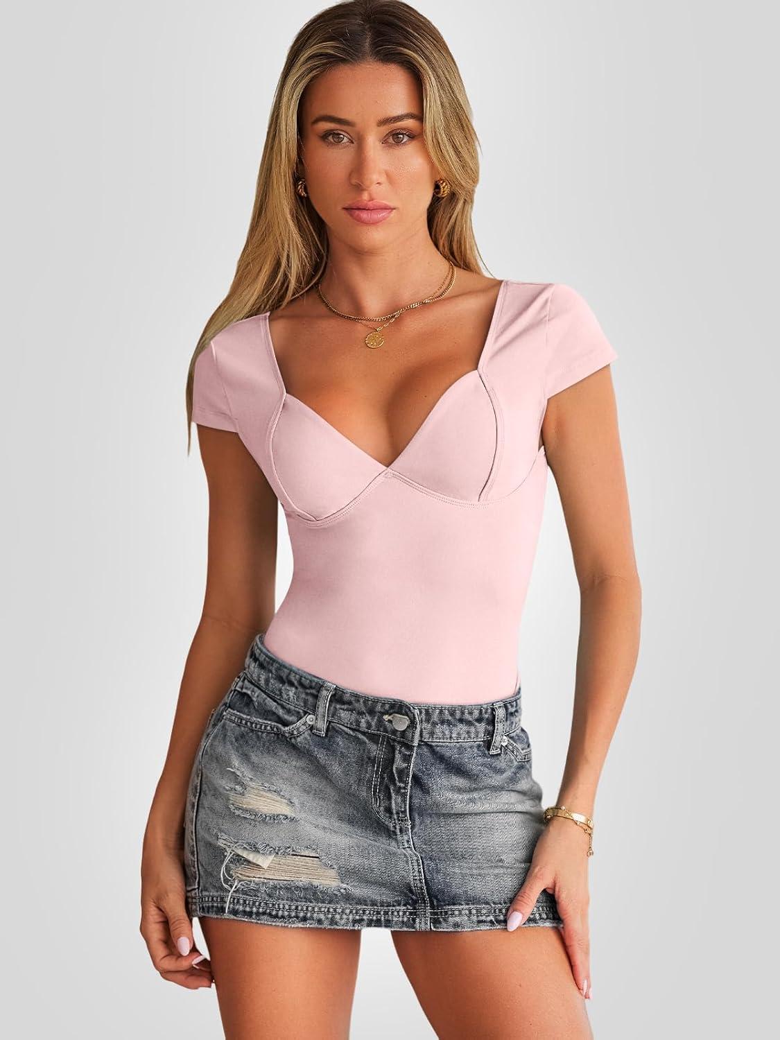 Trendy Queen Womens Summer V-Neck Backless Cute Tops Short Sleeve Sexy Slim Fit T-Shirts Y2K Clothes Corset Cami 2025(Baby Pink)