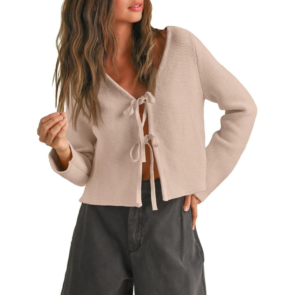 Trendy Queen Womens Tie Front Tops Fall Cardigan Sweaters 2025 Fashion Crochet Crop Vacation Clothes Cute Y2K Casual Outfits(Apricot)