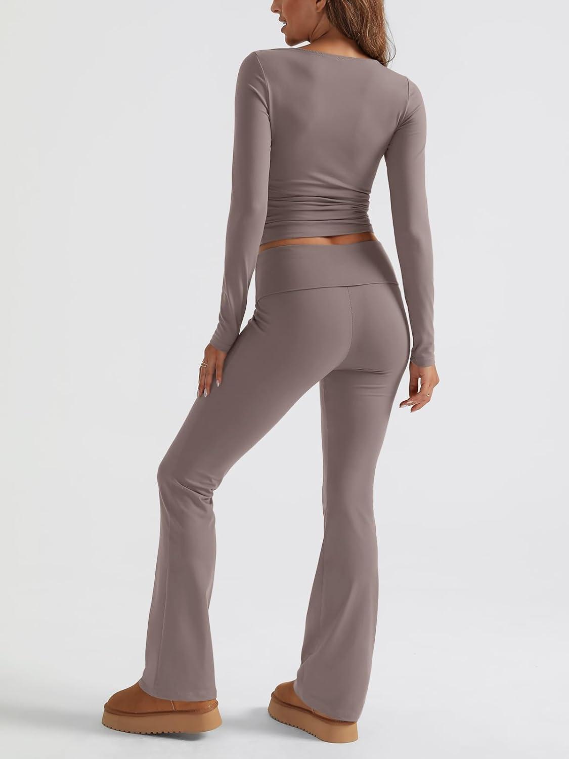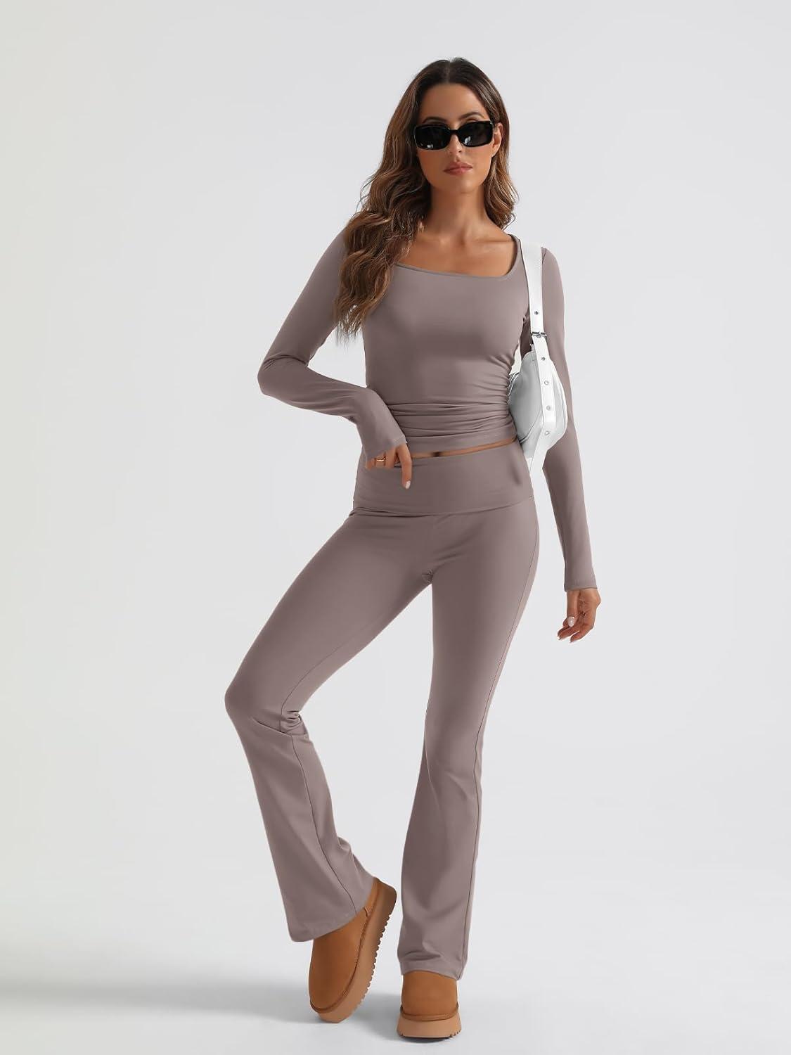 Trendy Queen Womens Workout Sets 2 Piece Fall Outfits Square Neck Tops Flare Pants Tracksuits Clothes Winter Fashion 2025(Coffeegrey)